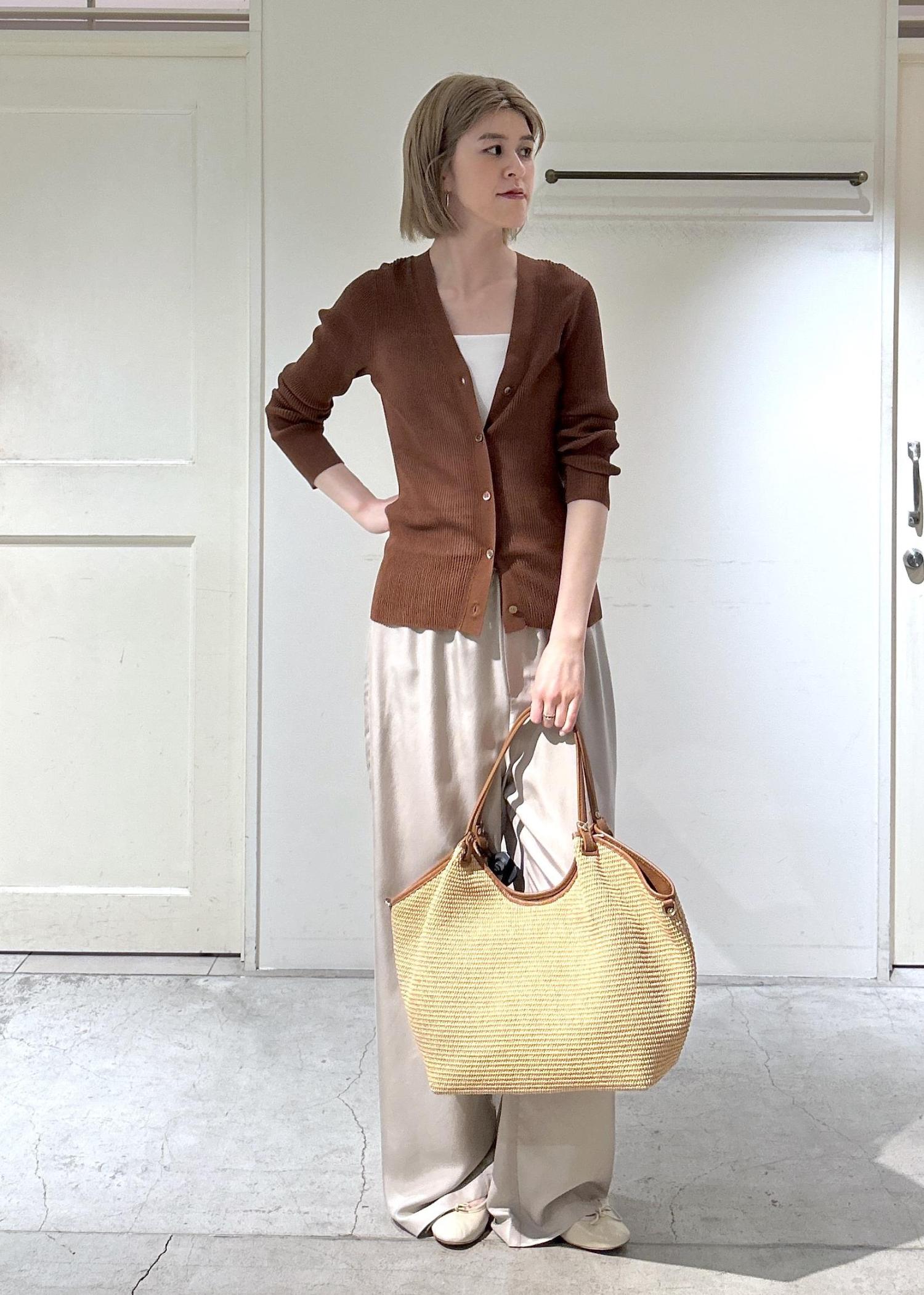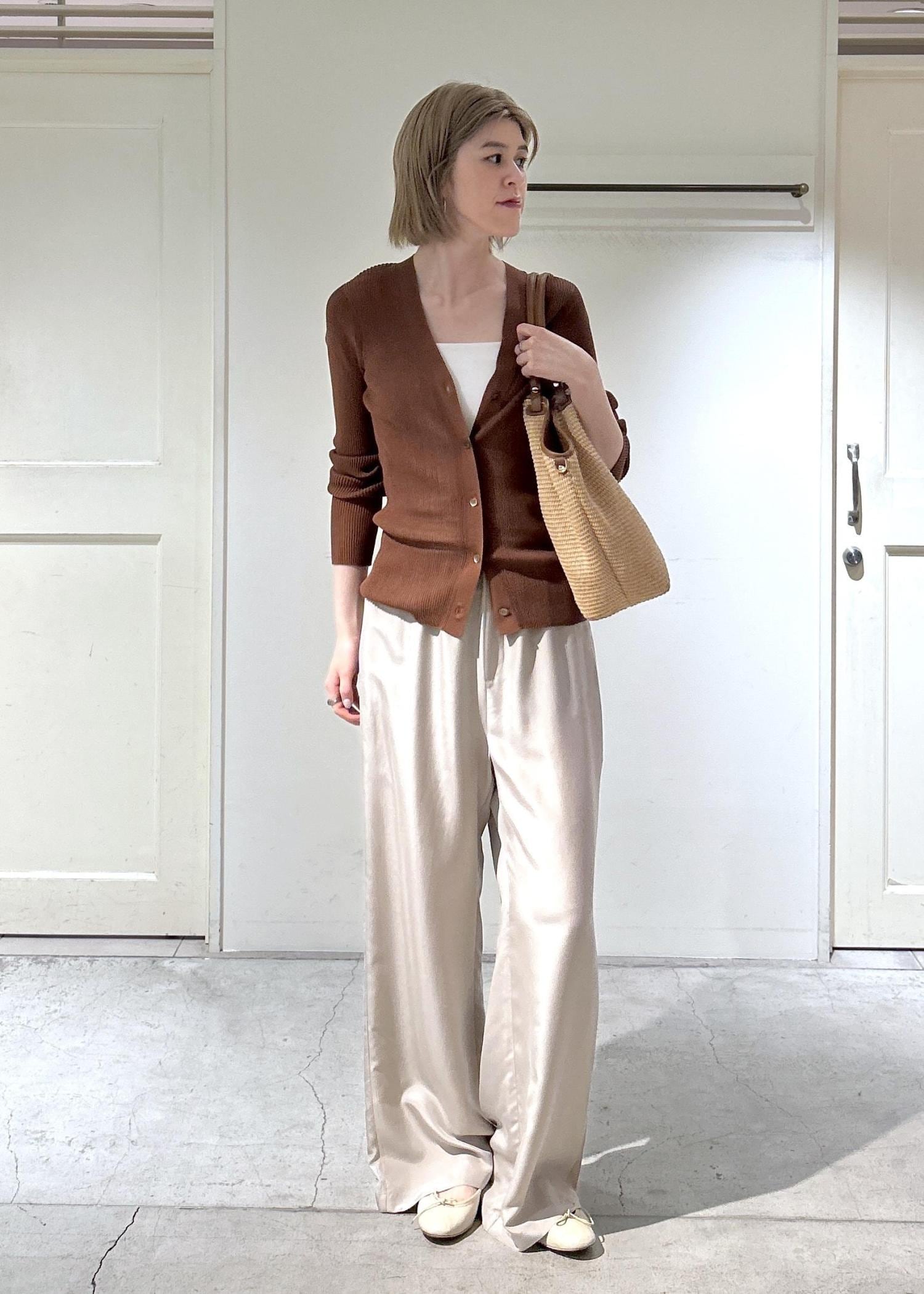 SALON adam et ropé【WEB限定】シアーリブニットVネックカーディガンブラウン / F¥17,600レビュー身長171cmで、お尻にかかるくらいの丈の長さです。タイトめなサイズ感なのでラインは拾いますが、ストレッチ性があるので、窮屈さはありません。生地は薄手のニット素材で冷房対策にもピッタリです。