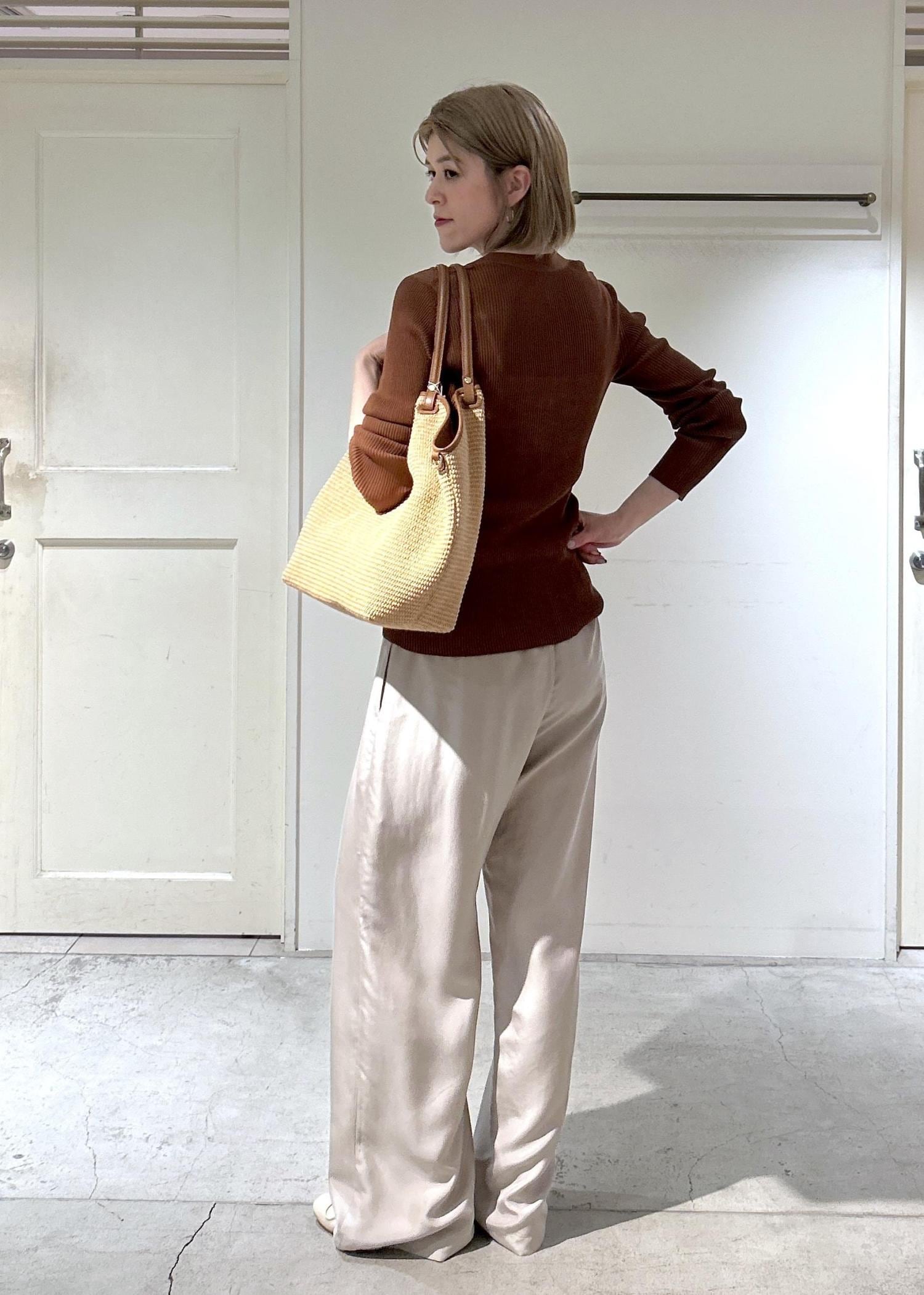 SALON adam et ropé[26SS]GENTLE SILK パンツ / セットアップ対応・洗えるベージュ系 / M¥31,900レビュー身長171cmで、丈は踵につくくらいの長さです。ゆったりめのつくりなので体のラインを拾いません。オールゴムでウエストは紐がついているので、楽に履けます◎シルクで落ち感のある素材なので上品に着こなせます。