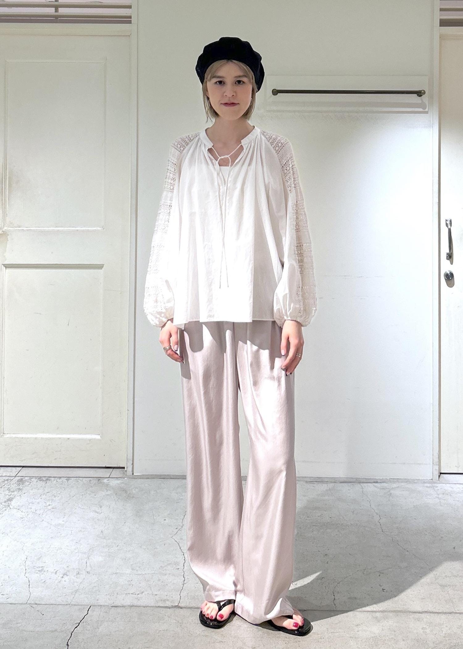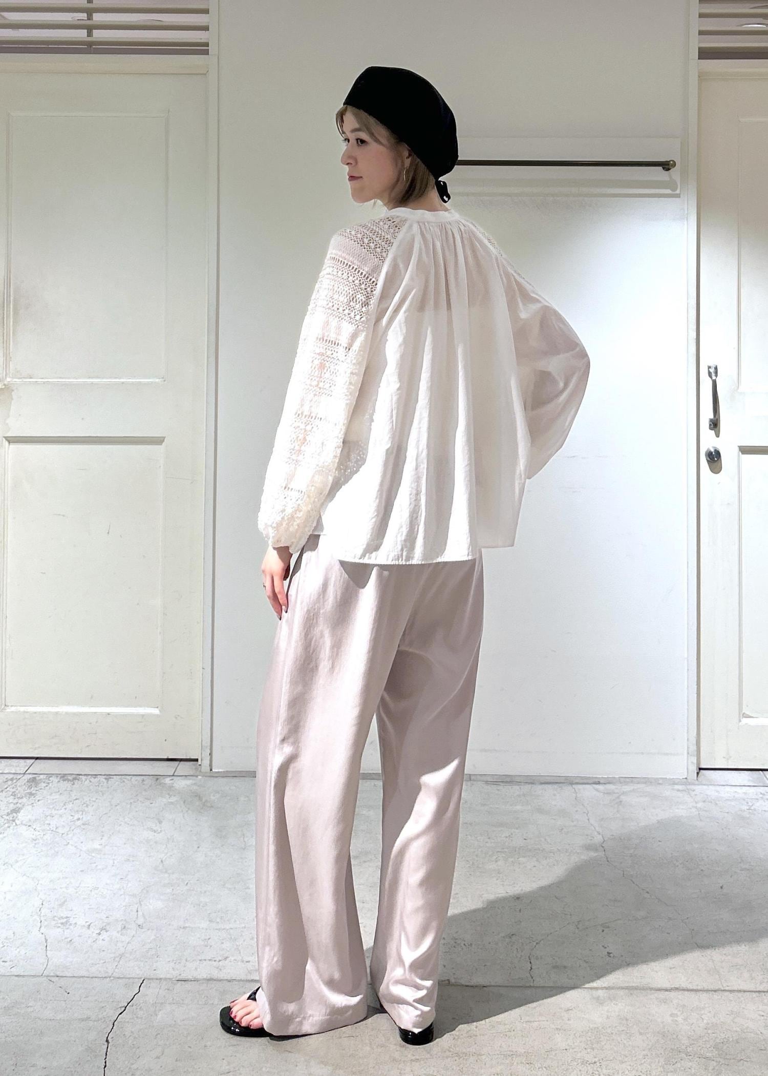WEB限定のレースアクセントブラウスのご紹介です。袖部分のレースや首元のギャザー、袖部分のボリューム感がかわいいです。