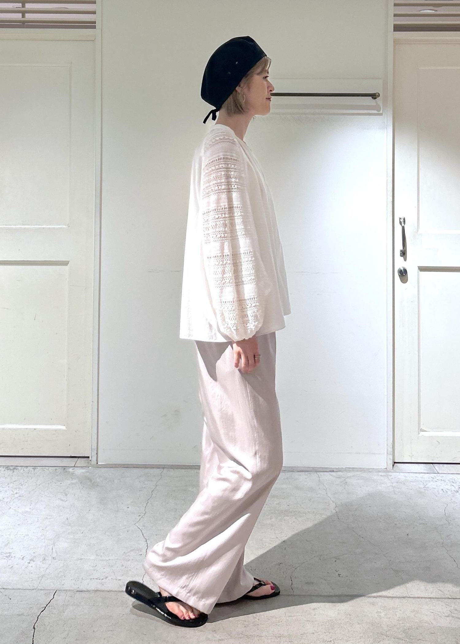 今回はツヤ感のあるパンツと合わせてみました。足元は夏を意識して、サンダルで合わせてみました。