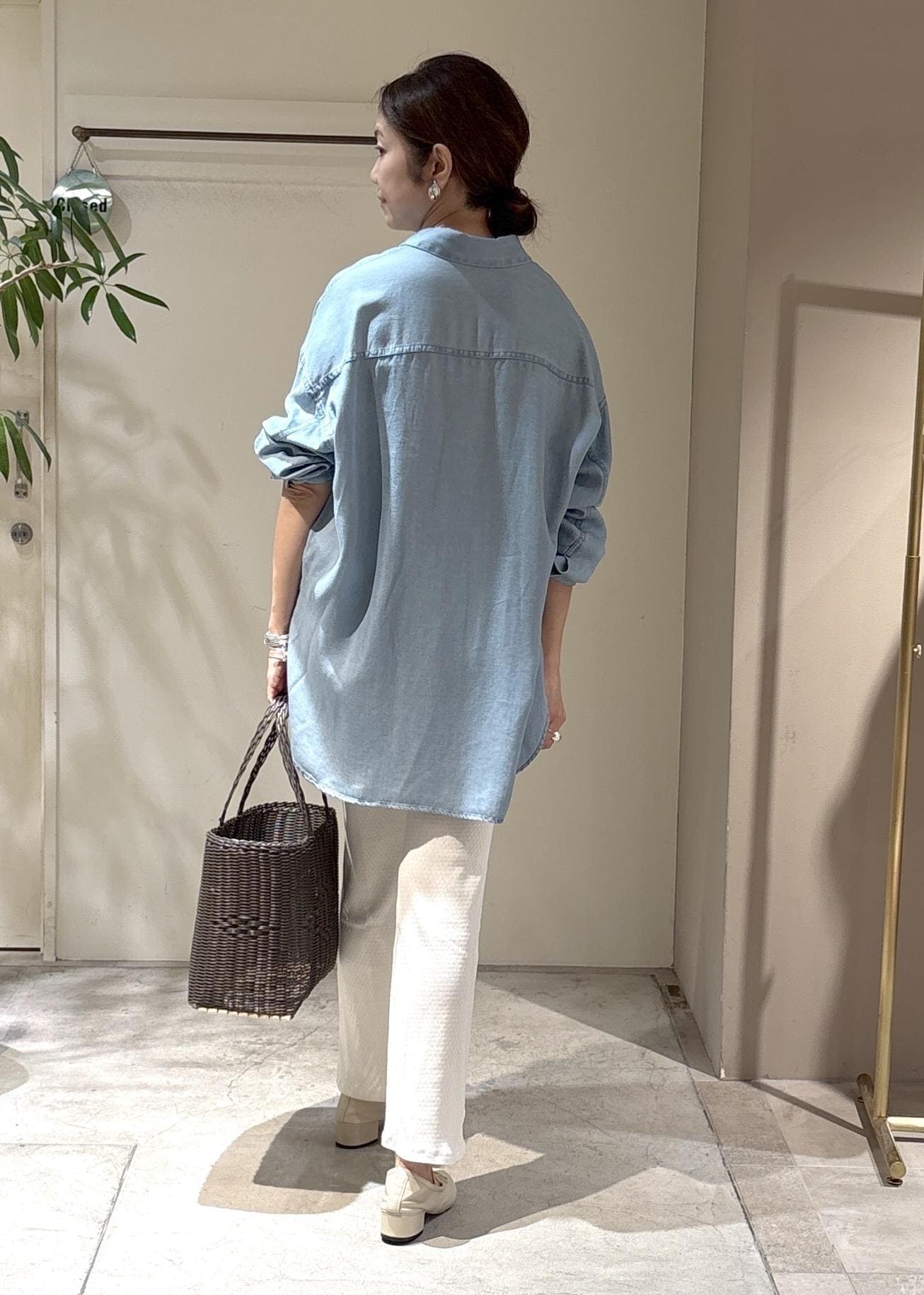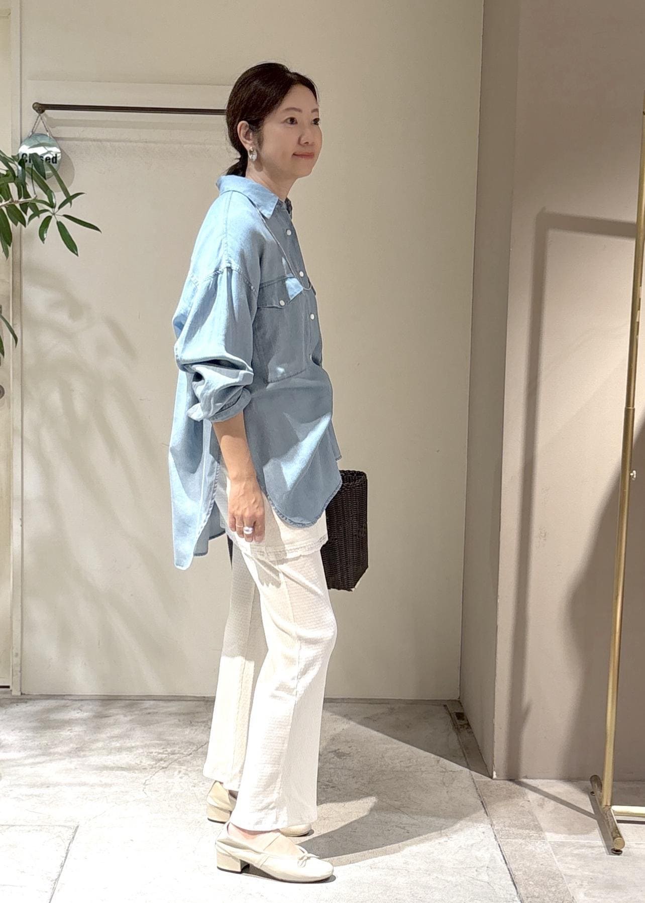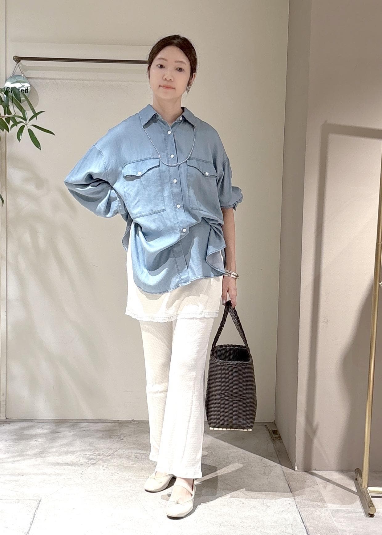 この柔らかいオーナーシャツにレギンスパンツを合わせました。