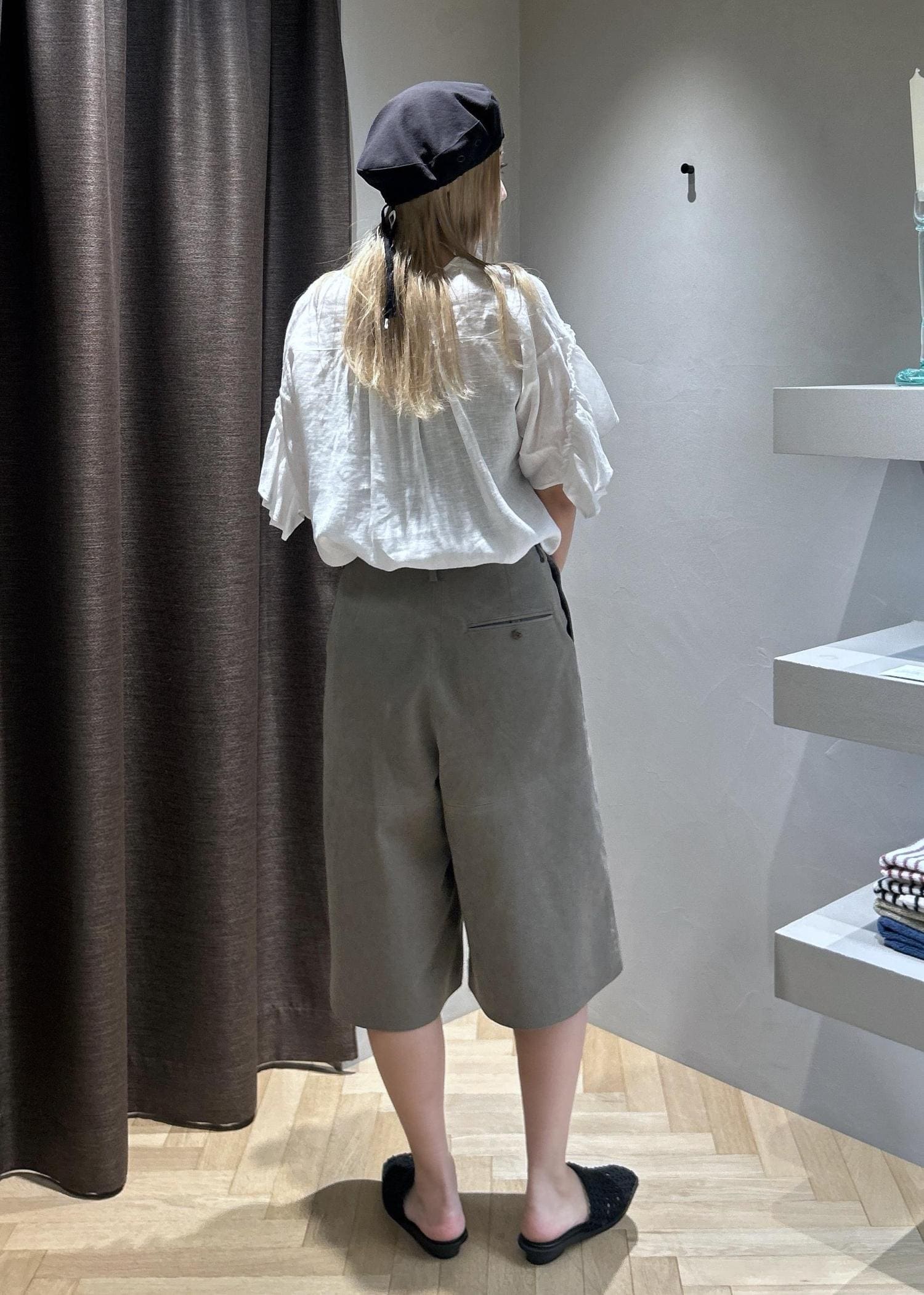 ホワイトで少し甘めのフリルブラウスに、カーキのハーフパンツを合わせることでガーリーになりすぎないように意識しました。