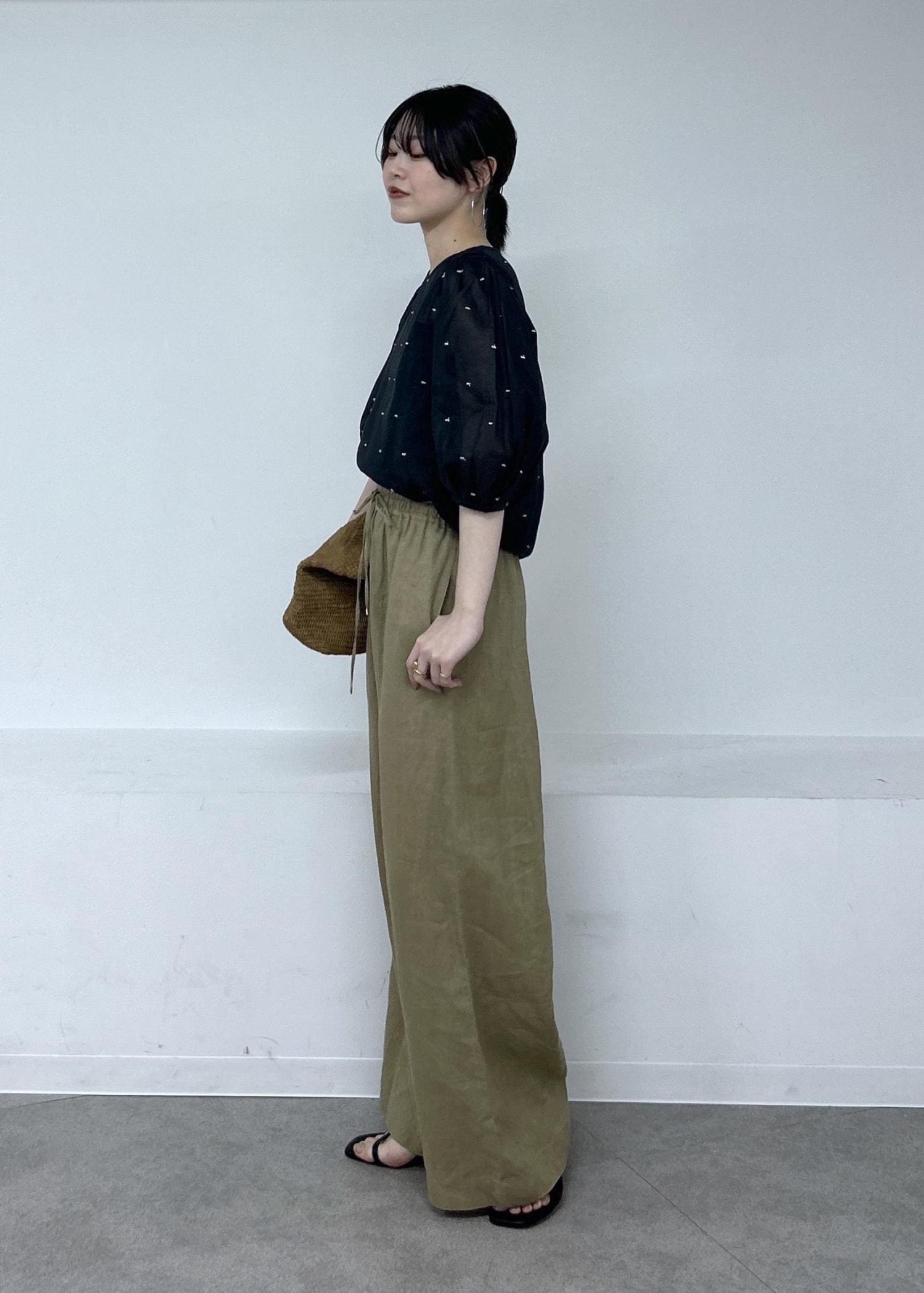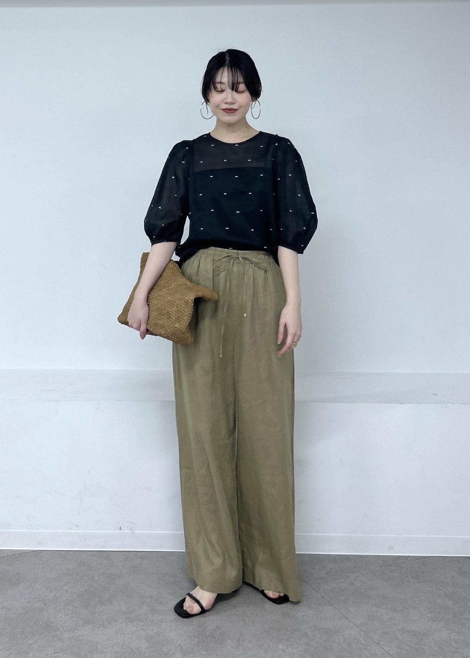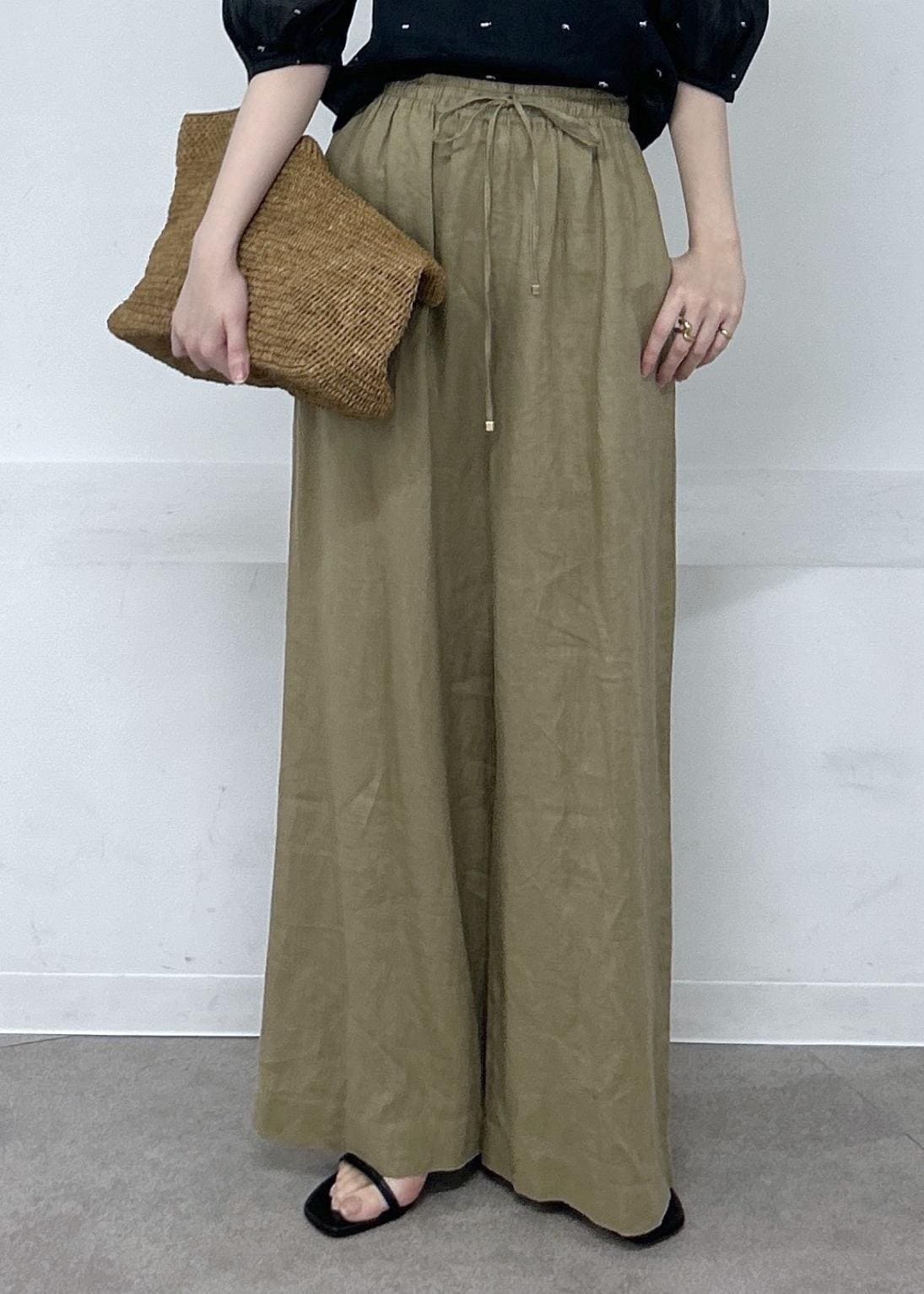 私はリネンのリラックスパンツと合わせて女性らしさのあるラフなスタイルを組みました。
