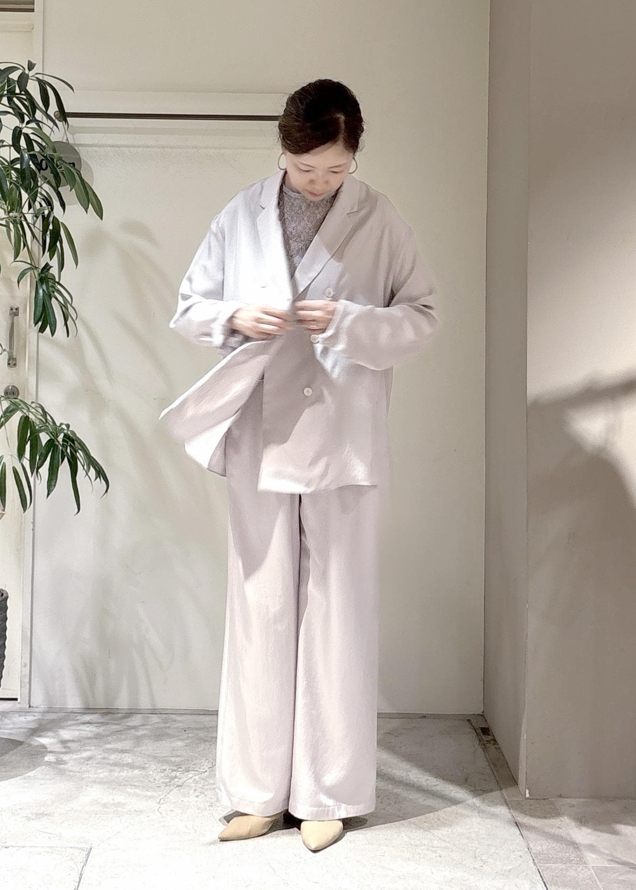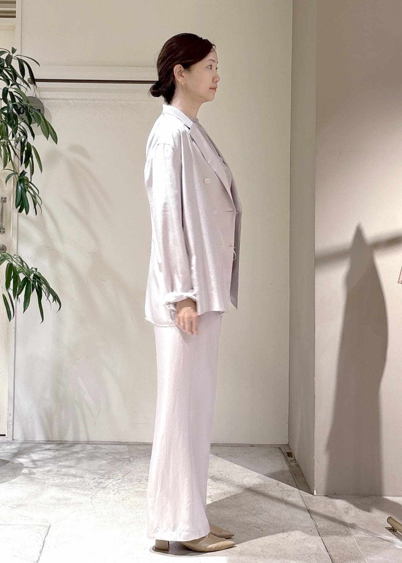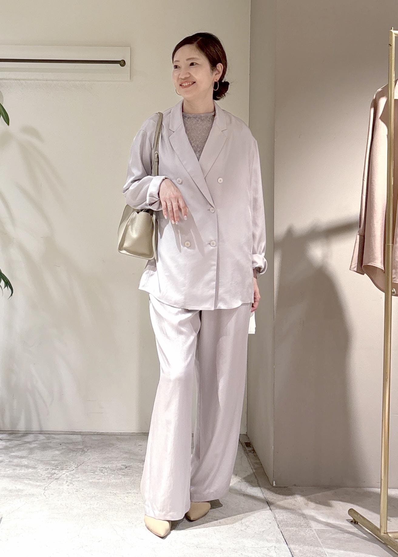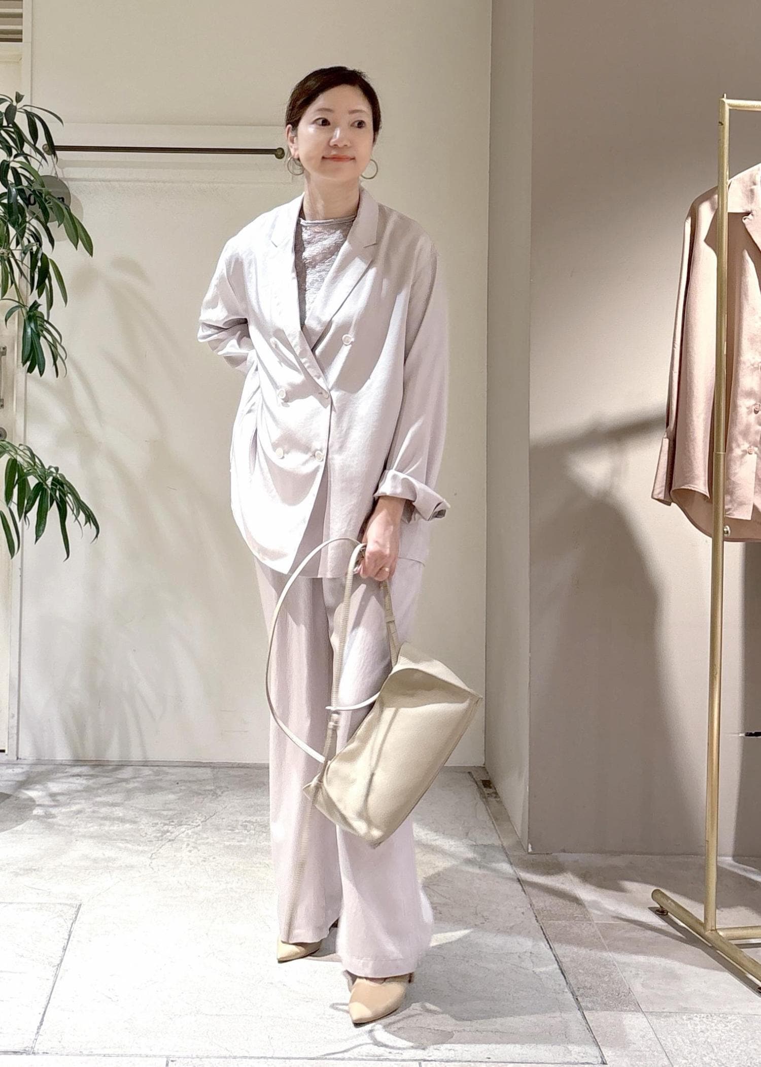 淡いトーンでまとめた、やわらかなセットアップ。