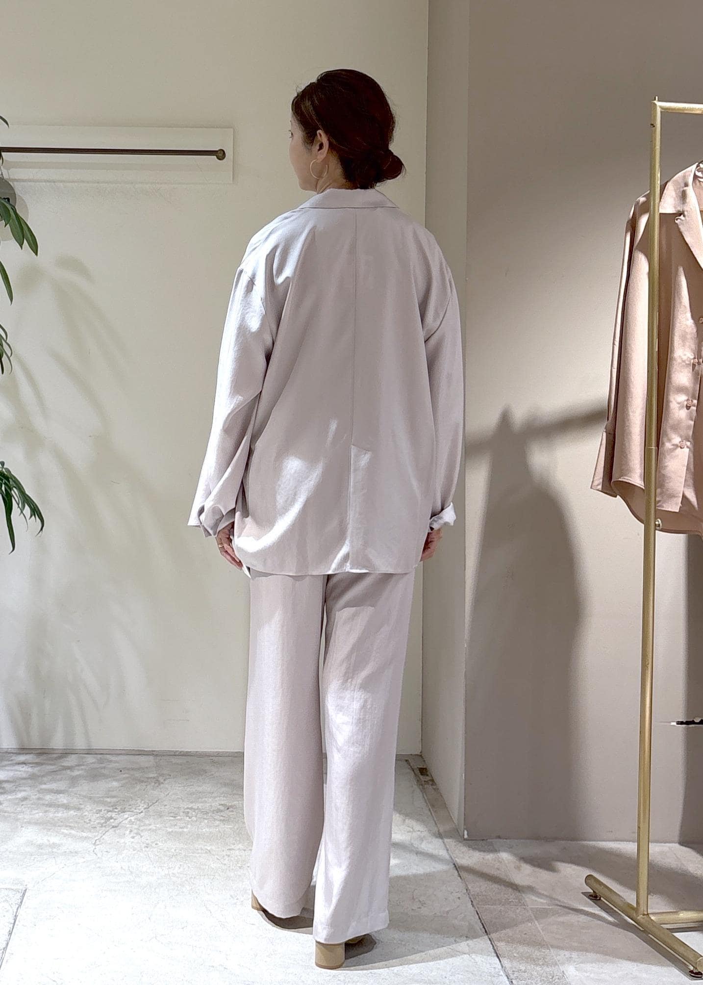 SALON adam et ropéアセテートツイルダブルジャケット / セットアップ対応ベージュ系 / F¥35,200レビュー普通体型ですが、ドロップショルダーでオーバーサイズ気味。ゆったりと着ていただく事で抜け感が出ます。シワになりにくく、とても軽いのでカーディガンのようにバッグに忍ばせても◎