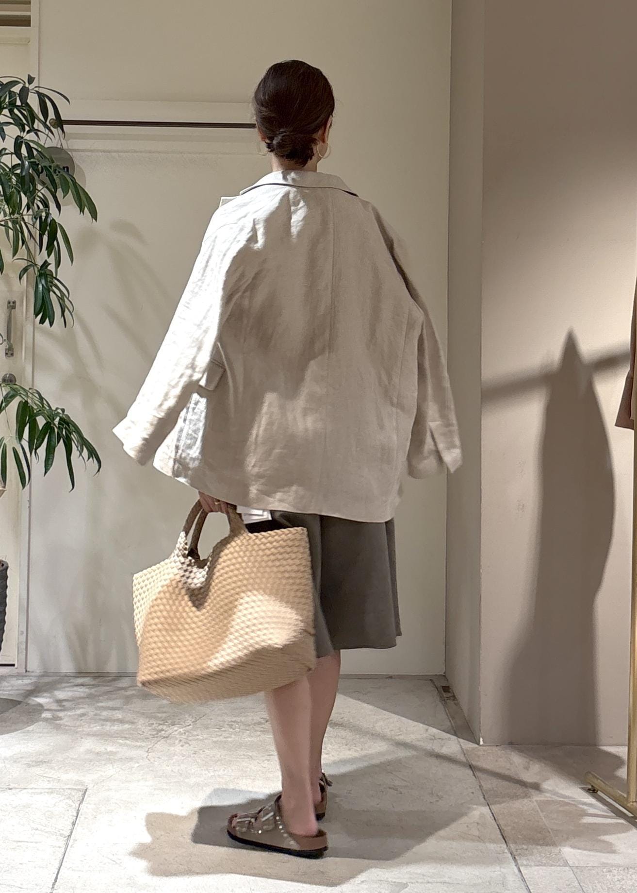 ドロップショルダーでややオーバーサイズです。SとMでは胸周りが一番サイズ感が違います。ぜひ店頭でお試しを。ヒップは隠れる丈で、ワンピースの羽織としても素敵です。