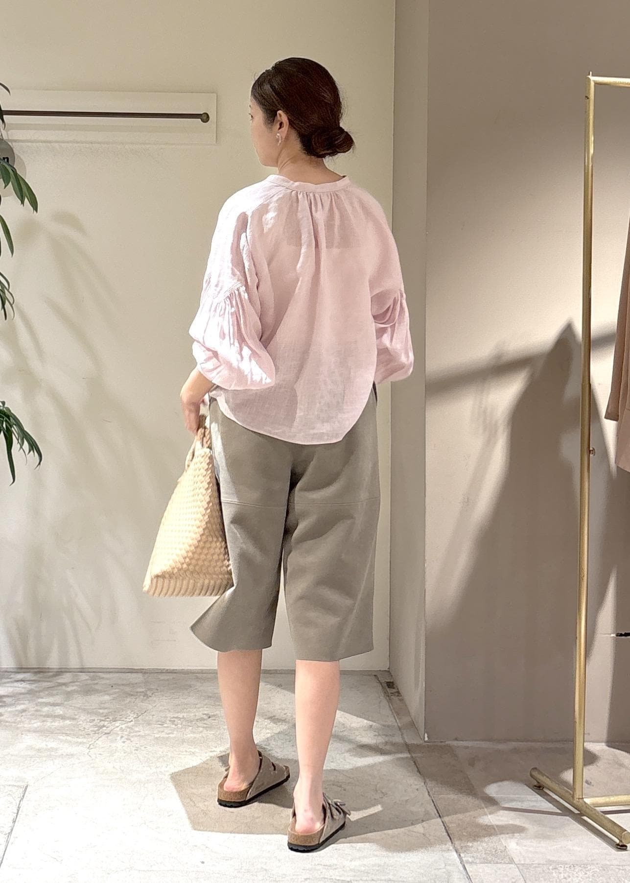 SALON adam et ropéリネンスキッパーギャザーブラウス / GENTLE LINEN 新色追加ピンク / F¥22,000レビューウエスト位の着丈です。肩のギャザーが華奢みえします。また袖を肘まで上げる事で大人も着れるボリューム袖になります。