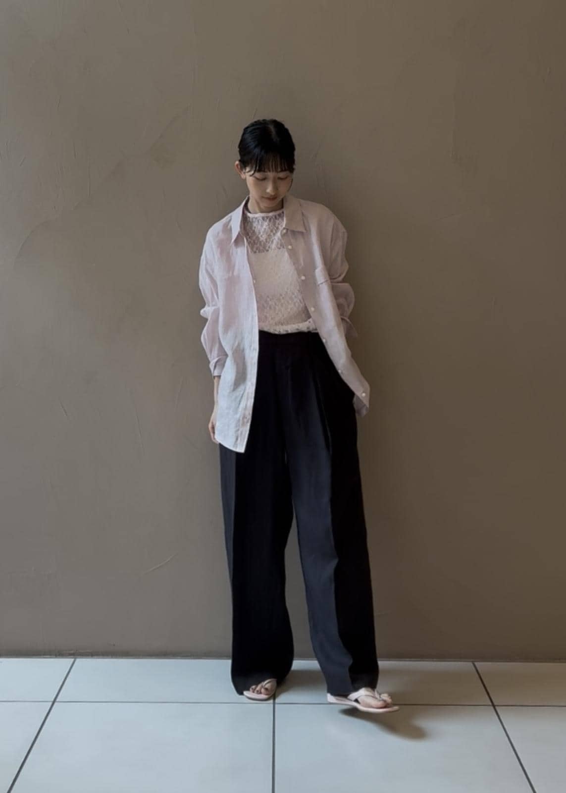 リネンシャツ、レースTシャツ、ビーチサンダル