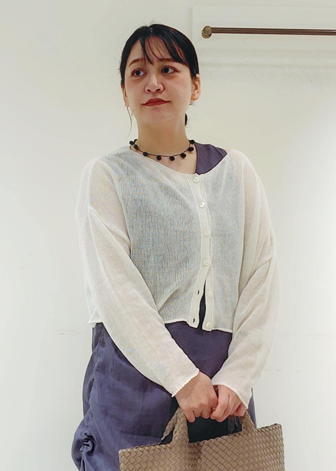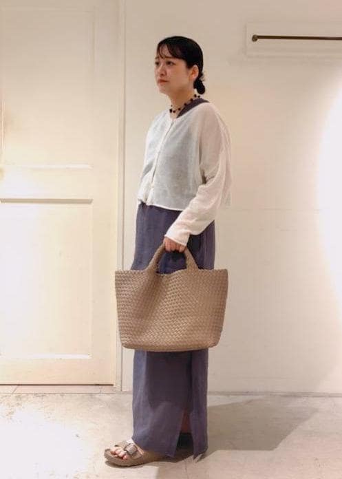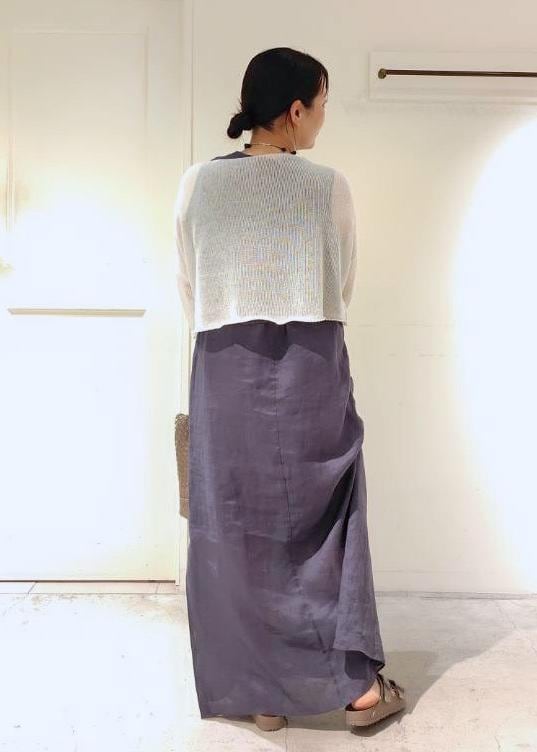 リネンのノースリーブワンピースに、丈の短いサマーニットを合わせバランスよく着れるように意識しました。