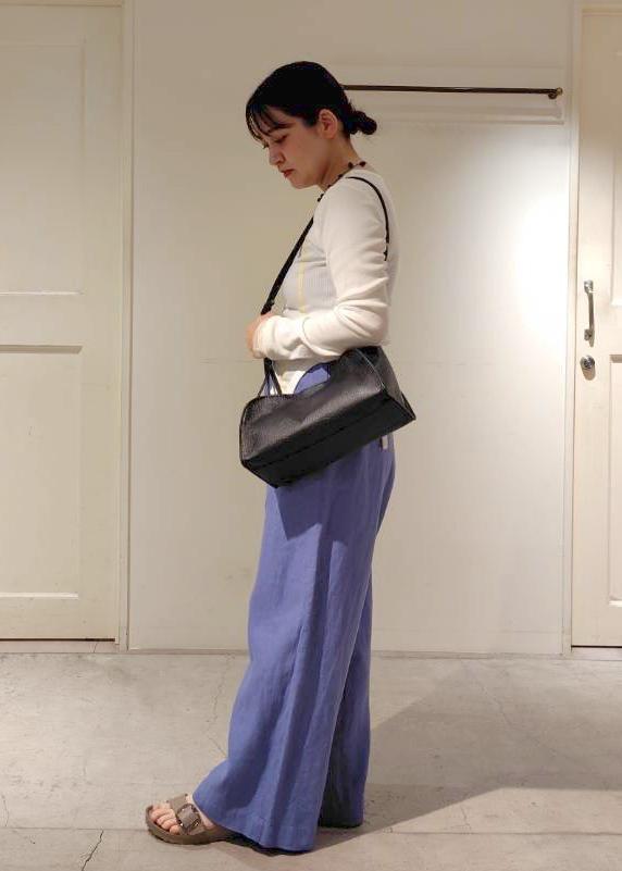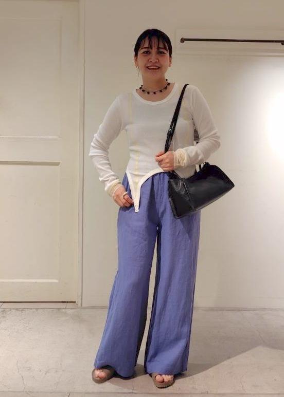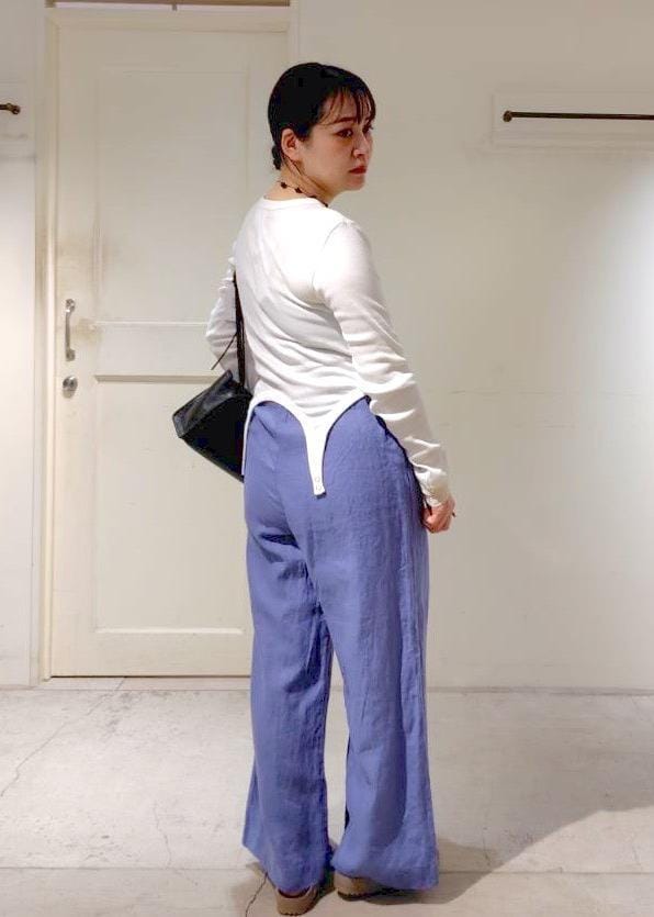 サラッとしたリネン素材が心地よく、初夏を思わせる鮮やかなブルーのパンツをメインにしました。