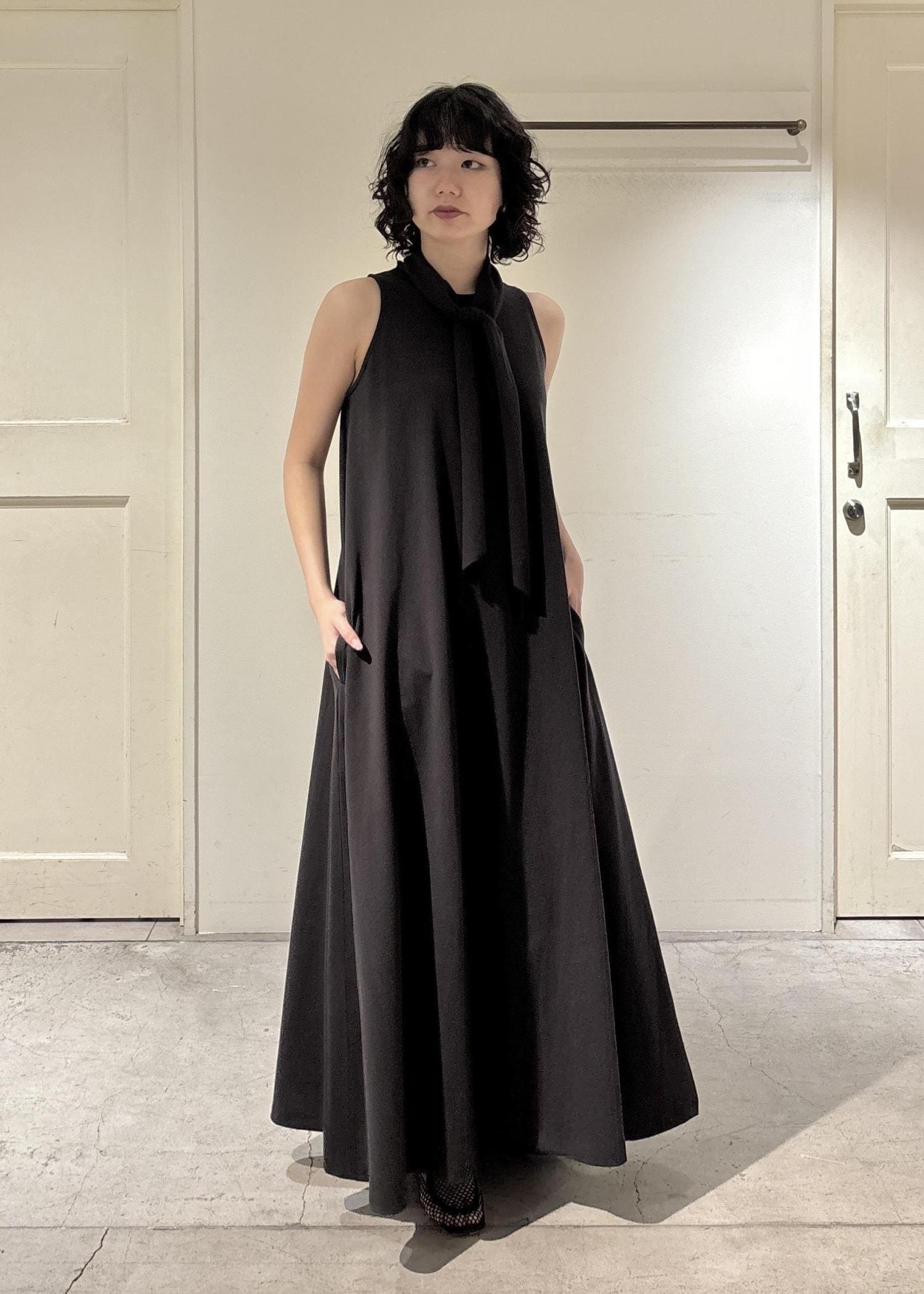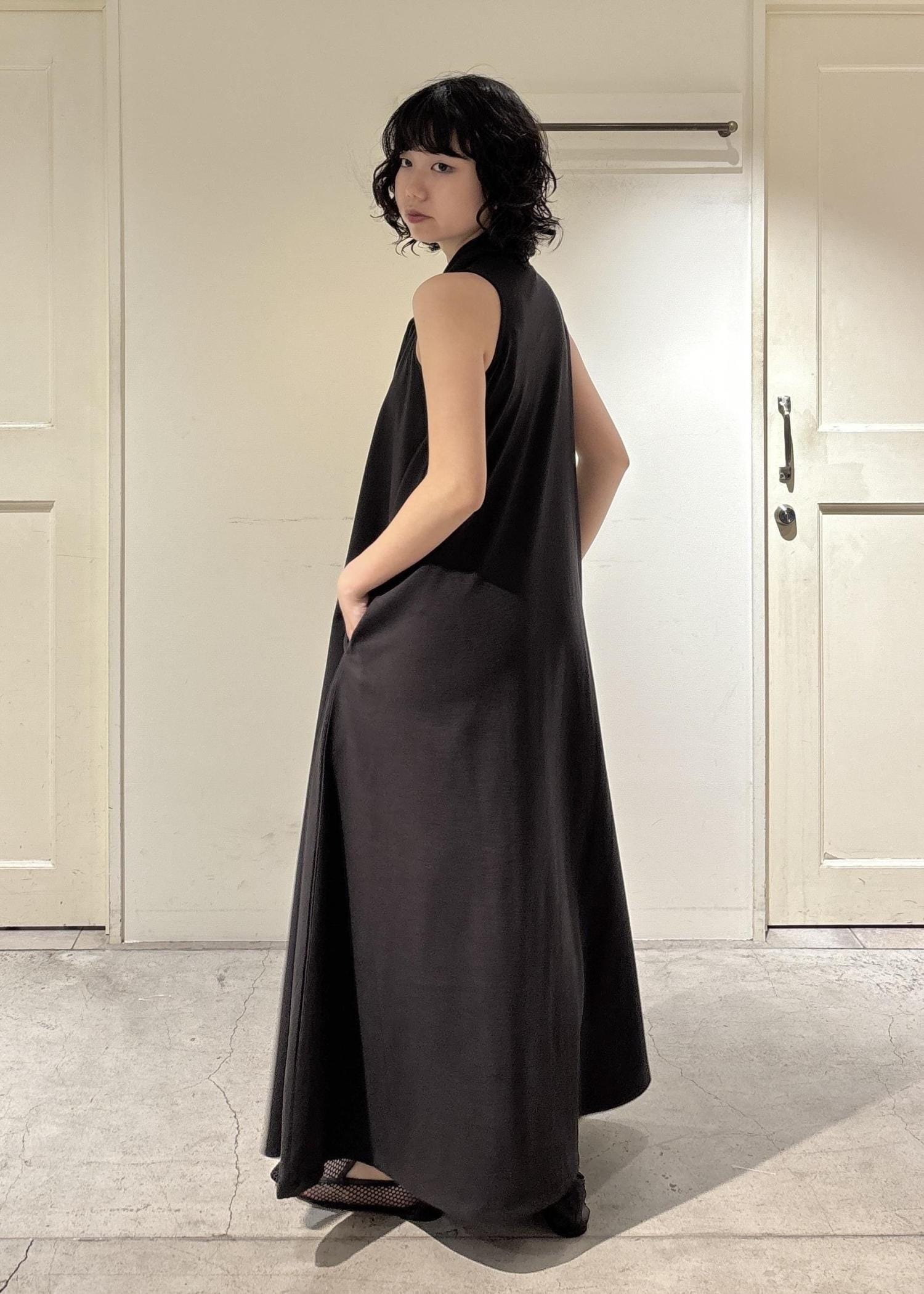 コンパクトなノースリーブのシルエットと、下半身に掛けて布感たっぷりのドレープがとても綺麗なデザインのワンピースです。