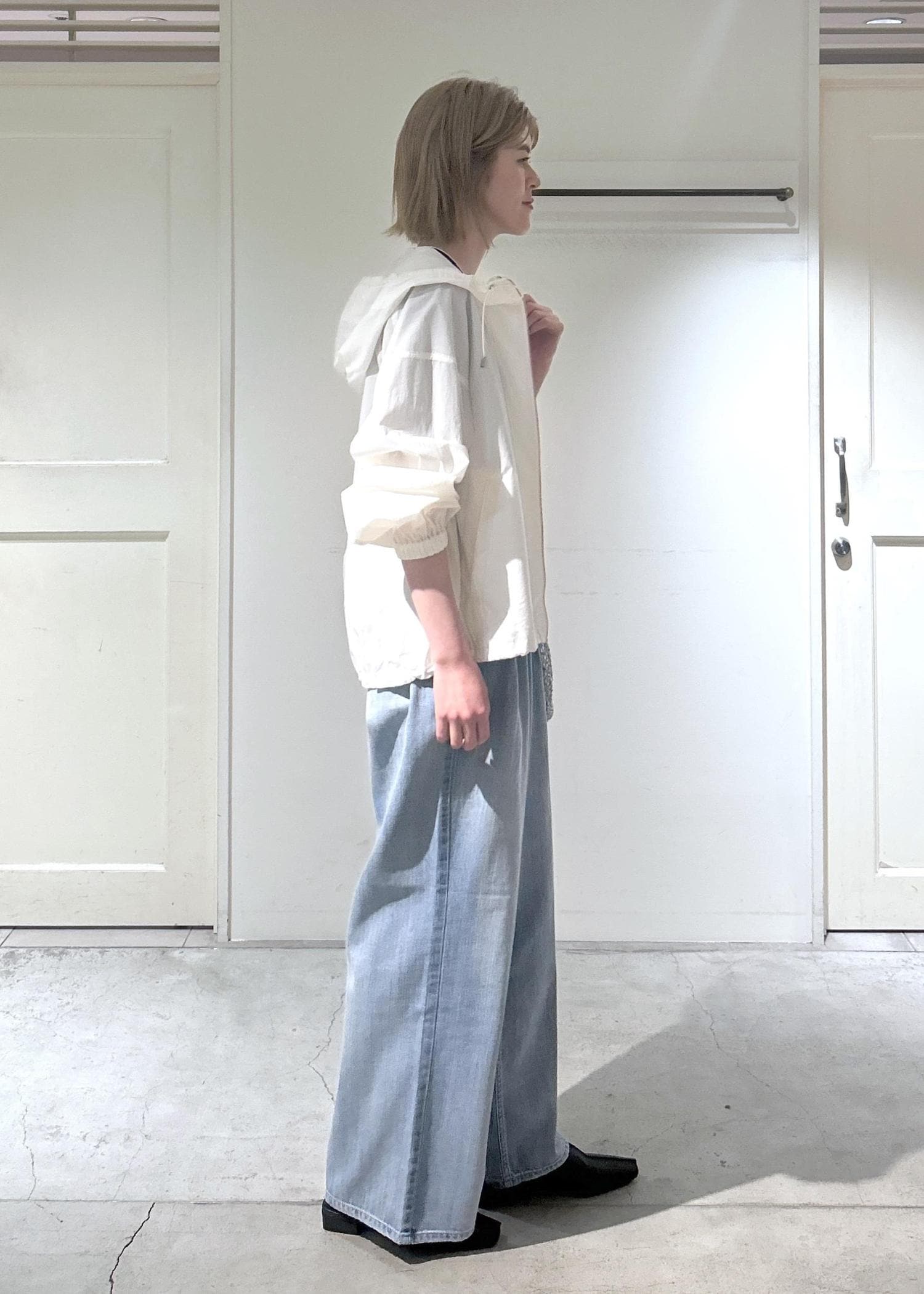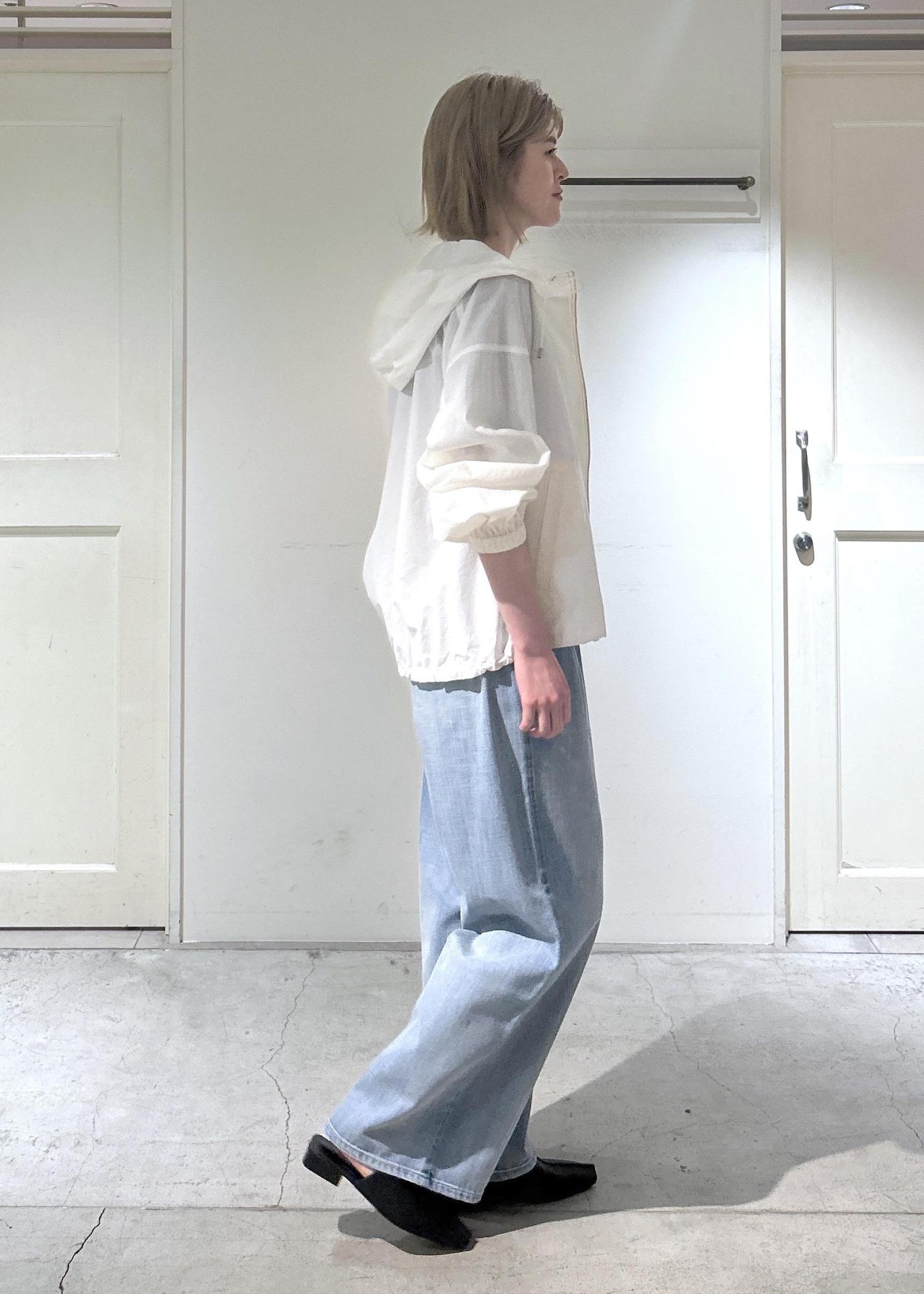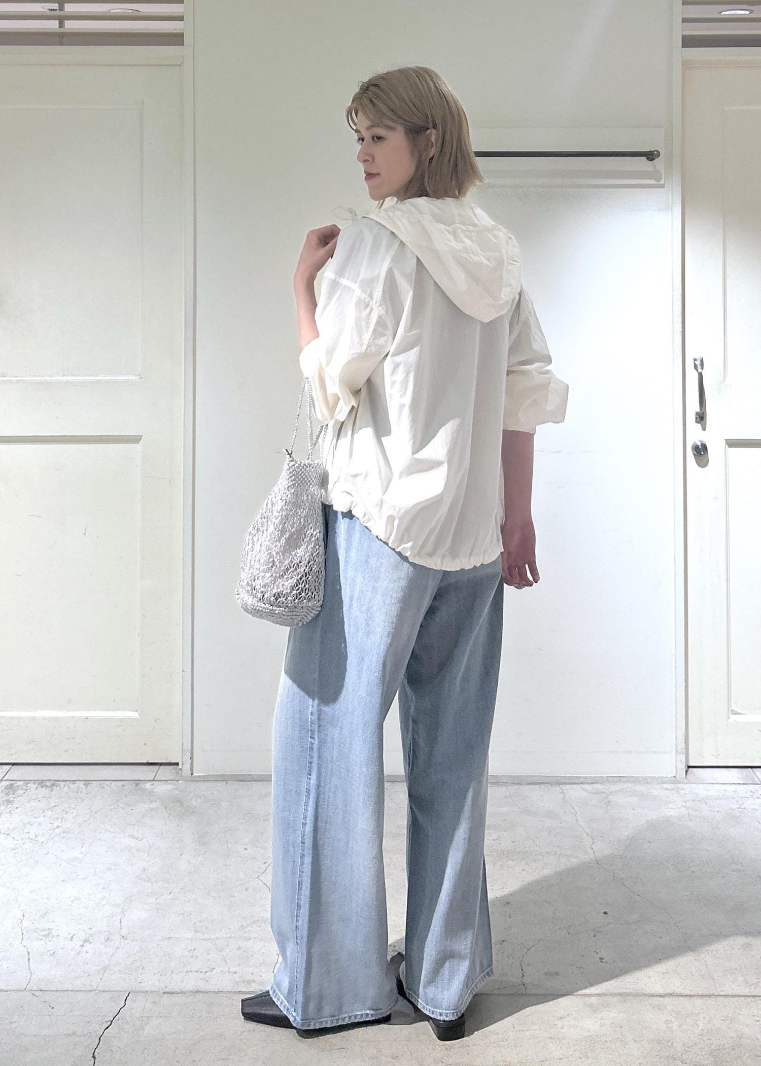 SALON adam et ropéコーティングフーディーブルゾン / セットアップ対応ホワイト / F¥38,500レビュー身長171cmで、腰骨が隠れるくらいの丈の長さ。ドロストで裾が絞れます。肌寒い時に羽織れるライトアウターです。程よくハリ感のあるコットンの軽い素材です。フードがついていてもカジュアルになりすぎず、キレイめに着られます。