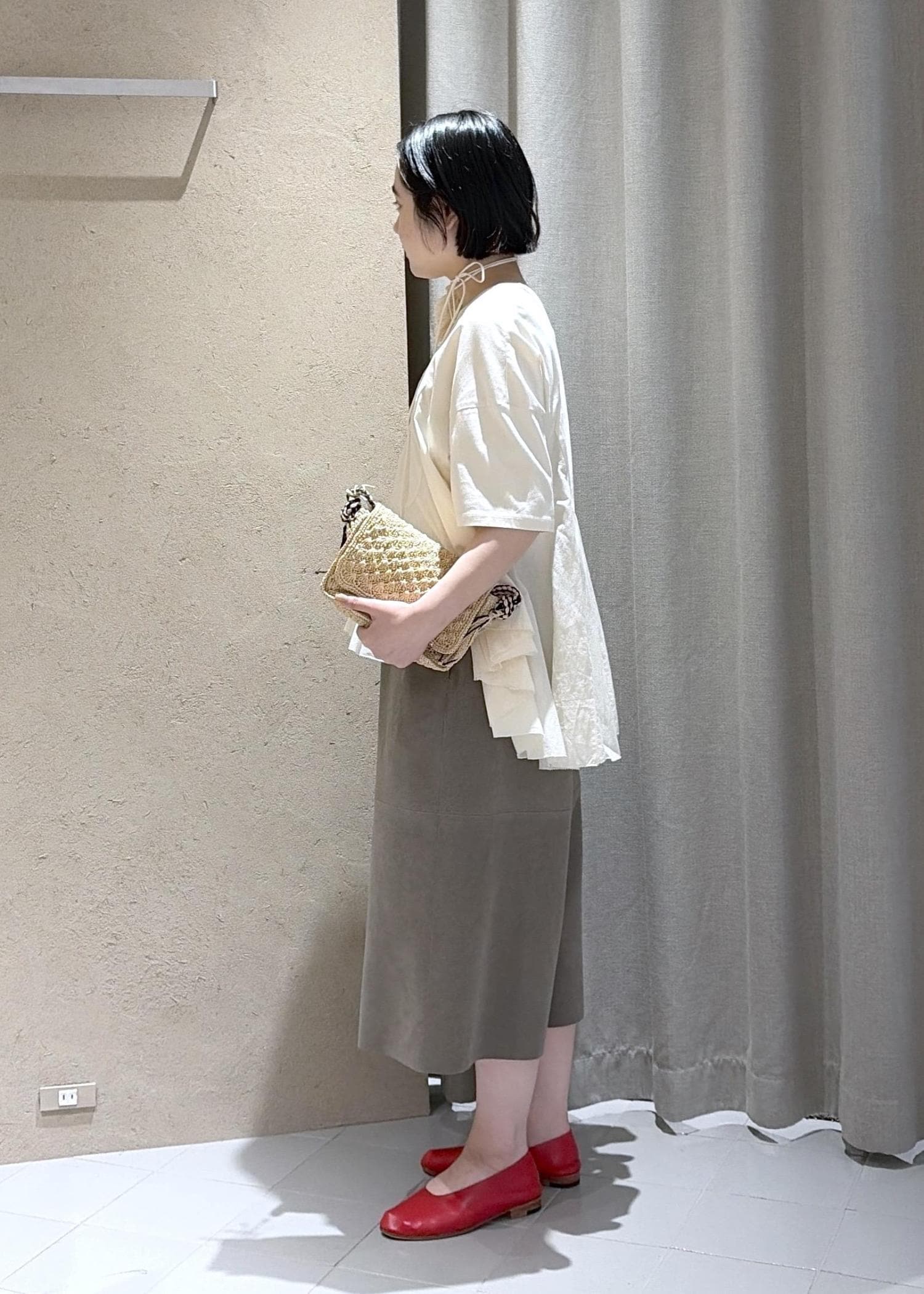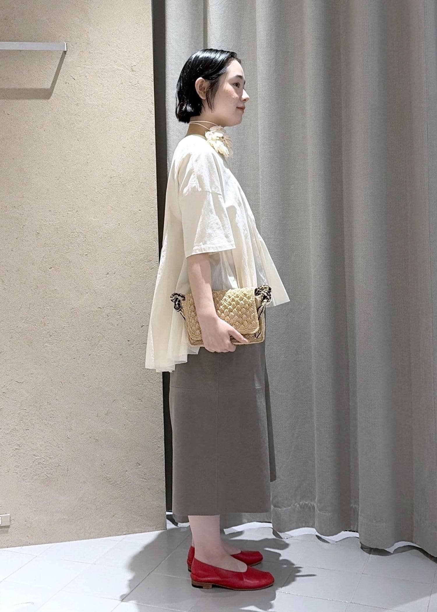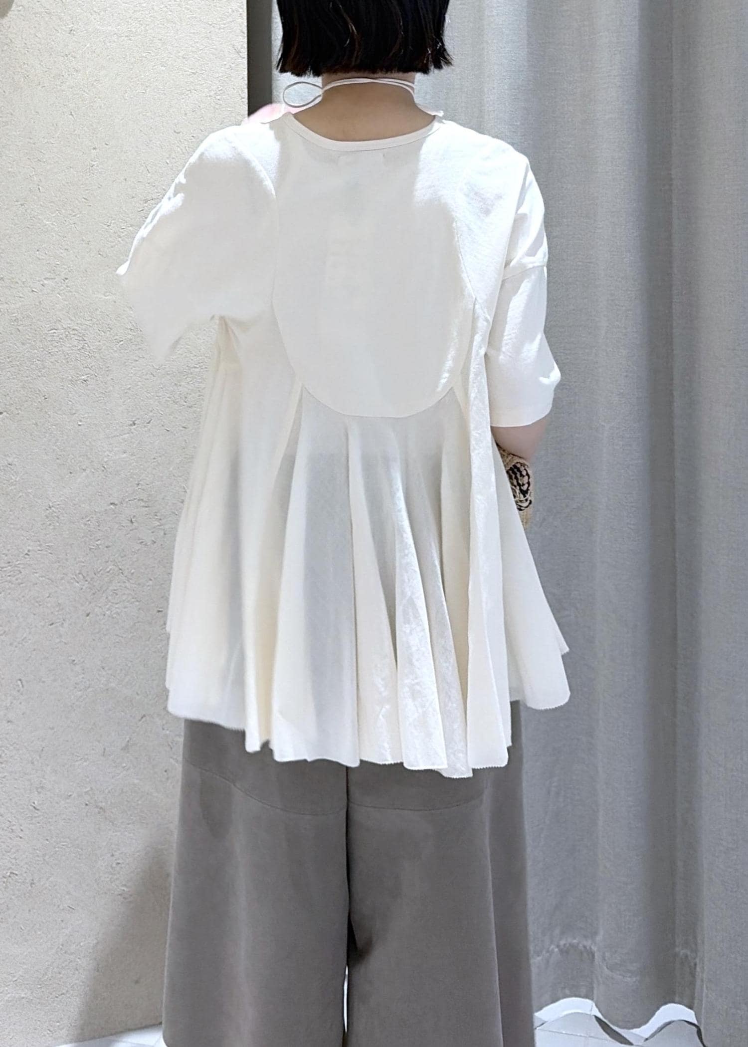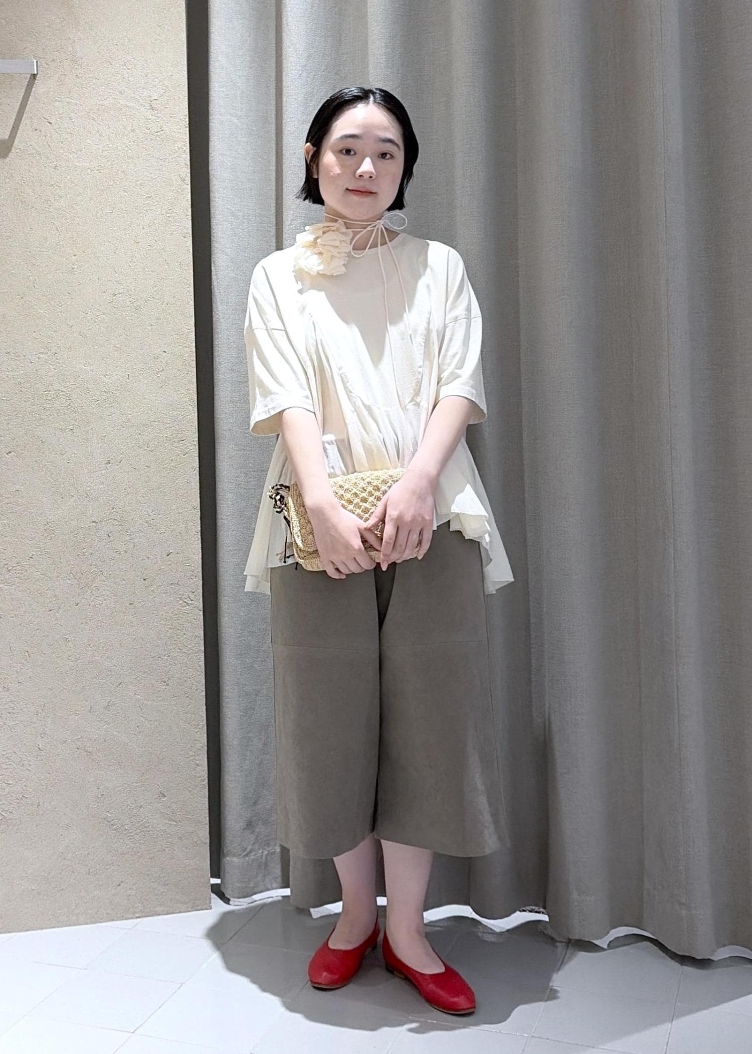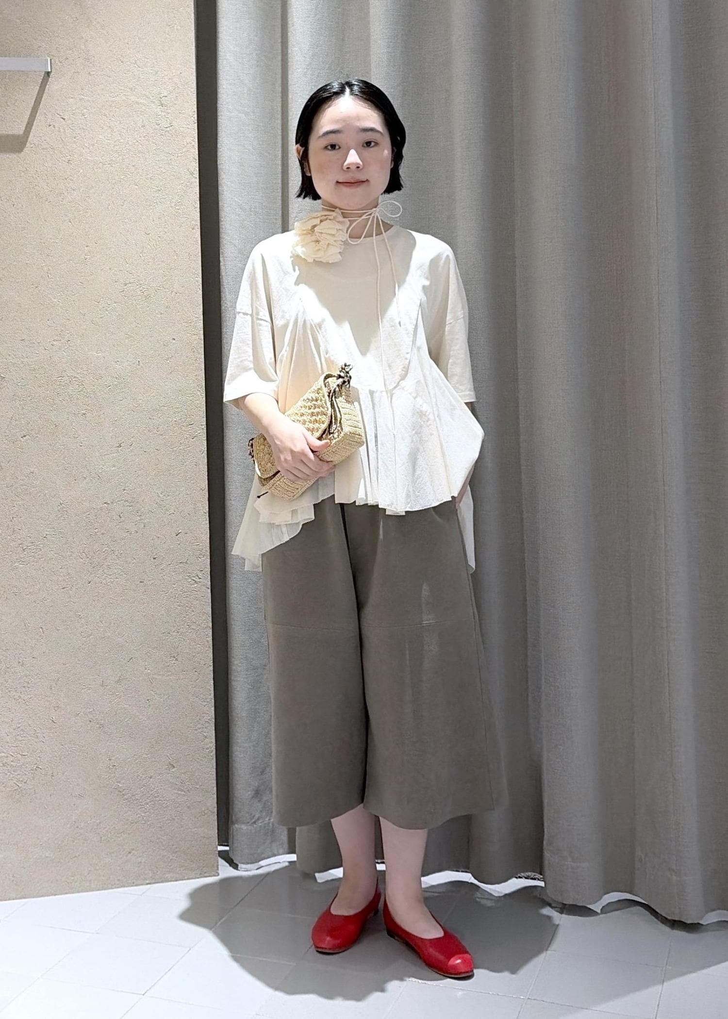 サラッとしたコットン素材で着心地も抜群ですが、一枚で様になるデザイントップスです。トップスがフェミニンな印象なのでボトムは今っぽいハリのあるミディアム丈のパンツを合わせました。シューズはパンプスを合わせていますが、足首を見せることで抜け感も演出してみました。