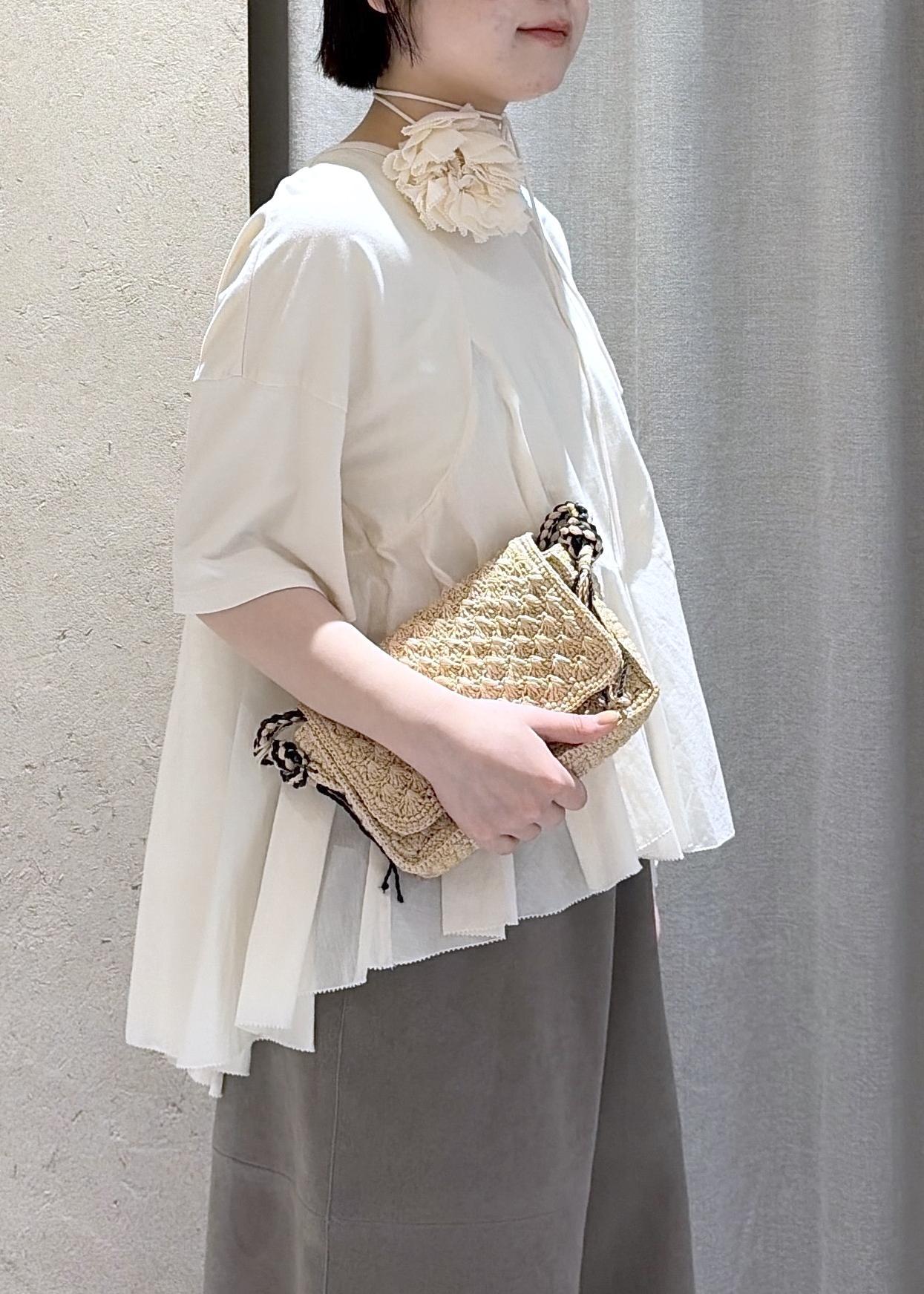今回の別注ではミディアムだけのブラウスとお花のコサージュつきブラウスの2型が発売されます。今回はお花のコサージュつきブラウスを使ったおすすめコーディネートをご紹介します。