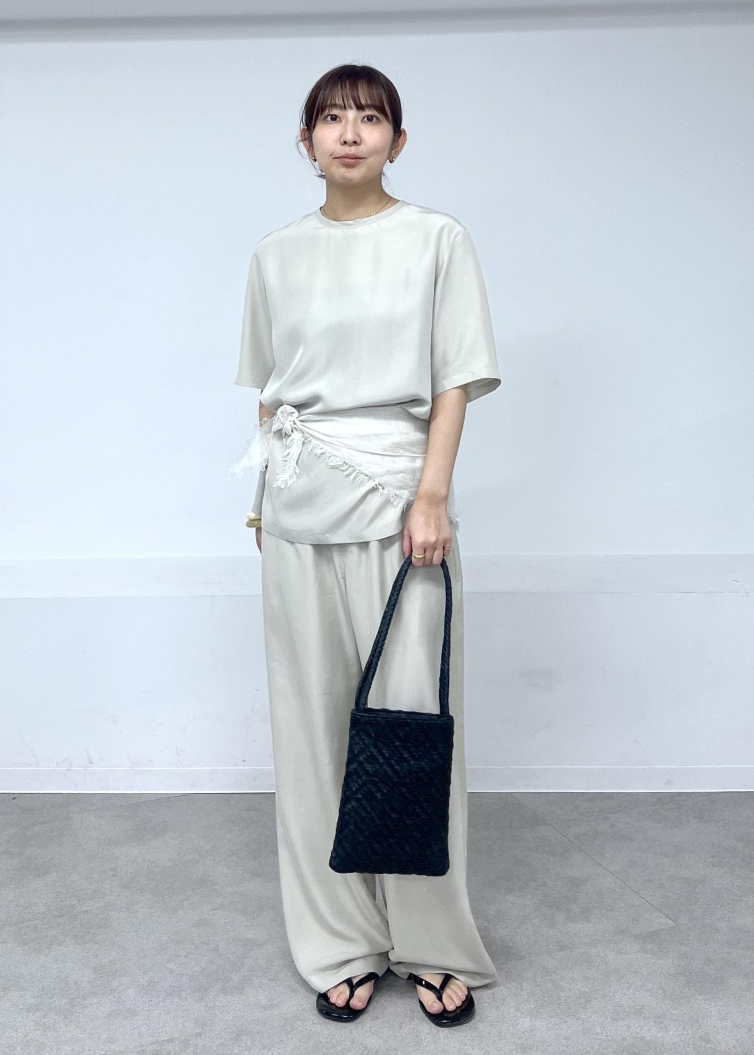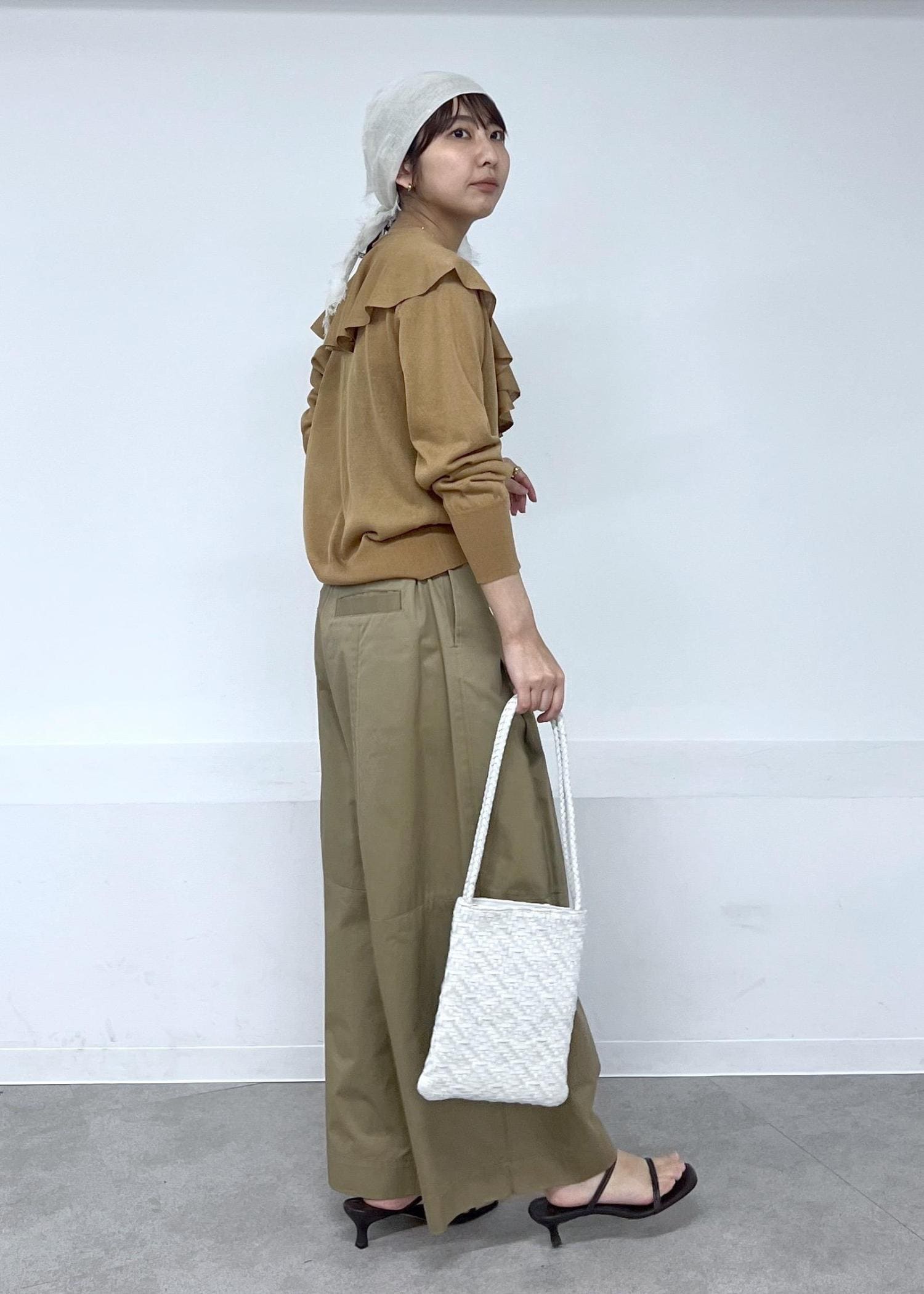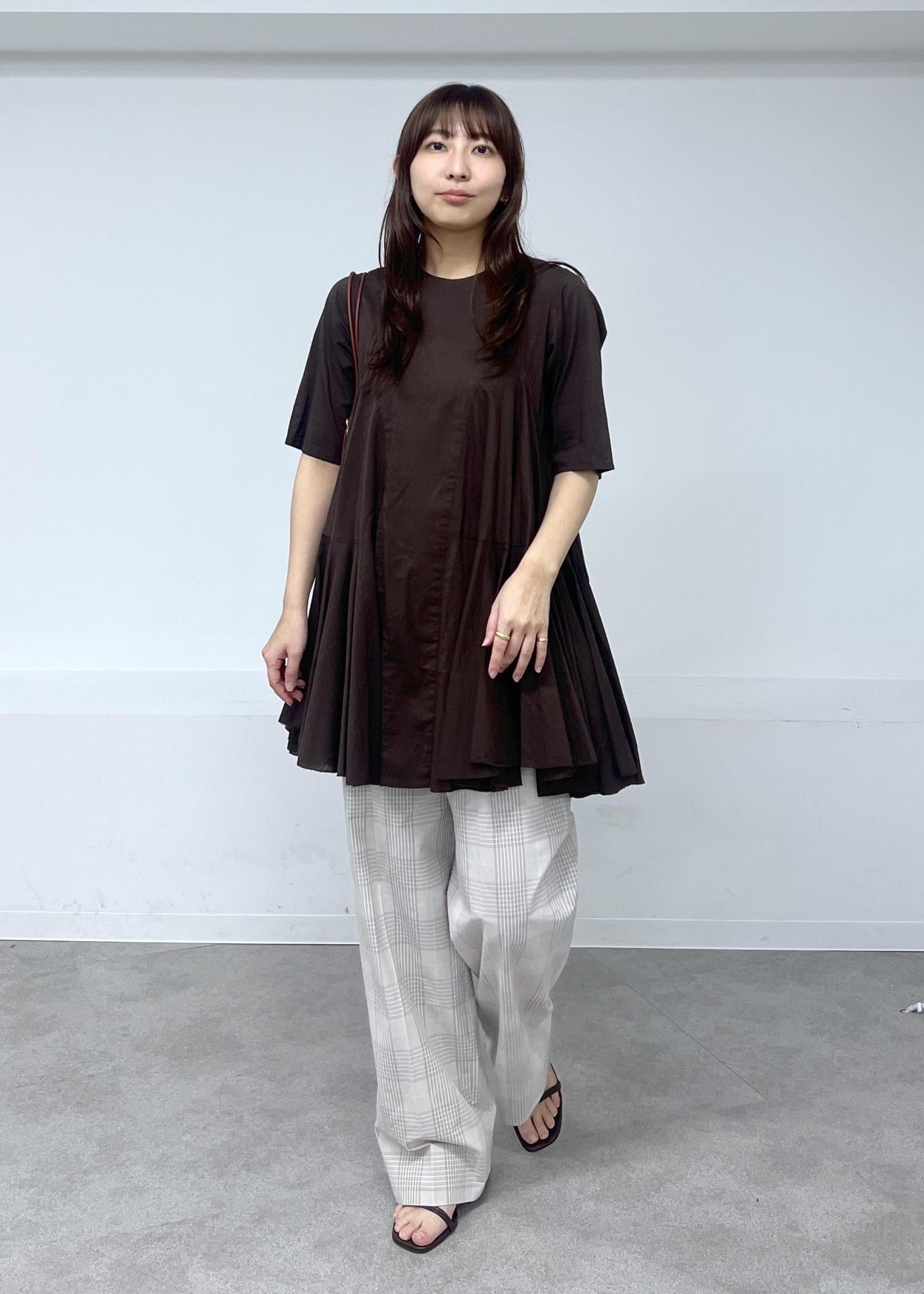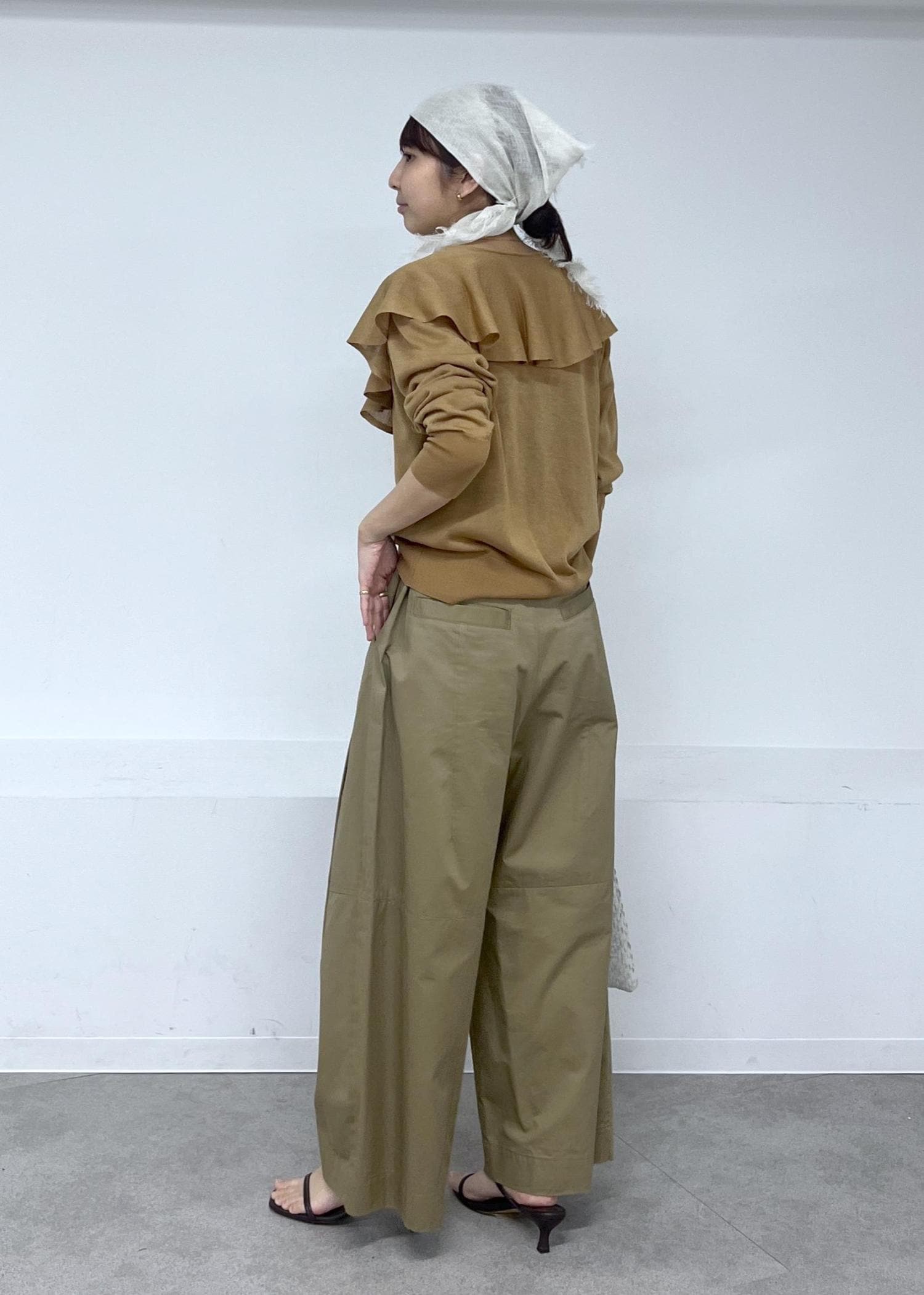 カジュアルな雰囲気もありつつ、タックシルエットがとても綺麗で、トップスにコンパクトなサイズ感のものを重ねてもおすすめです。 -