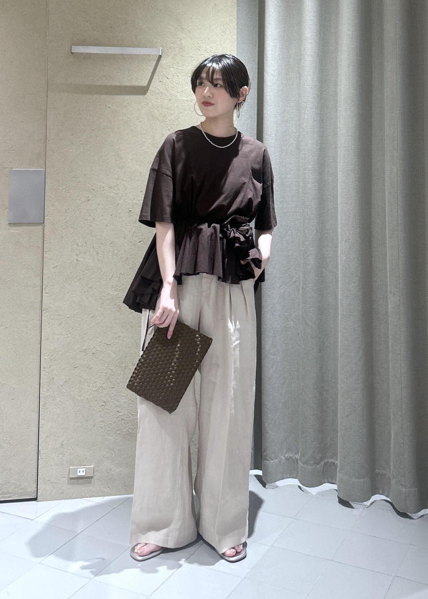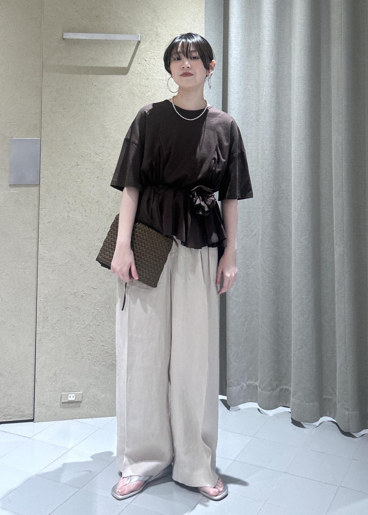 リネンのワイドパンツを合わせたので、付属のマルチカードを首元をウエストに巻いて少しブラウジングさせました。