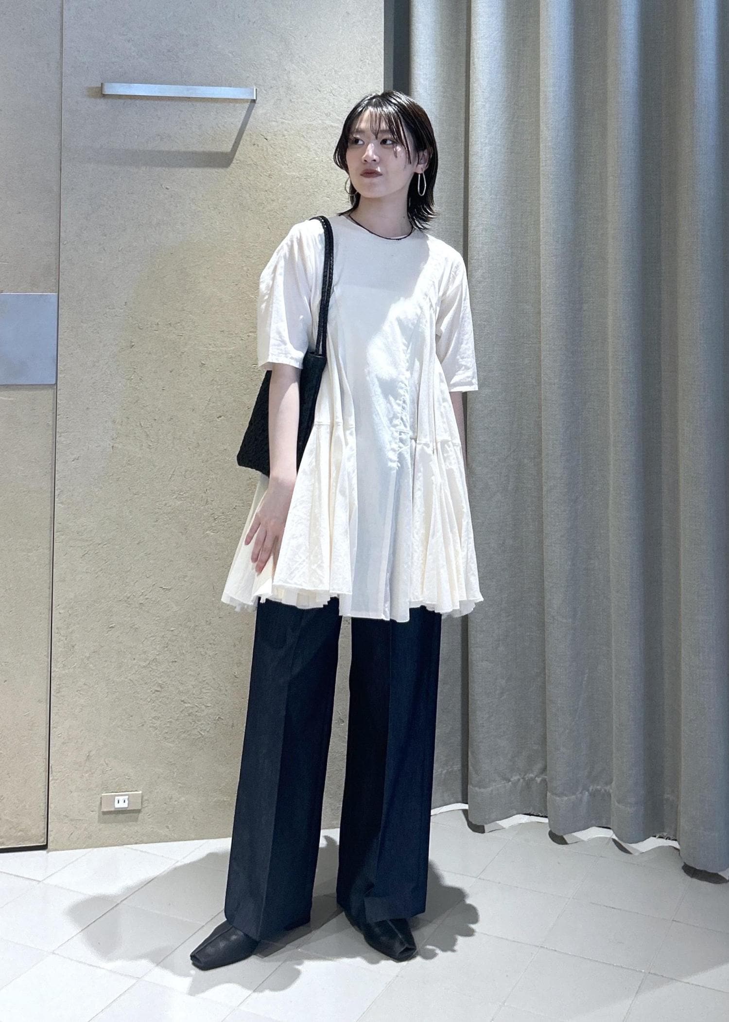 ワンピースとして着るにはやや短めなのでボトムをレイヤードするのがおすすめ。