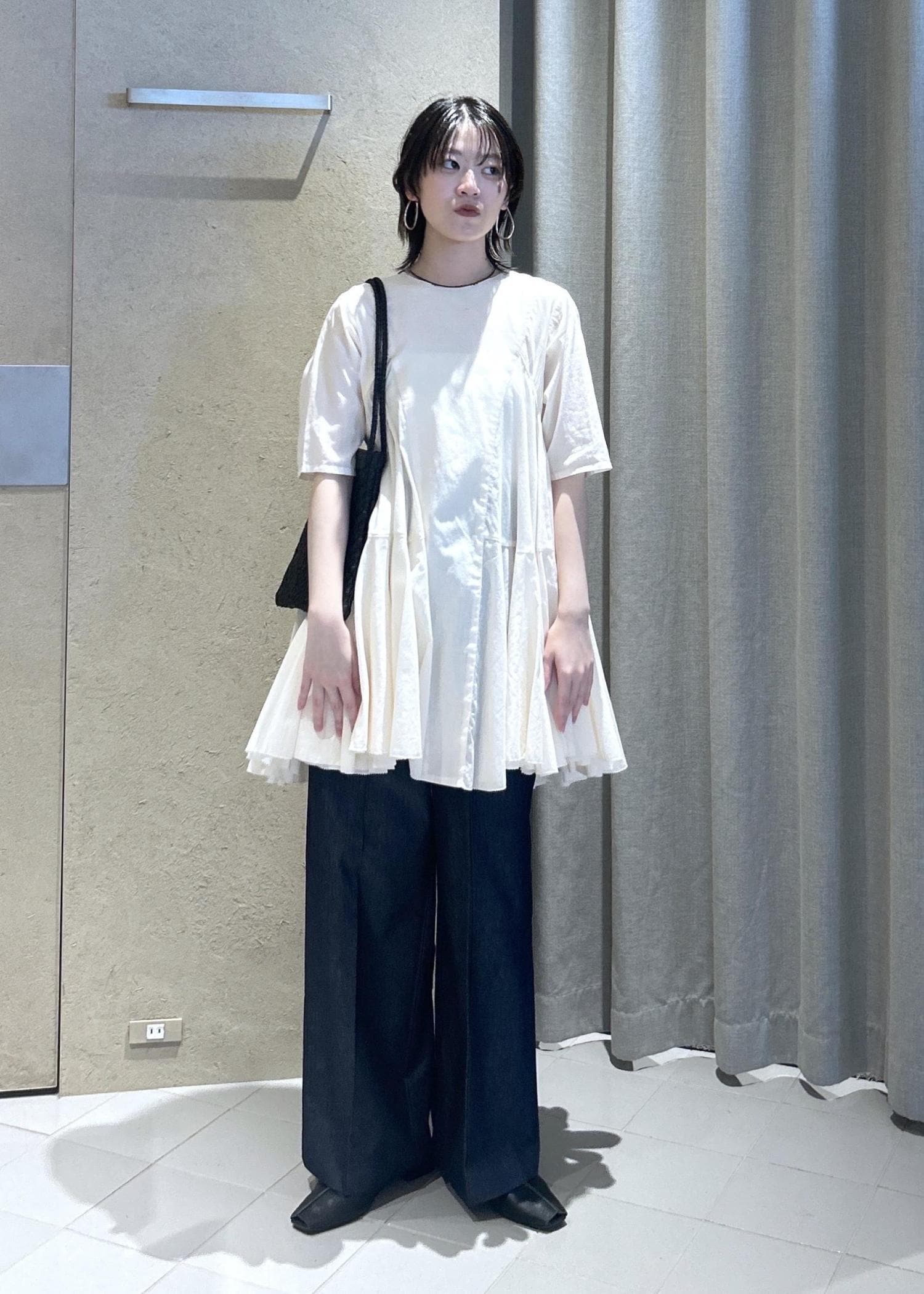 ふんわりボリュームのあるシルエットですが、上半身はすっきり落ち感のある素材なので、合わせるボトムによっては甘くなりすぎないです。