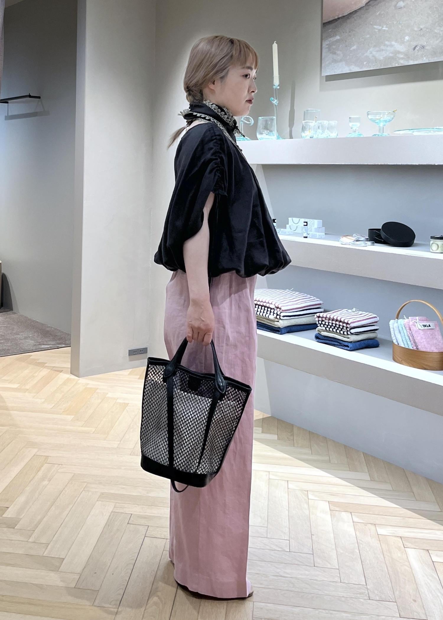 全体的にふんわり空気をまとうシルエットで裾もゴム仕様。涼しく体型拾わずイージーな着心地です。