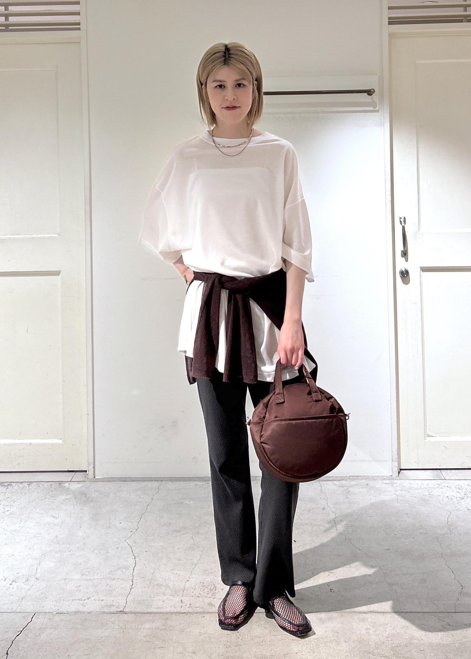 メリハリがつくようにブラウンのトップスを巻き、小物で統一感を出してみました。