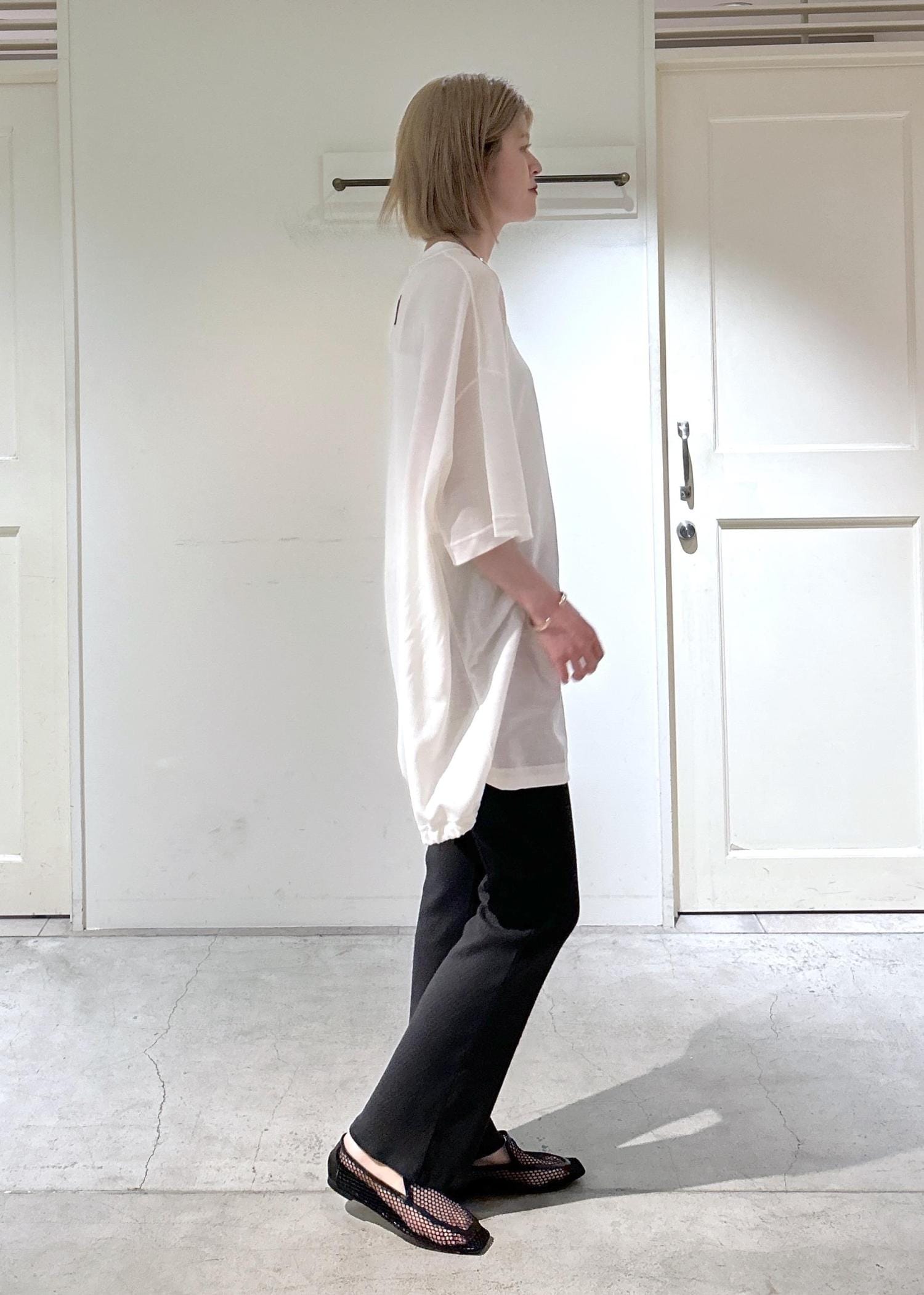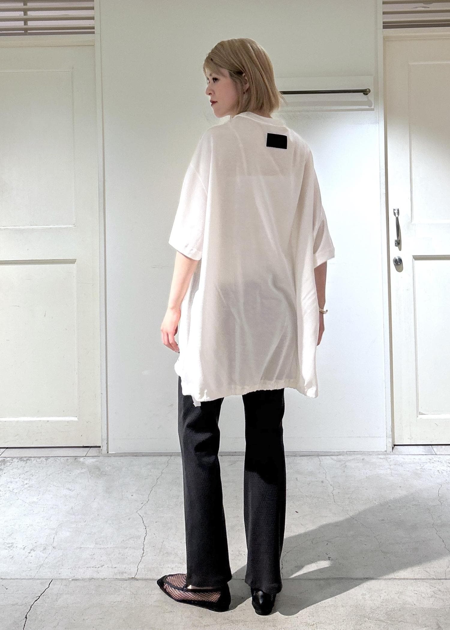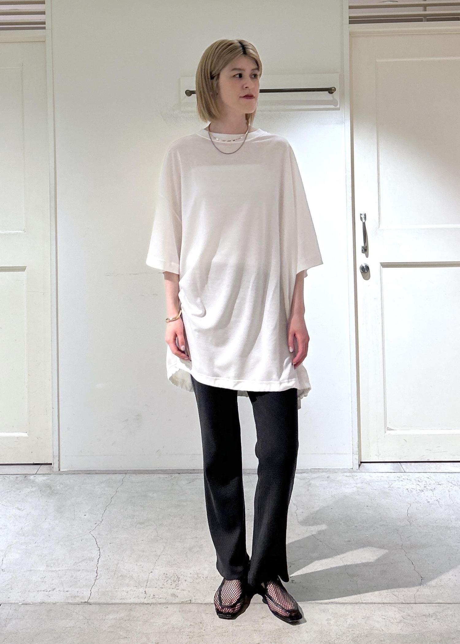 SALON adam et ropé【J'aDoRe・一部店舗限定】【COG THE BIG SMOKE(コグザビッグスモーク)】BOWIE T SHIRTホワイト / 1¥24,200レビュー身長171cmで、丈は太ももの真ん中くらいの長さ。袖は肘下までの長さなので、腕周りを気にせず一枚でサラッと着られます。裾が絞れるので、シルエットを気分で変えられるのがポイント。