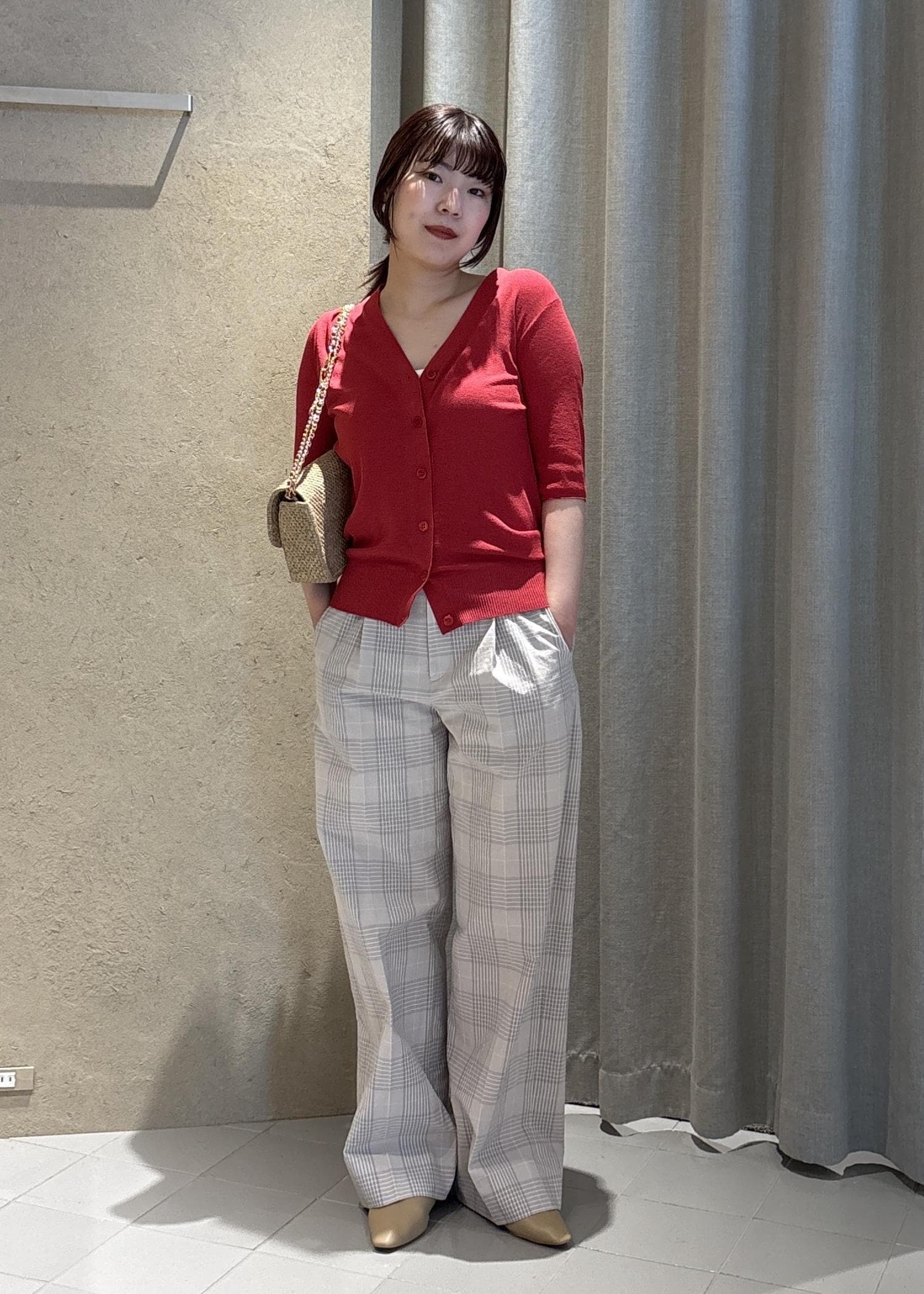 私はトップスに、大人でも着やすいピンクレッドをチョイスしました!