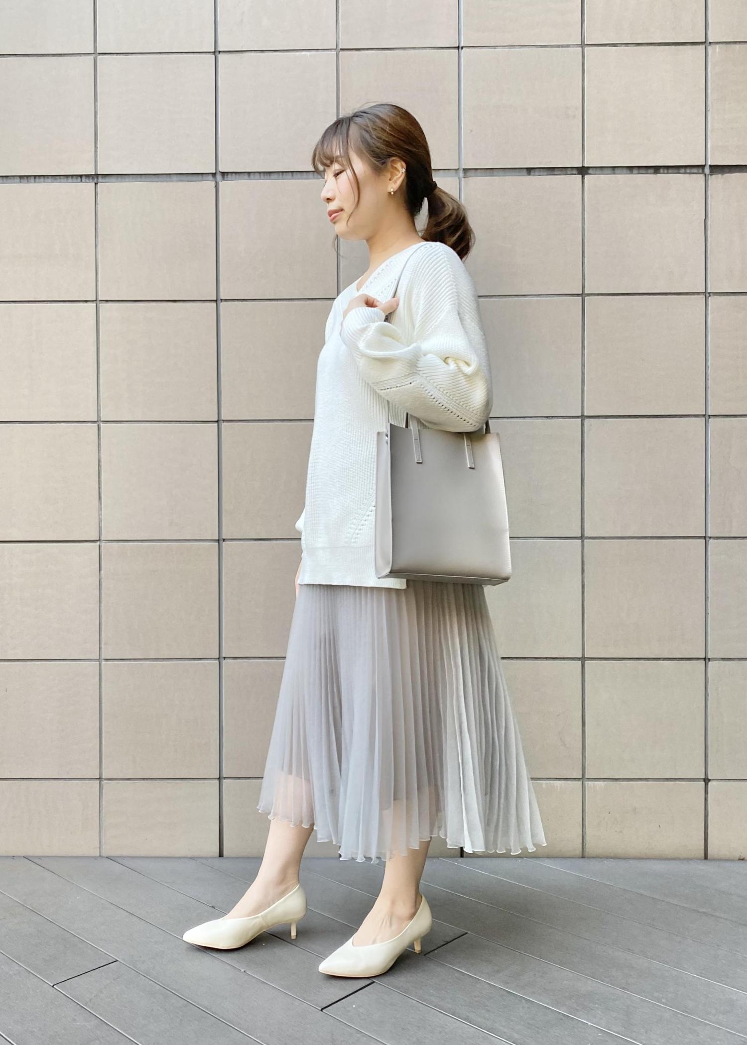 バッグに合わせて白やグレーの同系色で服もまとめて綺麗目に合わせました!