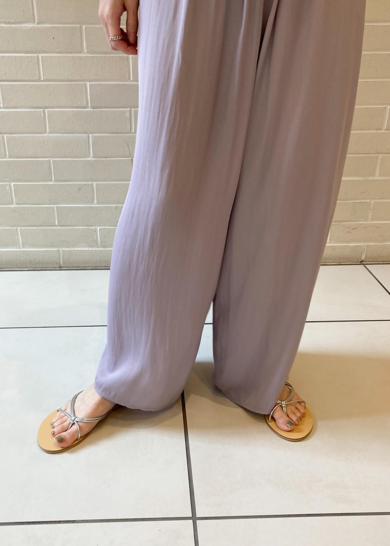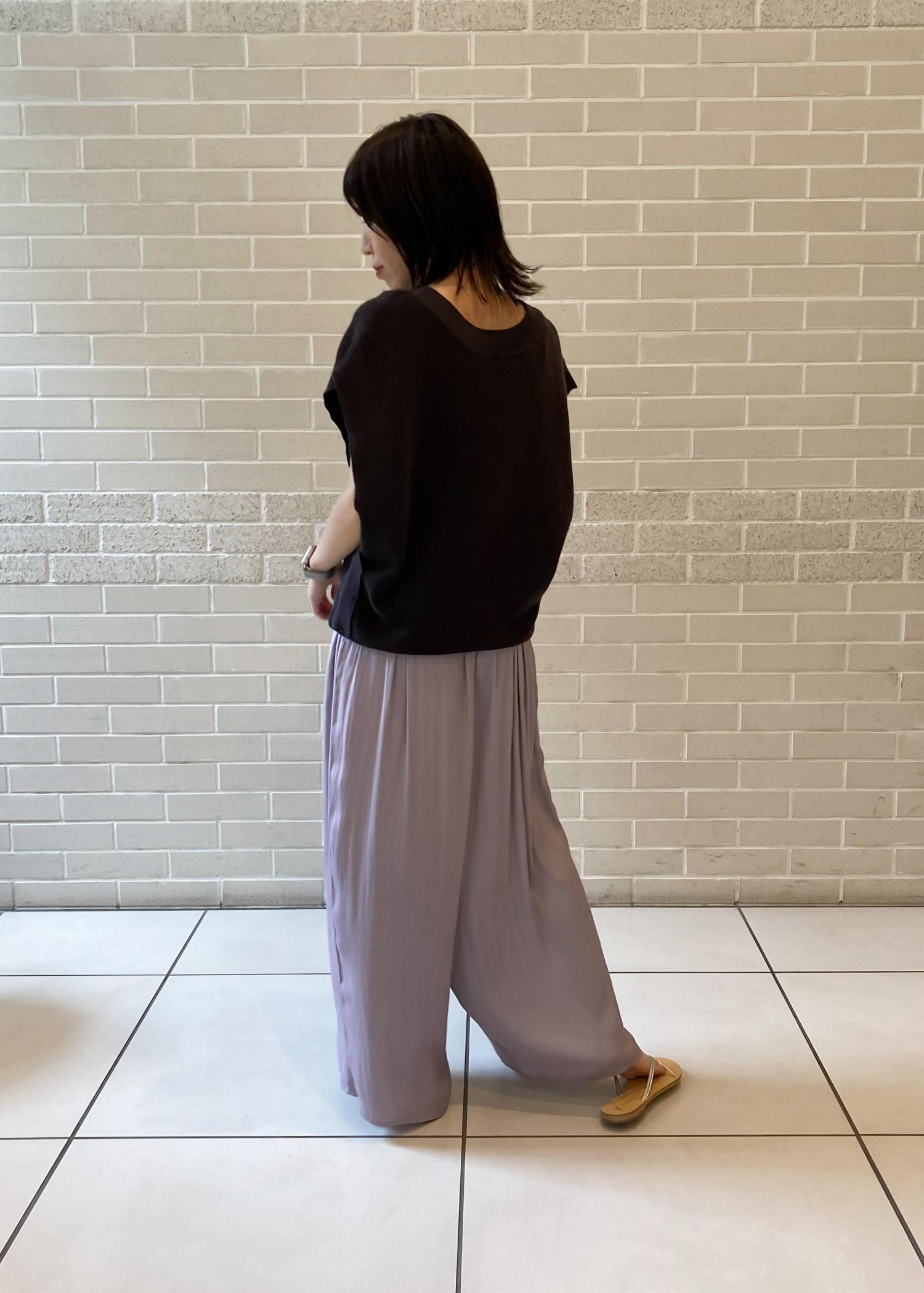 ラミー混のさらっとした素材のブラウンのニットにピンクのサテンパンツを合わせた大人スタイル!