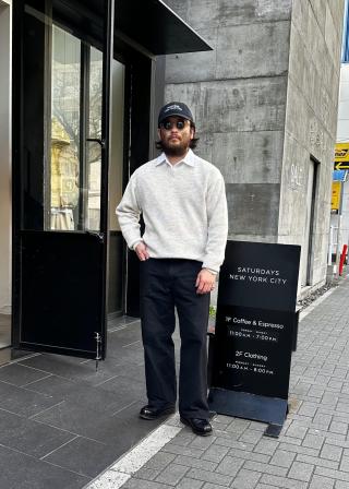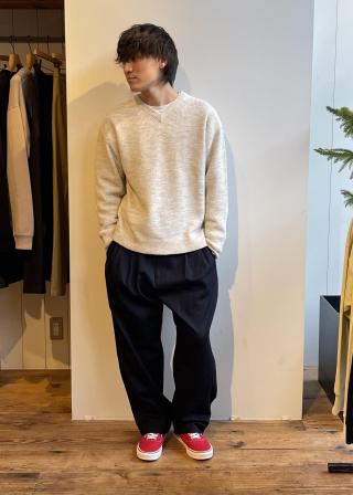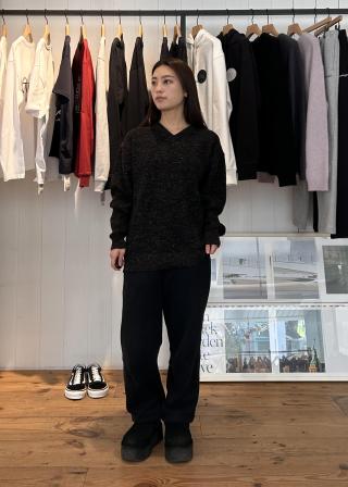 ネック、肩、アームホールには目立てを入れることでシンプルながら拘った編地になっており、浅く設定したVネックが変化のある大人のデザインになっています。