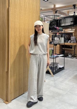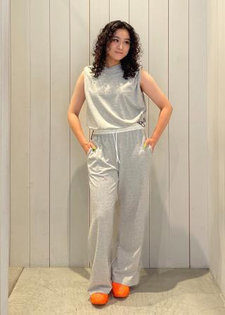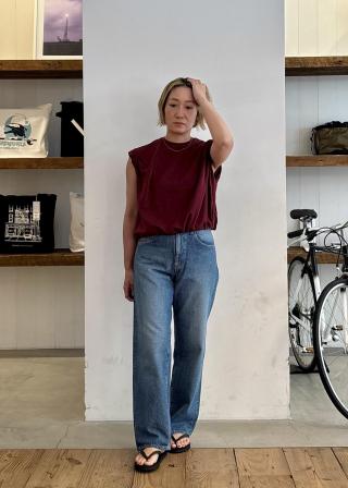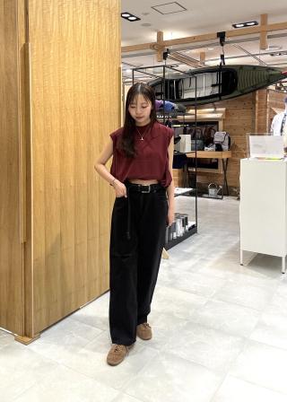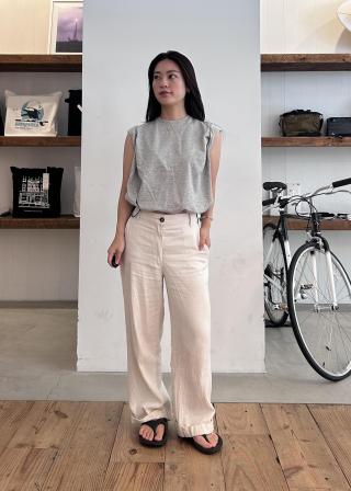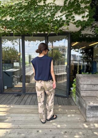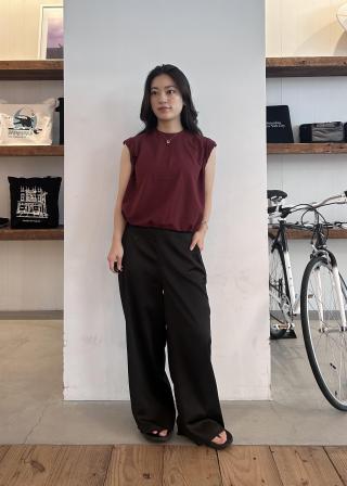 袖ねじりが特徴的なノースリーブトップス。裾のスピンドルで丈感を調整可能。