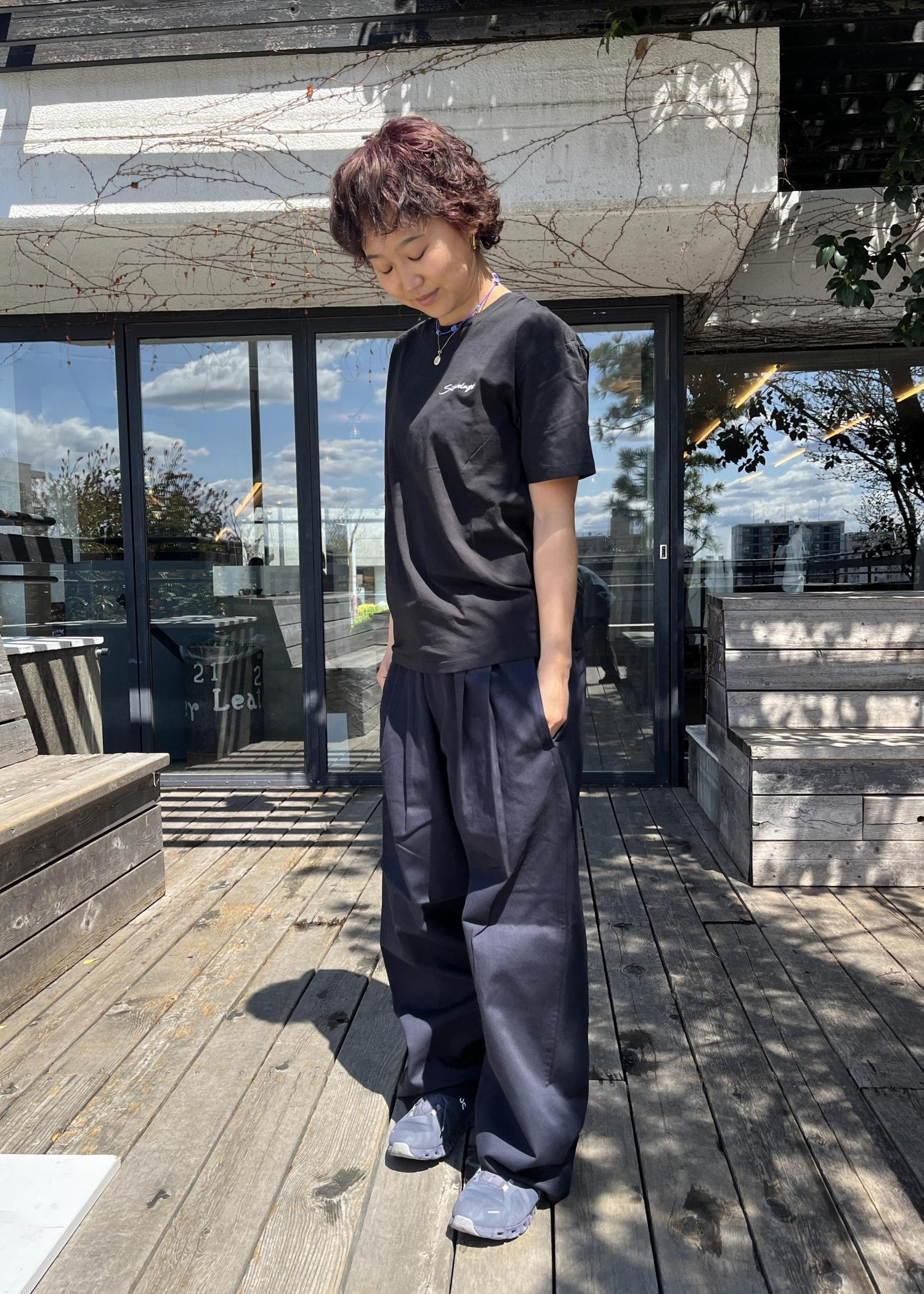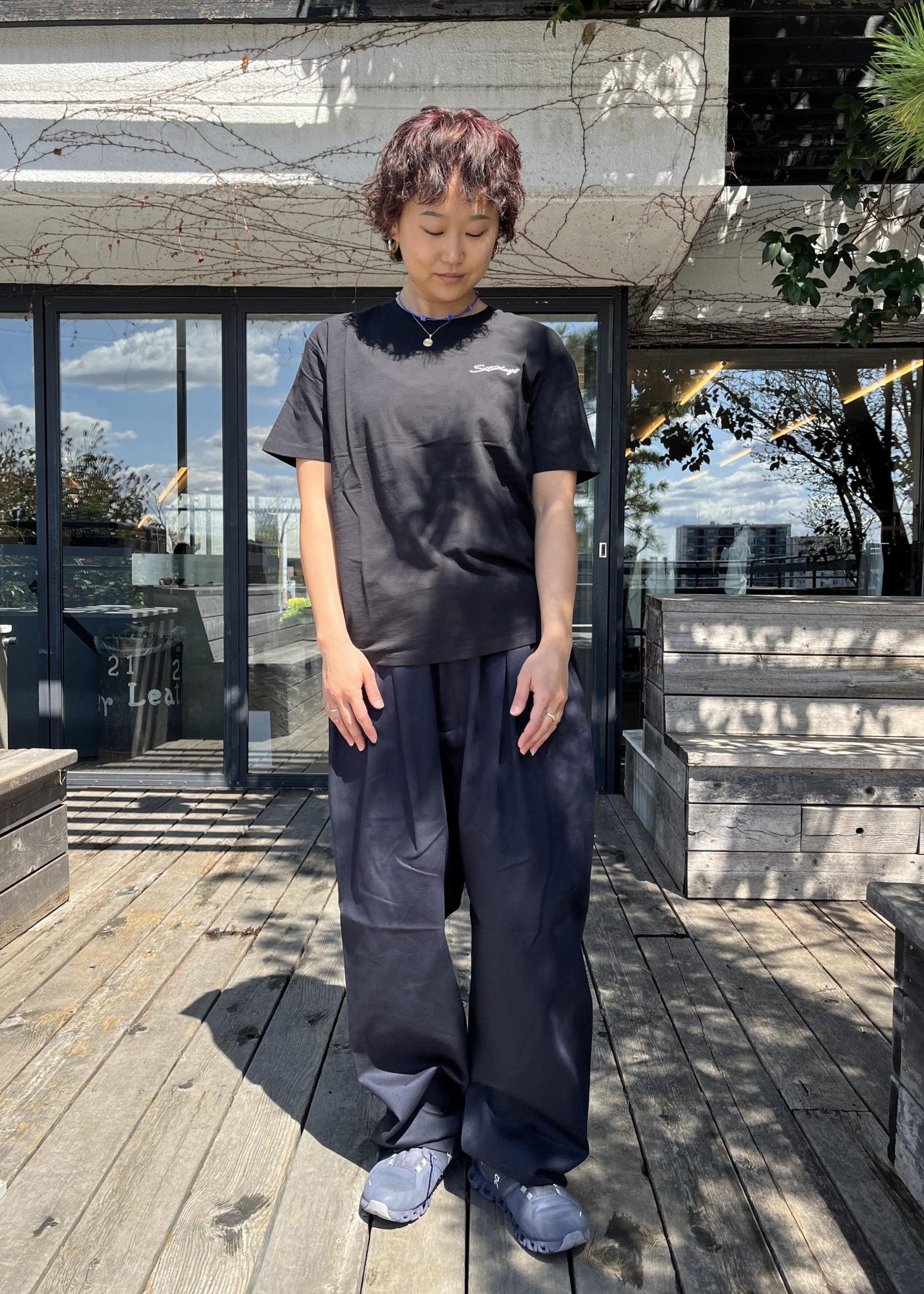 Saturdays Embroideryロゴの定番Tシャツとお気に入りのパンツでシンプルにコーディネート。All BlackではなくBlackとNavyでミスマッチなカラーリングがポイント。Saturdaysらしいベーシックなスタイルはいつまでも色褪せない。