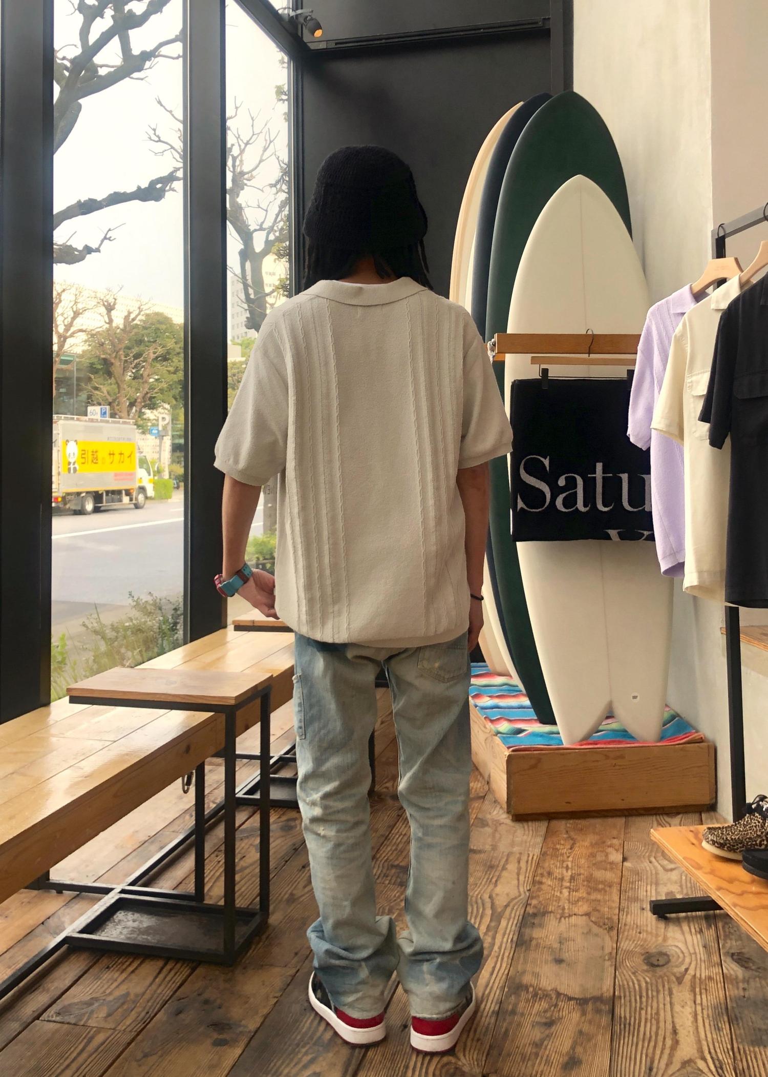 半袖スキッパーポロデザインのニットに私物のデニムを合わせました。