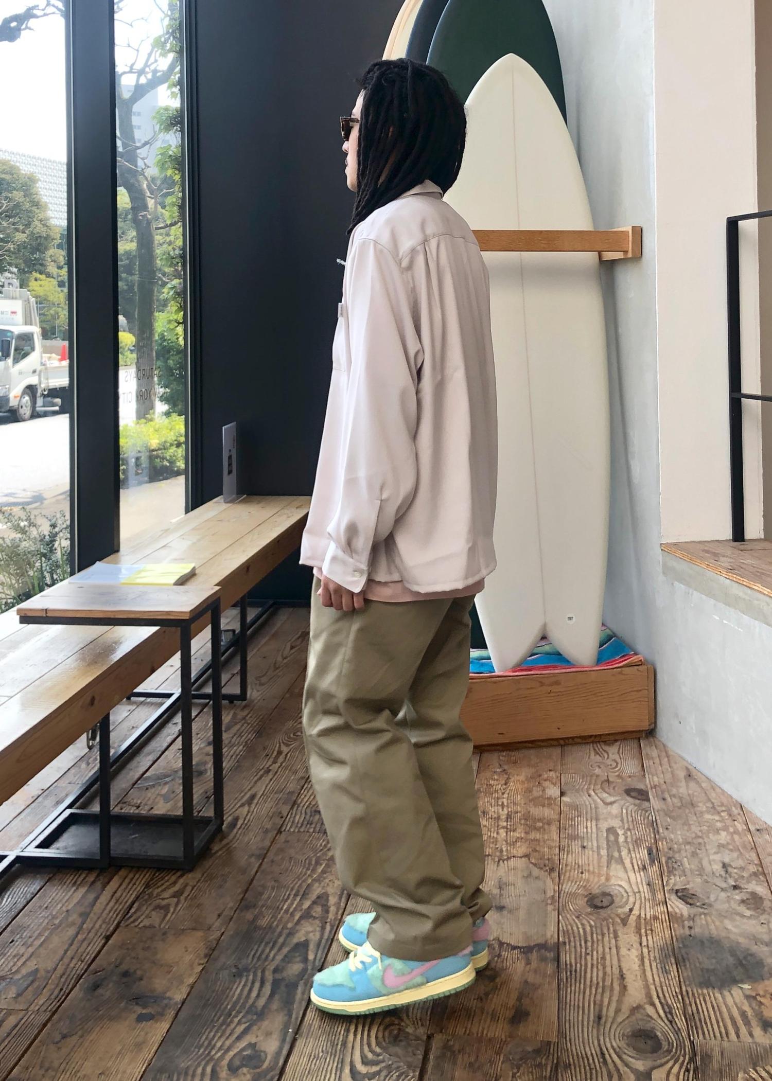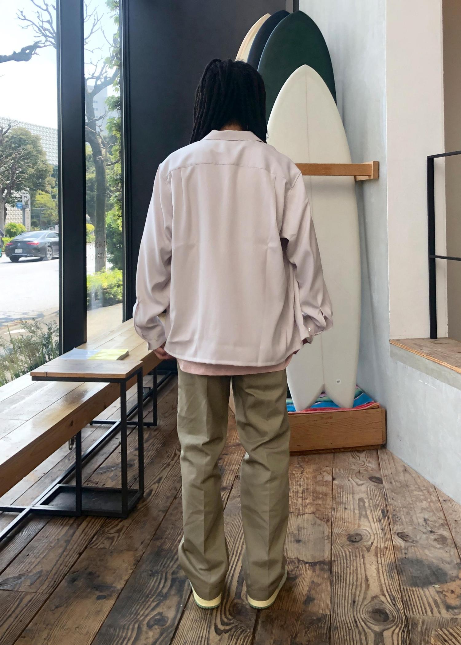 ピーチスキン生地を使用した長袖シャツに、インナーのTシャツはピンク。