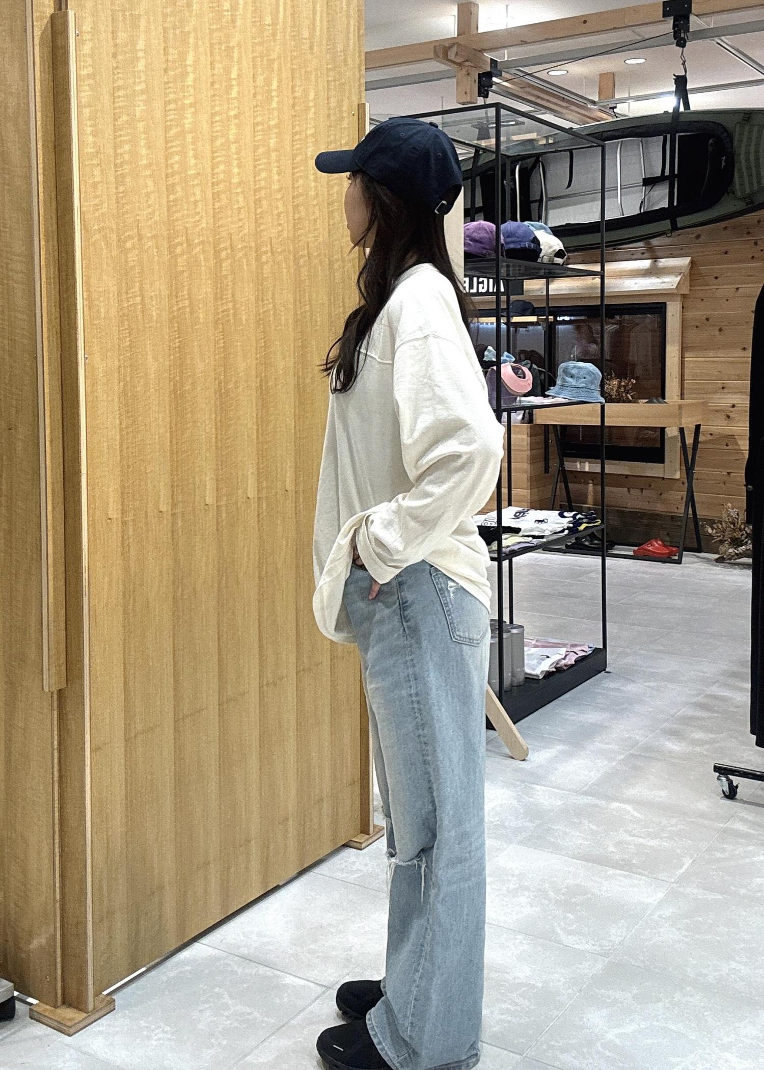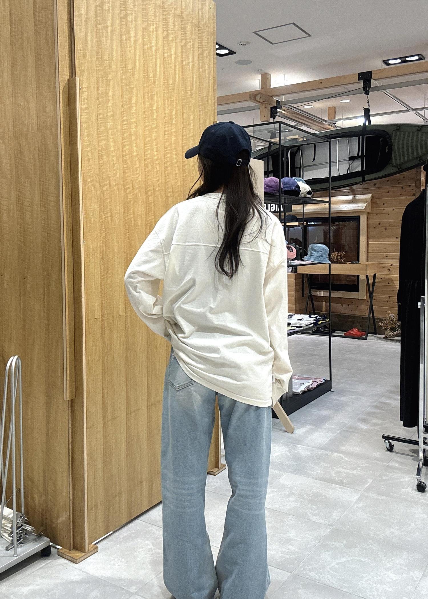 着用しているトップスはベビーウェイトの素材になっており、1枚着はもちろん、レイアードにも使いやすいです!