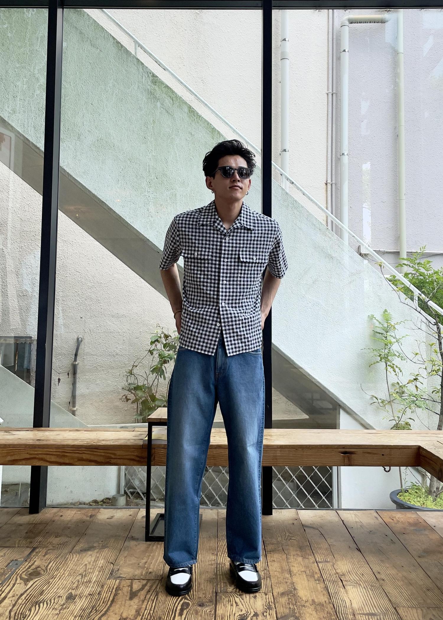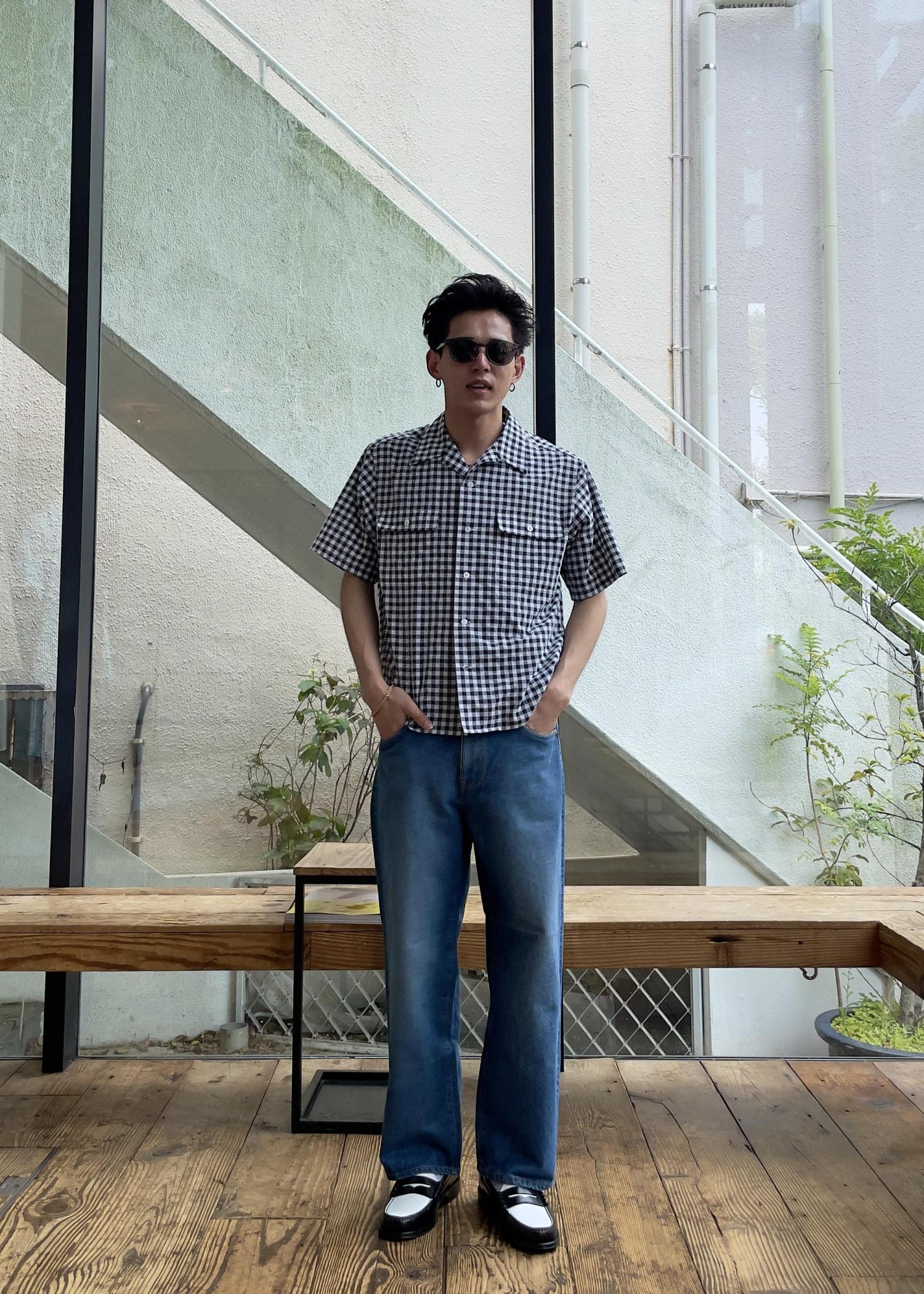 短丈と綺麗な形、綺麗な洗いがかかったデニム、そこにG.H.BASSのクラシカルなロファーとグレーのサングラスでシャツの色を拾い統一感が増し、綺麗で子供っぽくならずかっこよくスタイリング出来ると思います!!