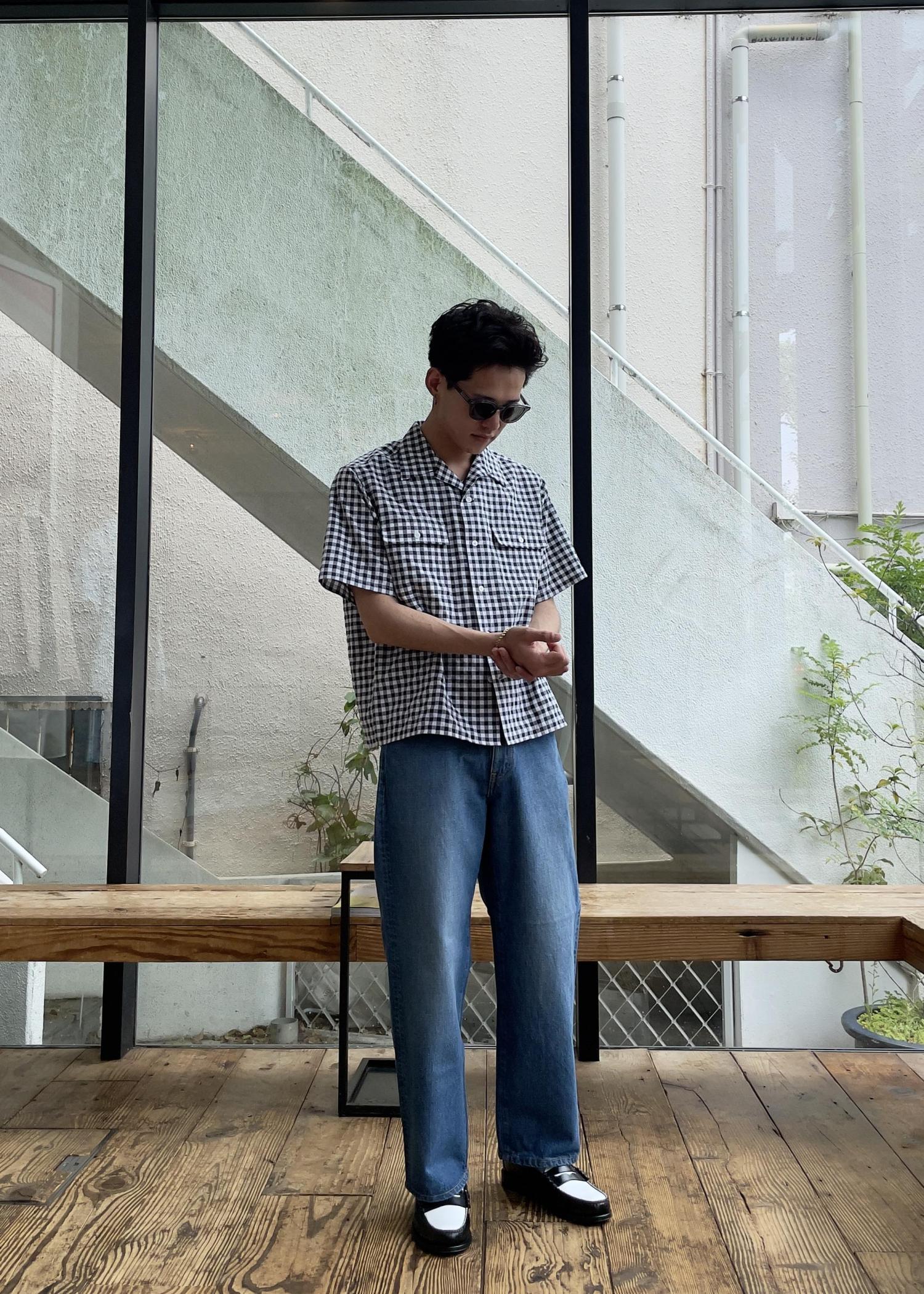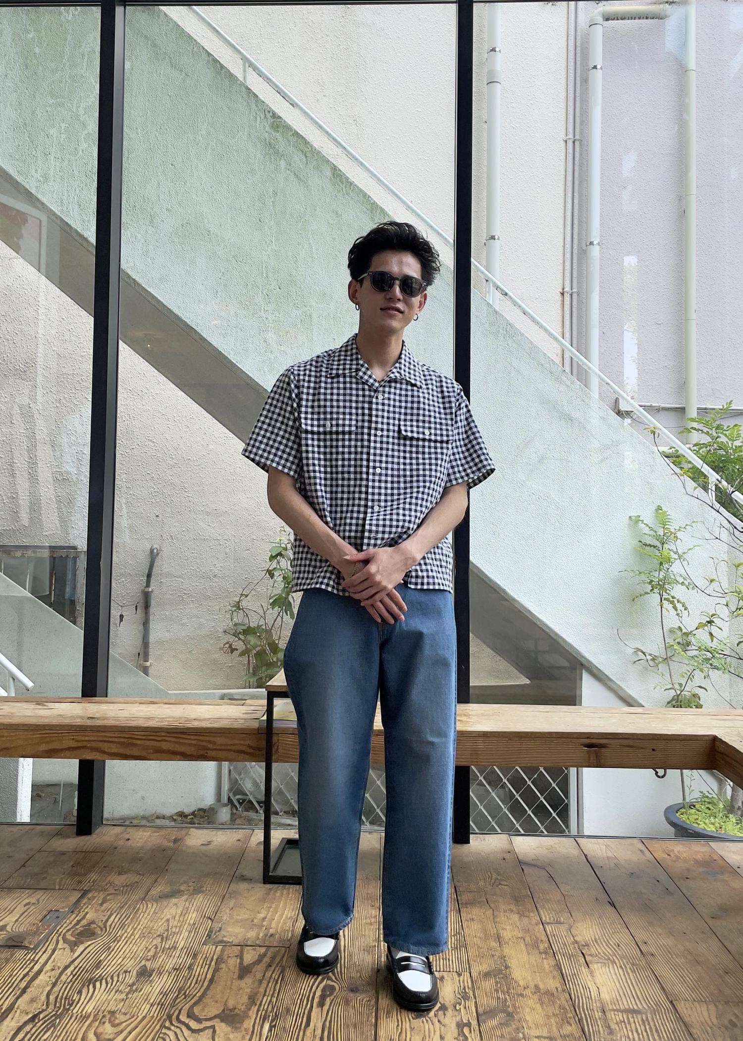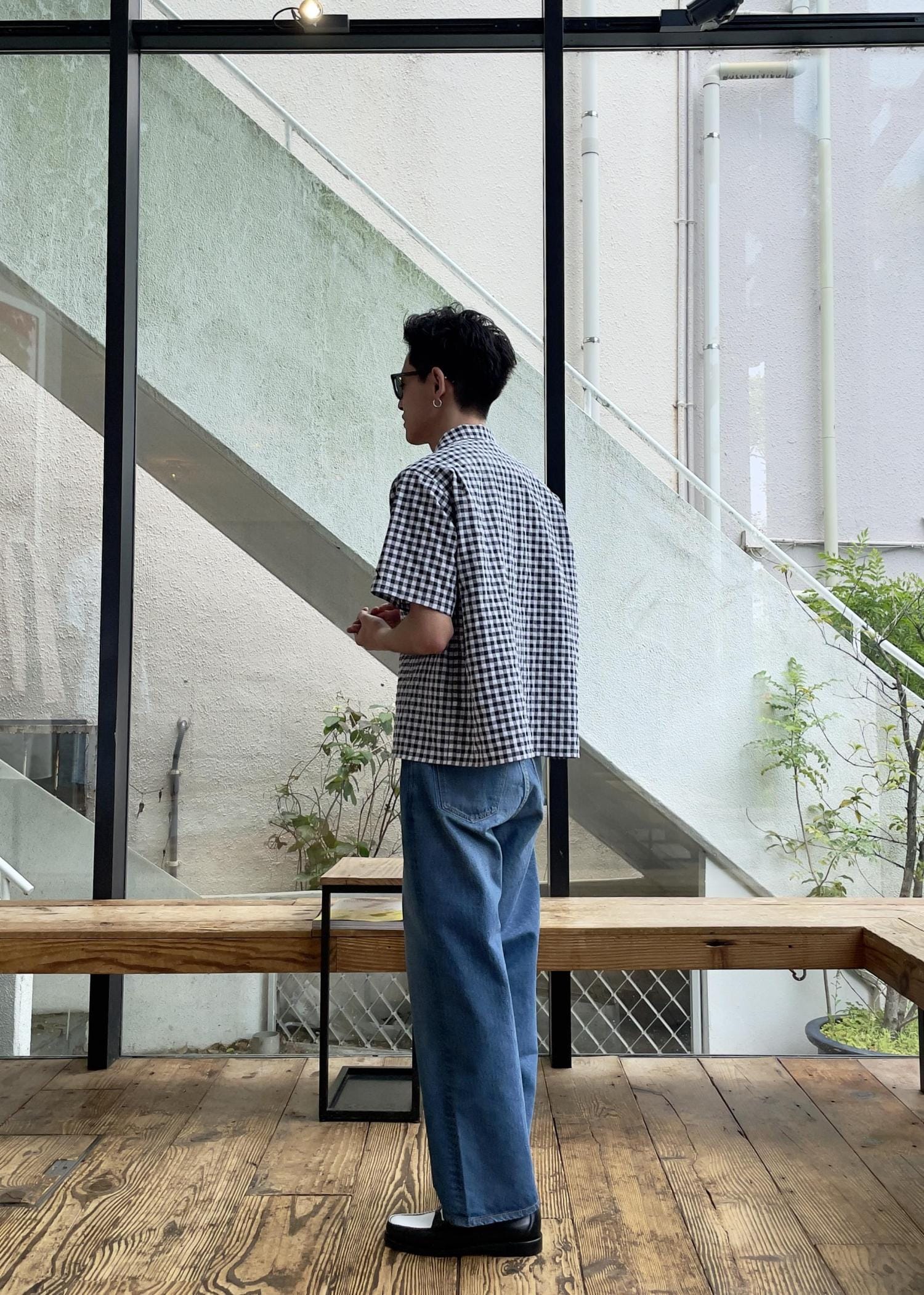 ギンガムチェックは子供っぽく見えてしまいそうですが、シャツはボックスシルエットで形がすごく綺麗なアイテムになってます。