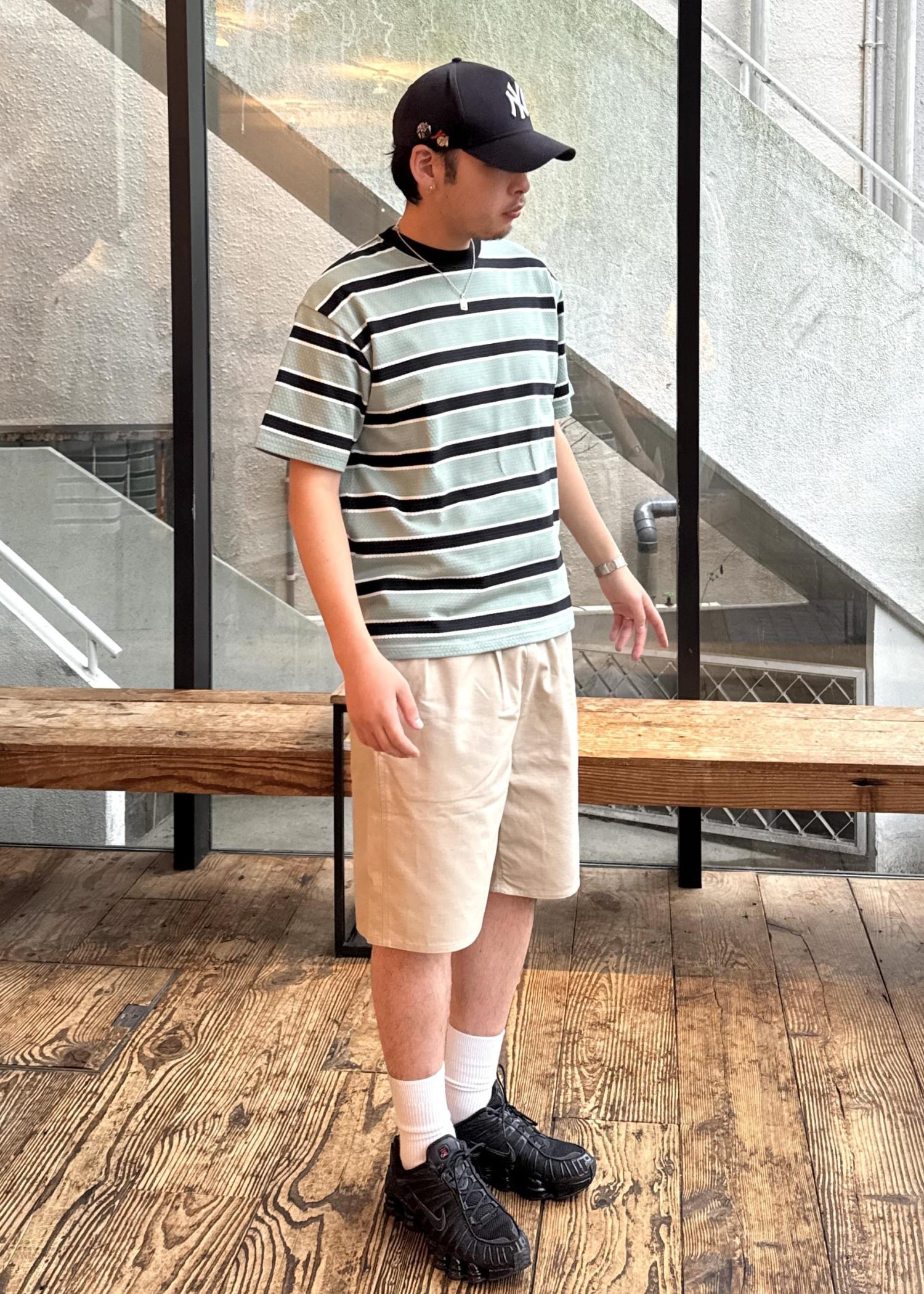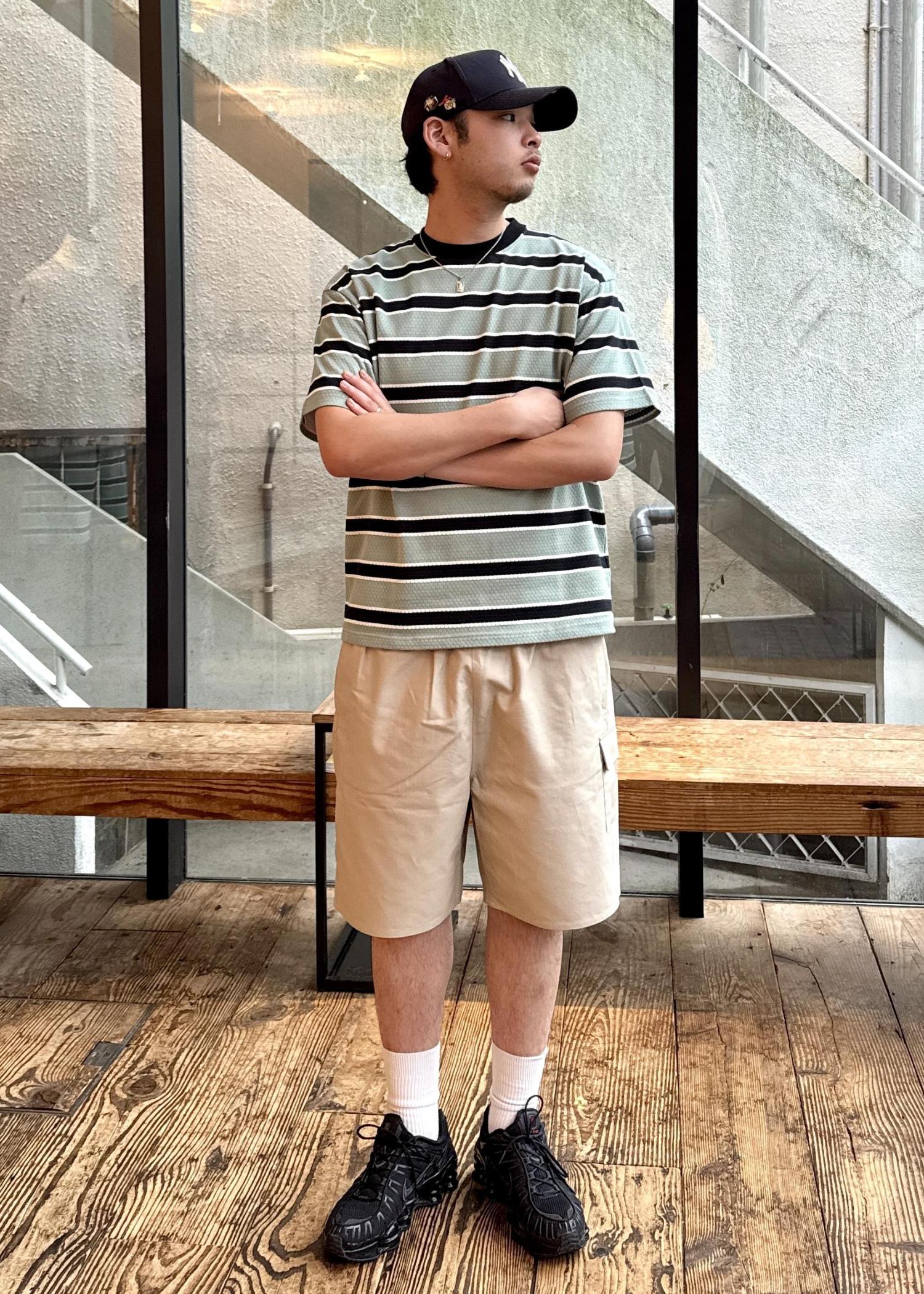 トップスはボーダーTシャツ爽やかなミントグリーンが夏らしさを演出。黒のラインが入っていることで、全体の印象が締まり、カジュアルながらもメリハリのある印象に。ボックスシルエットで、程よくゆったりとしたシルエット感。メッシュ生地なので、風通しも良く、スポーツ感も演出してくれます。