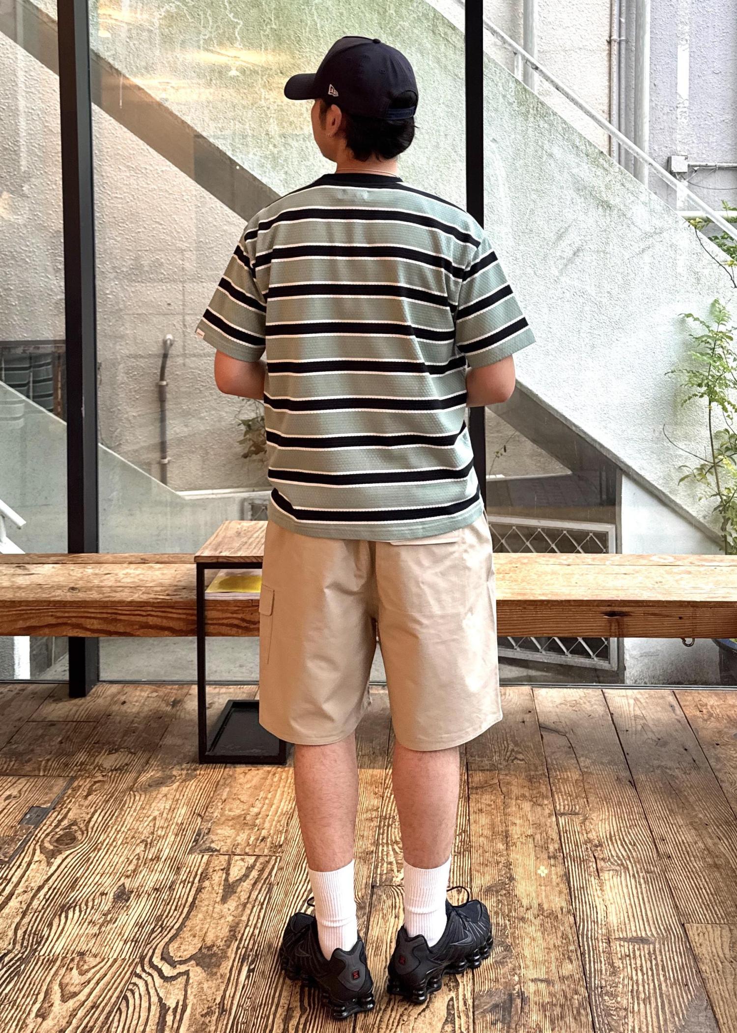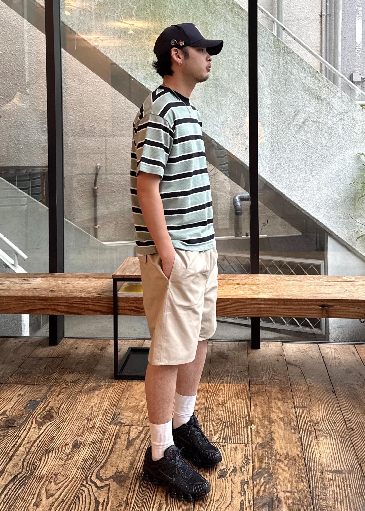 そこにカーゴショーツでベージュのショーツ明るめのベージュがボーダーTとよく合い、全体を柔らかく中和。清潔感・軽快さがあり、夏のデイリーユースに最適です。
