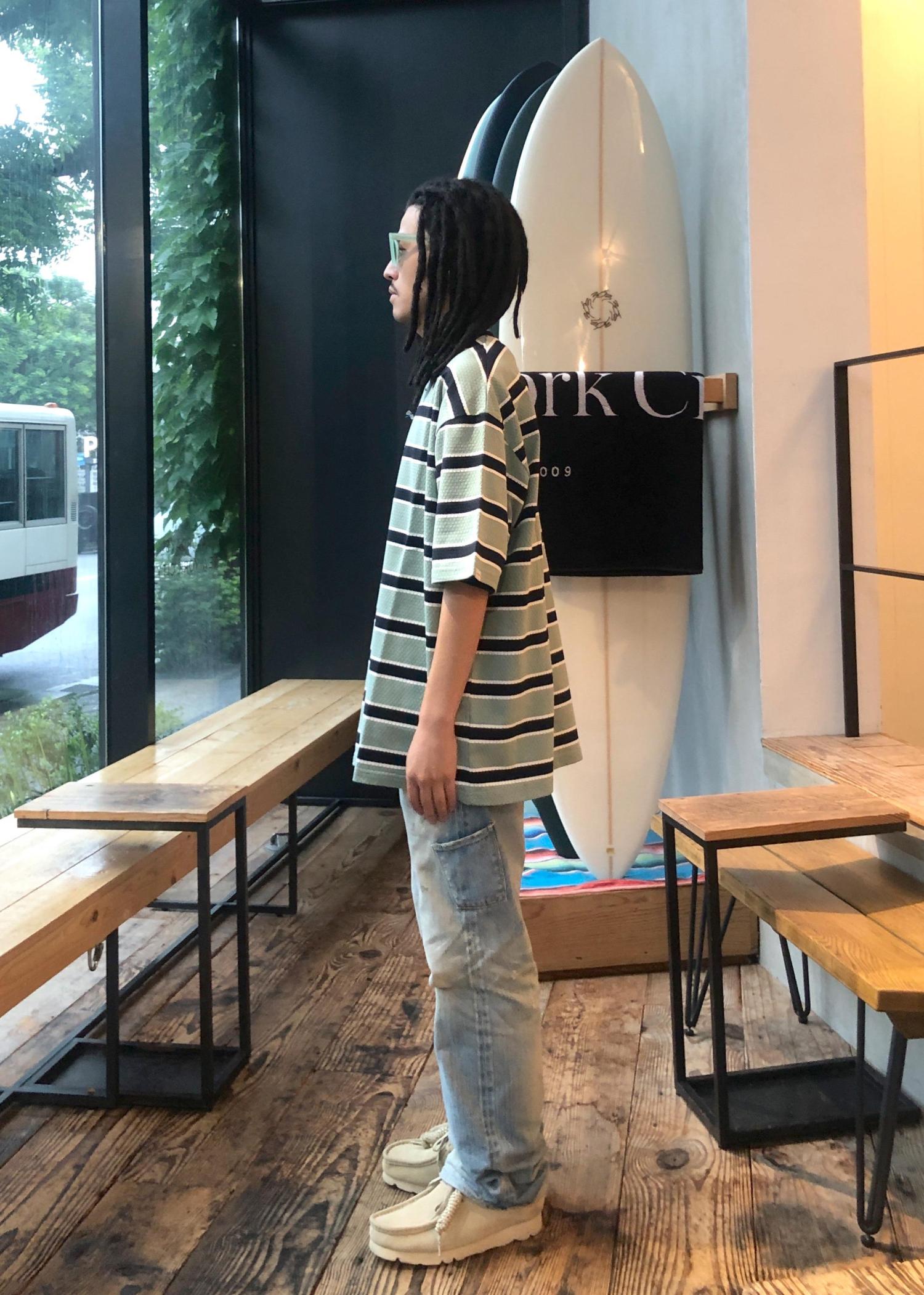 夏に向けて日本のアイウェアブランド〈ayame(アヤメ)〉とのコラボレーションアイテムに、通気性の良いクラシックなメッシュボーダーのTシャツを合わせました。
