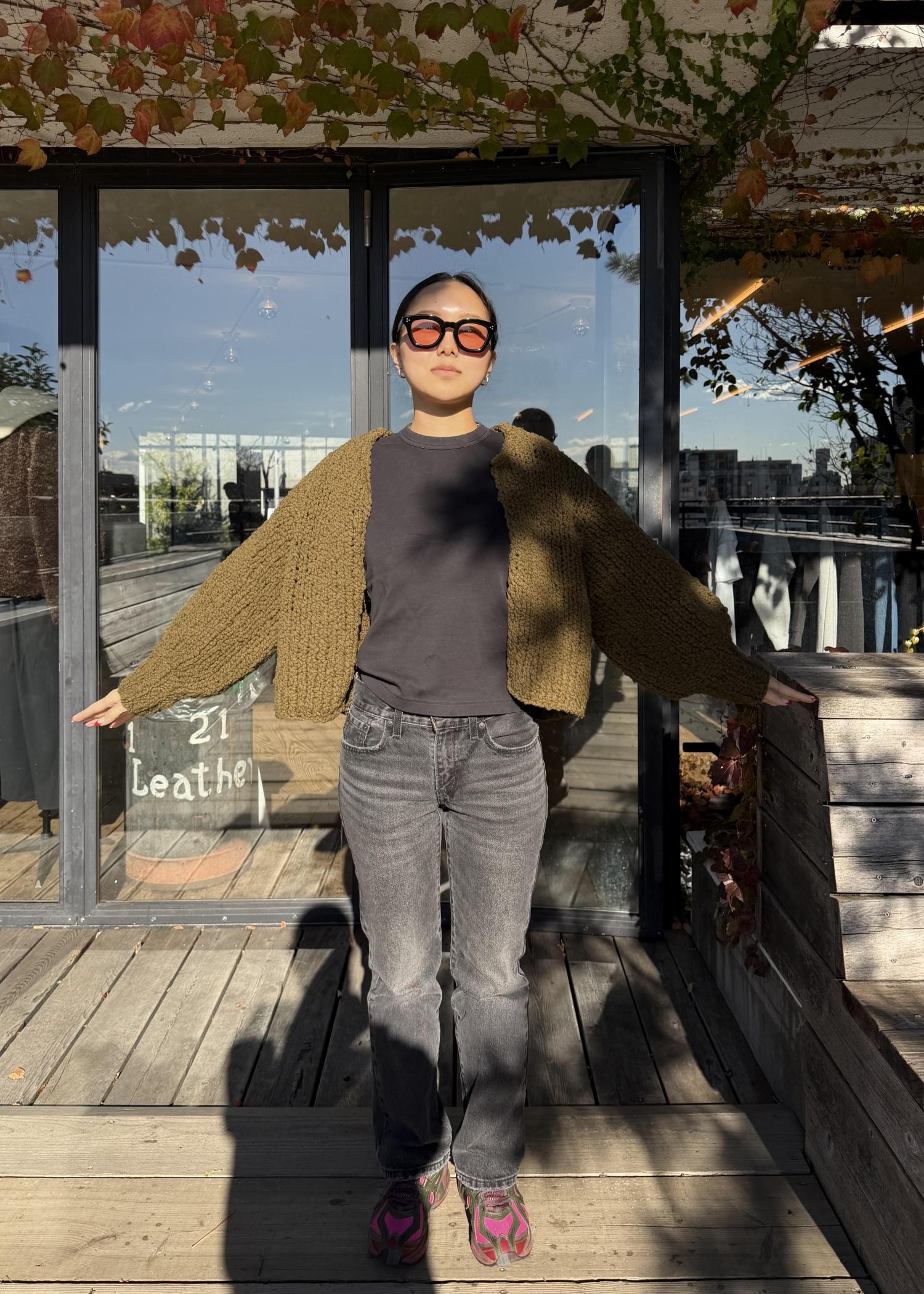 ややパステル調のカラーで夏感は出しつつ、ライトブルーのデニムであまり露出をしないスタイル。