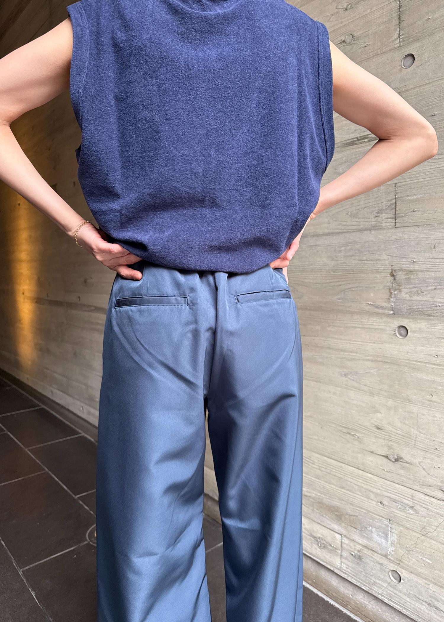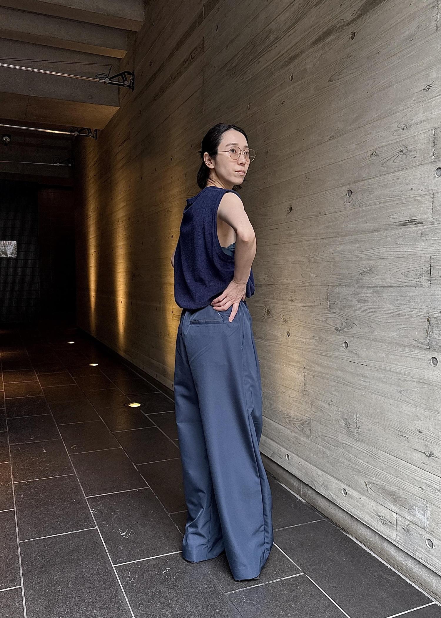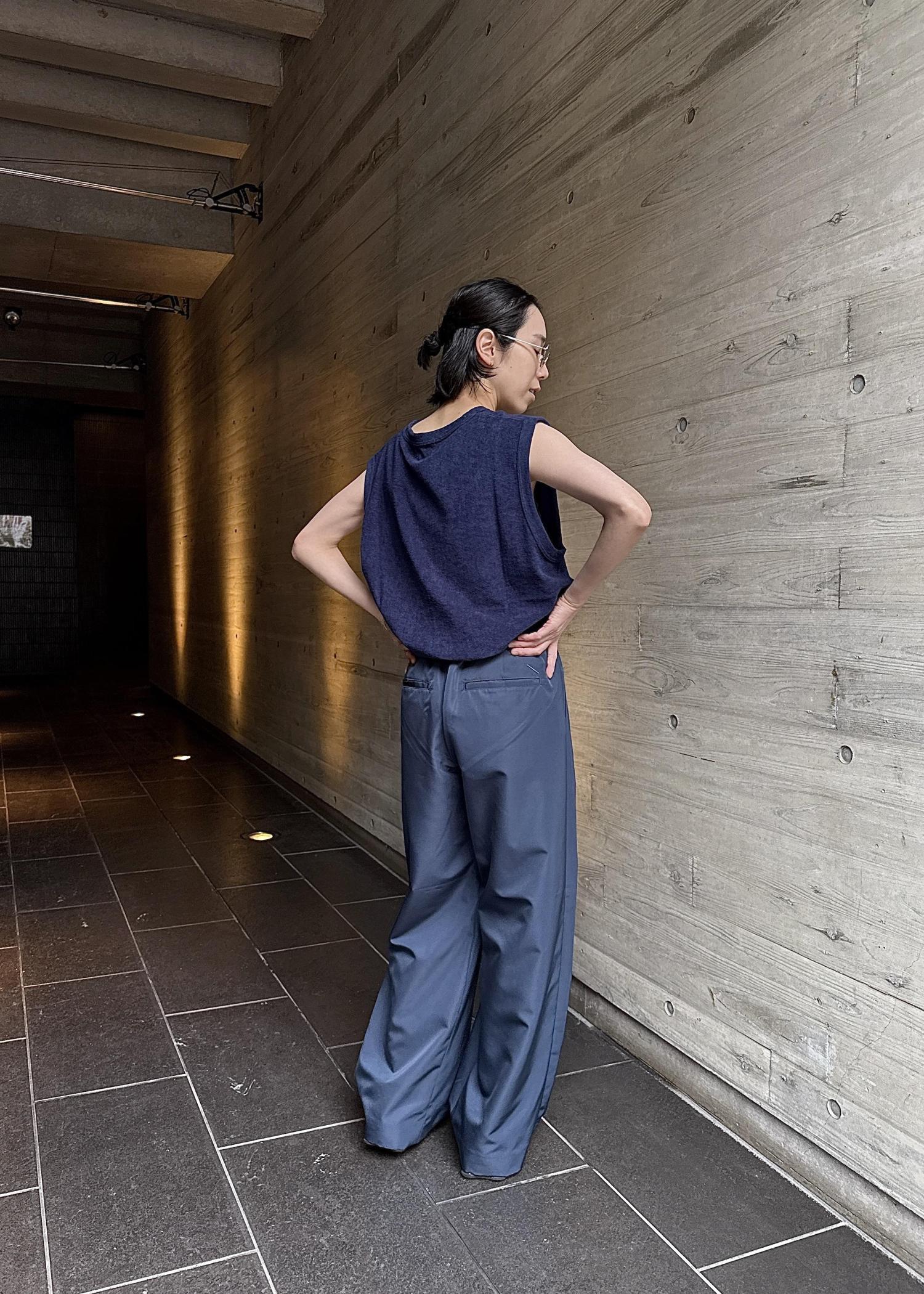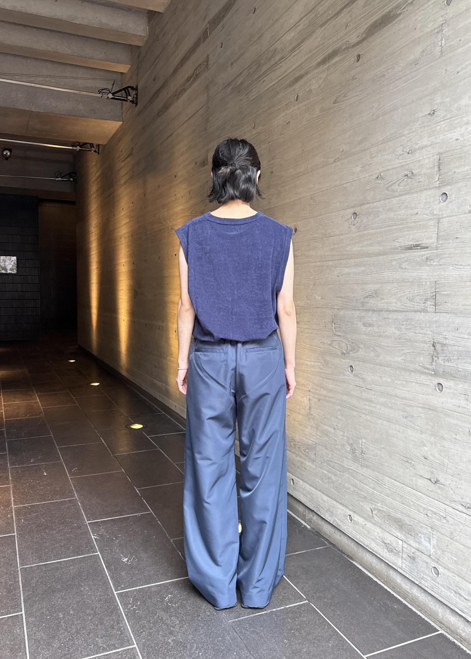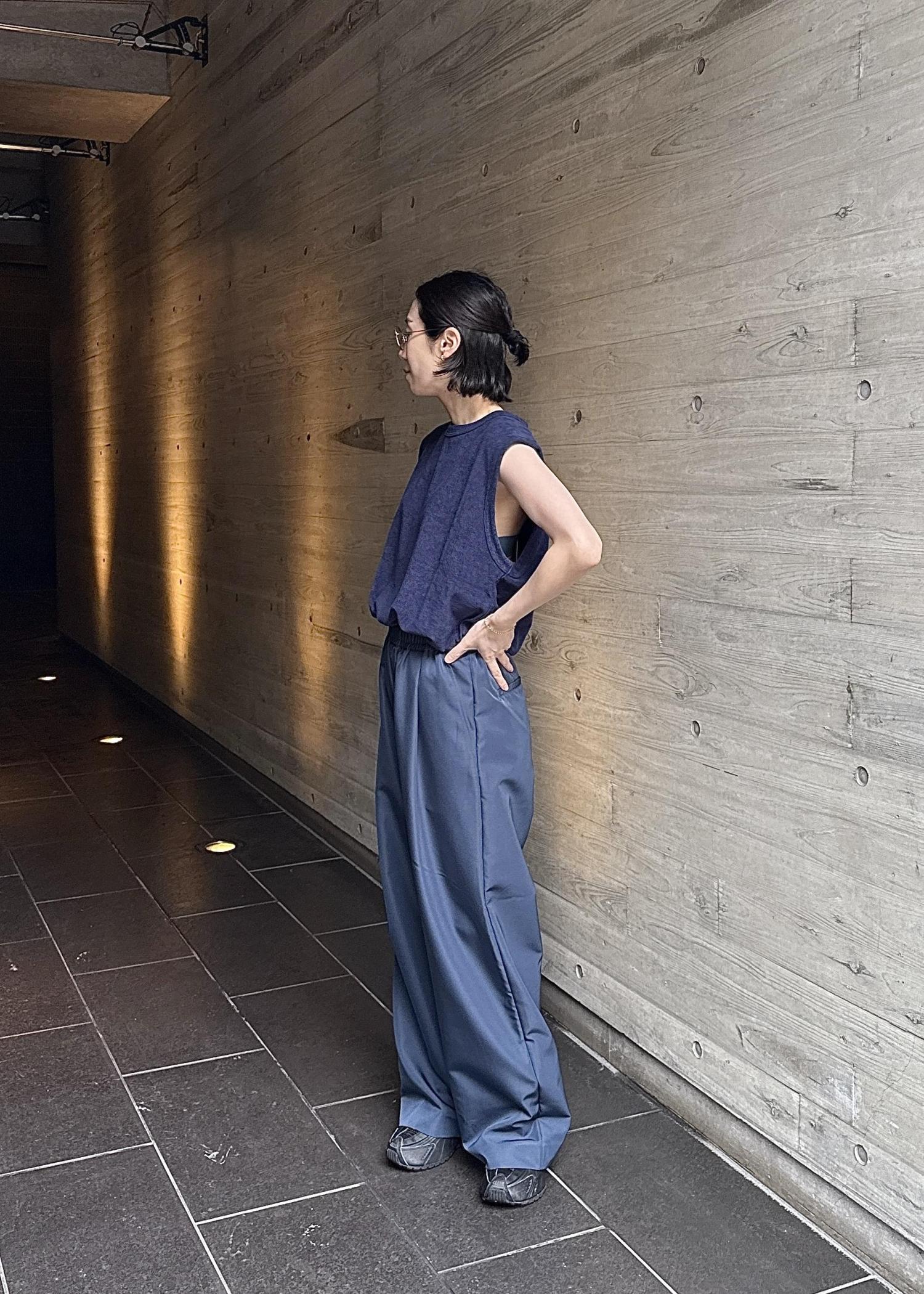 トップスのノースリーブはパイル地で柔らかく着心地抜群です!厚みはありますが、袖が大きく開いているため涼しげな印象に!
