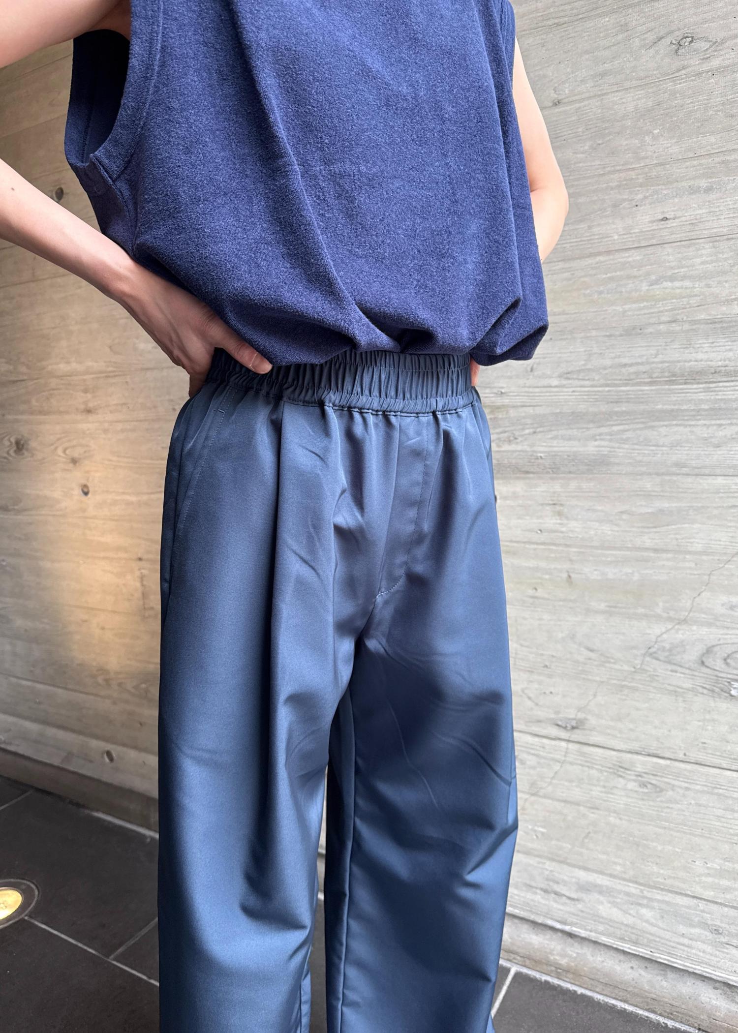 光沢感のあるストレートなパンツはウエストがゴムになっておりリラックスしたい日にもぴったり!