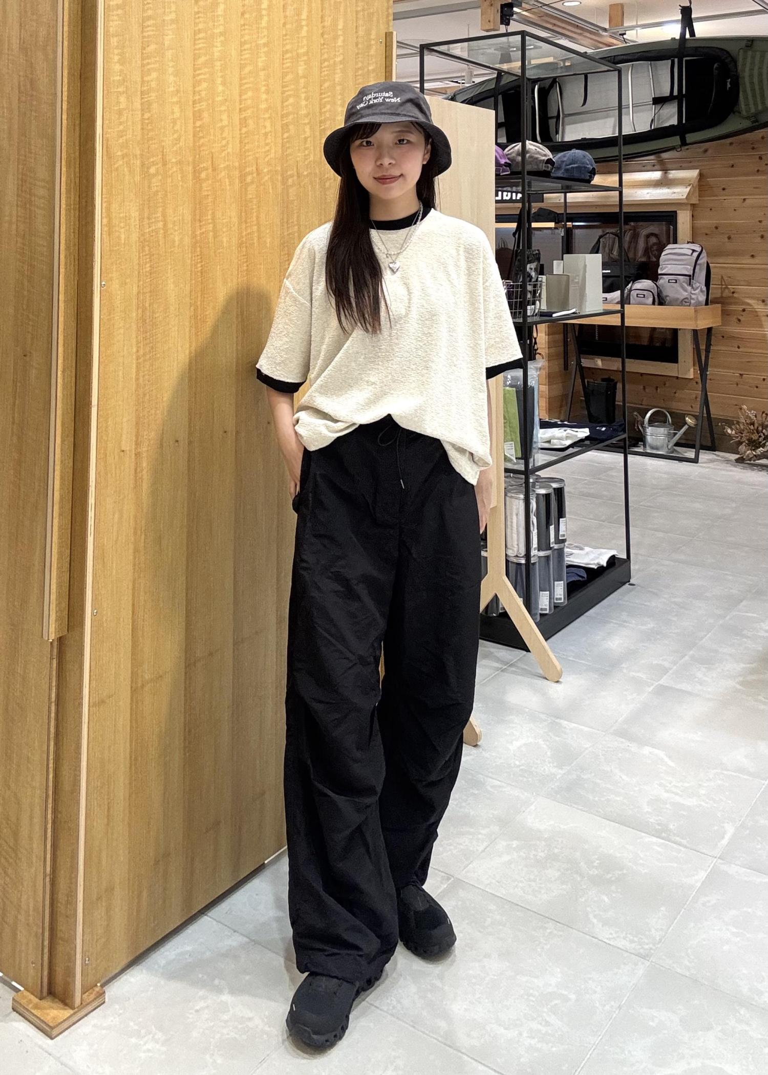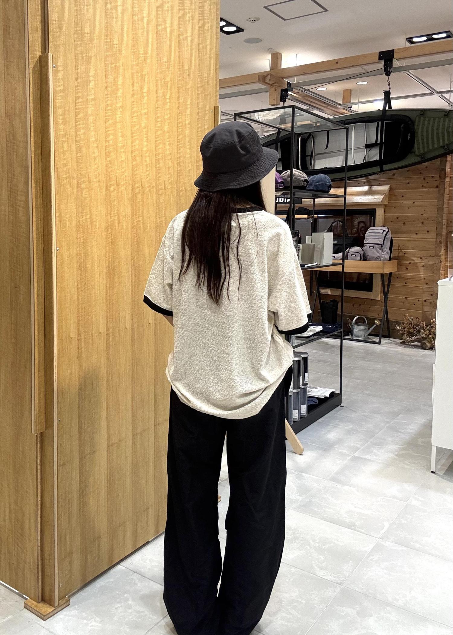 着用しているトップスは、リブの切り替えと配色が特徴的なリンガーデザインと程よくリラックスしたシルエットが1枚着はもちろんレイヤードに映えます!