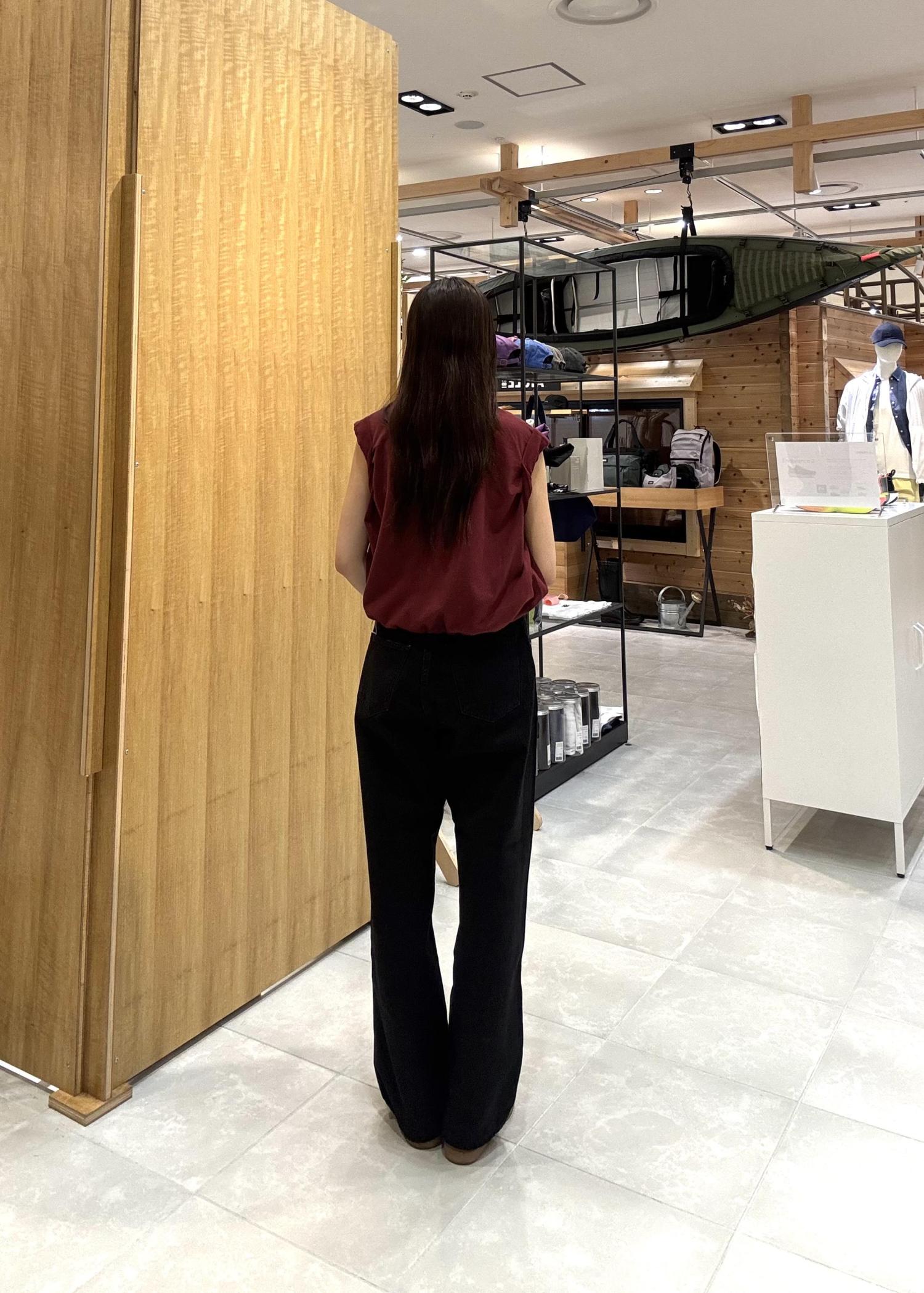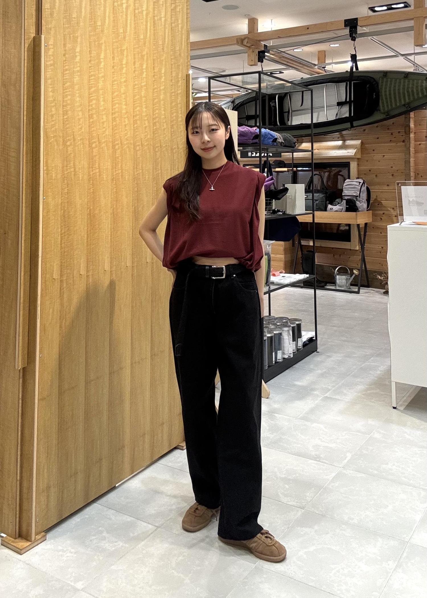 今回着用している袖ねじりが特徴的なノースリーブトップスは、裾のスピンドルで丈感を調整可能できます!!