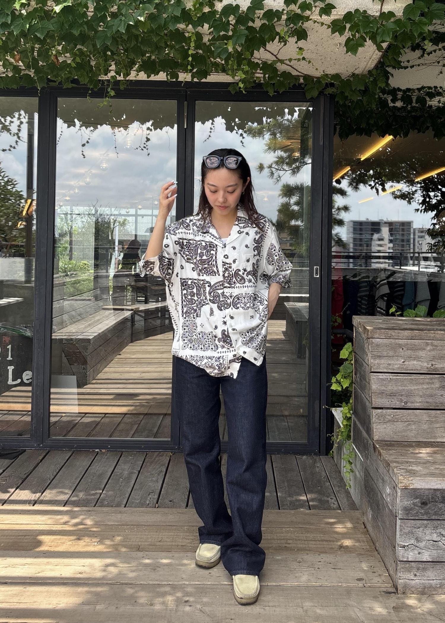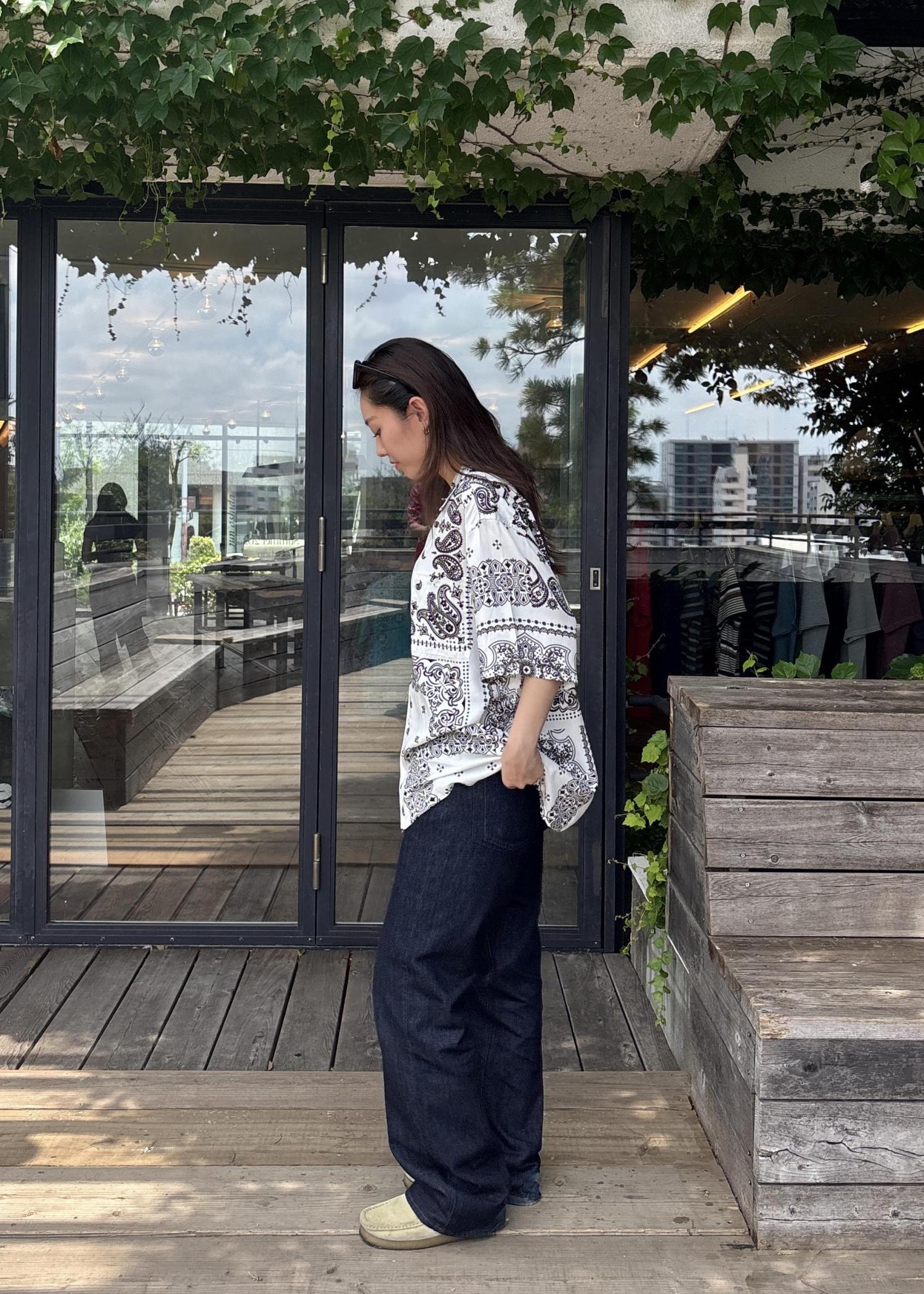 大胆なバンダナ柄シャツ×濃紺デニムで、リラックススタイル。