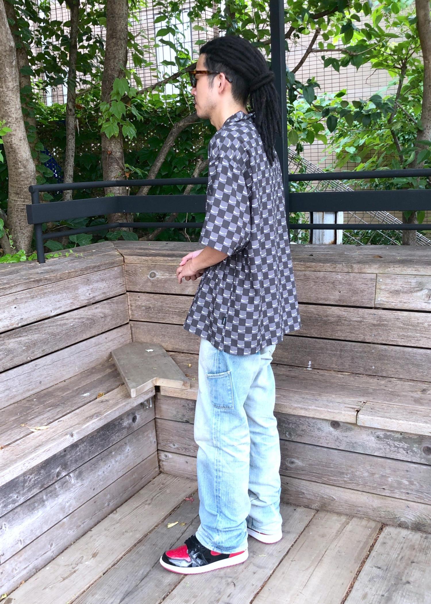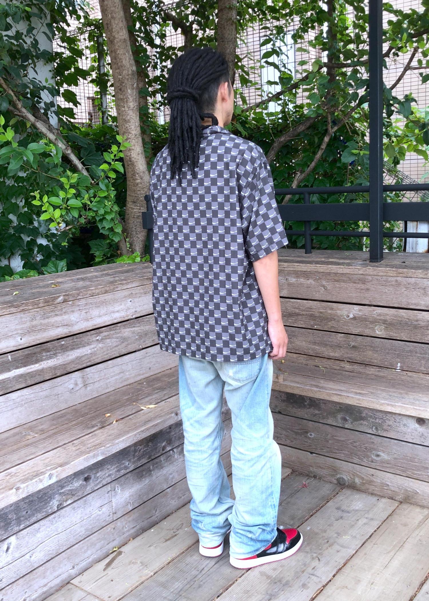 ブラックとグレーがメインの色で合わせやすい開襟シャツ。
