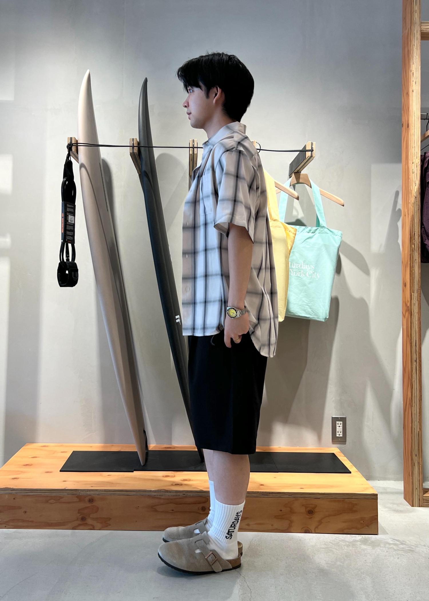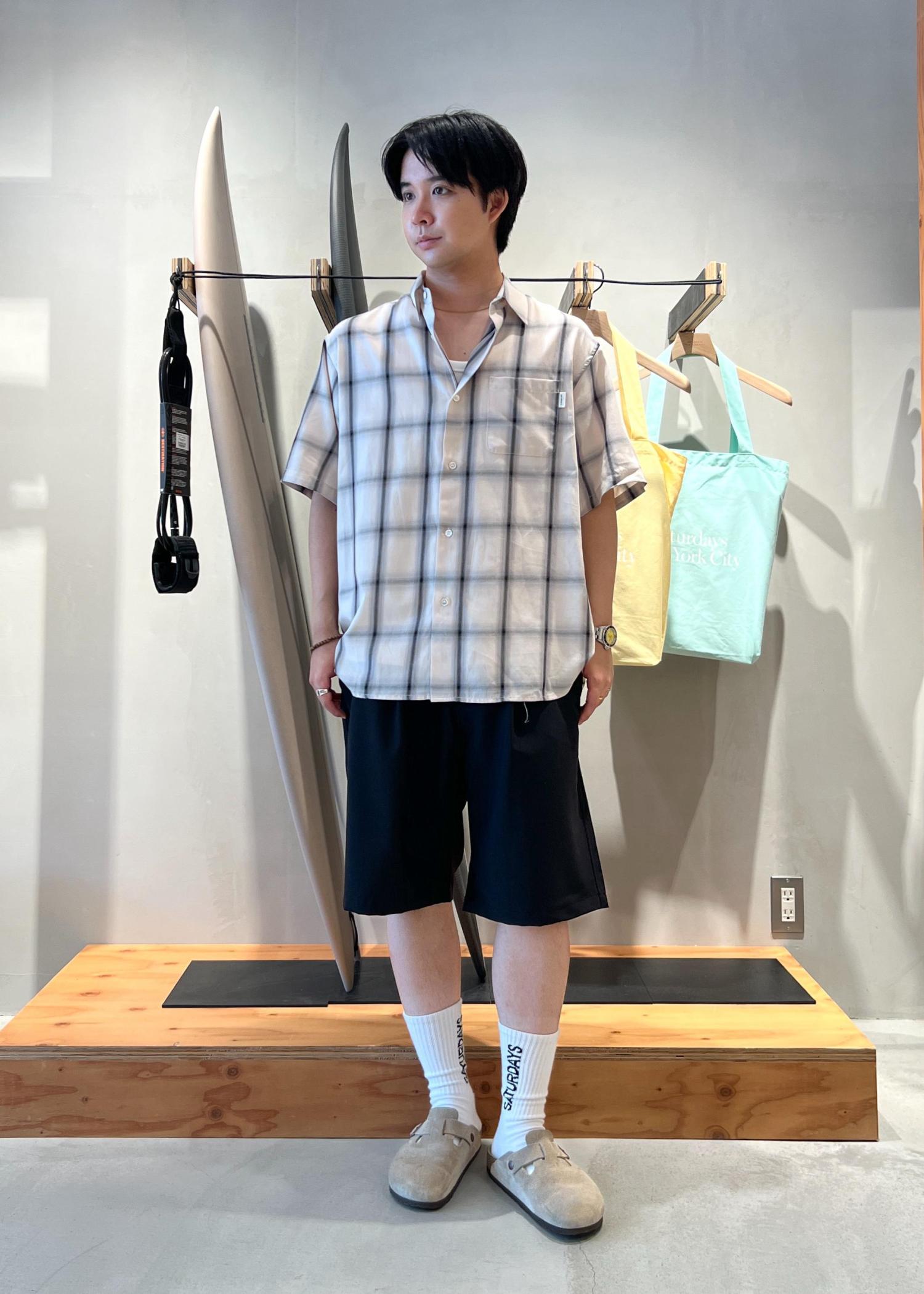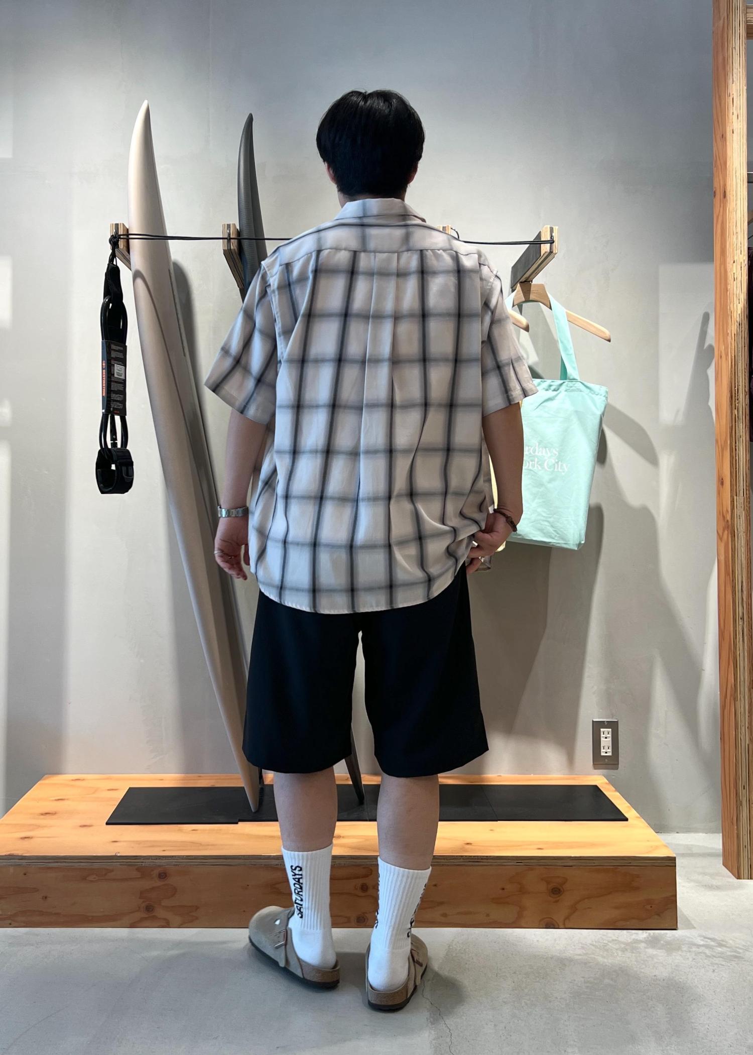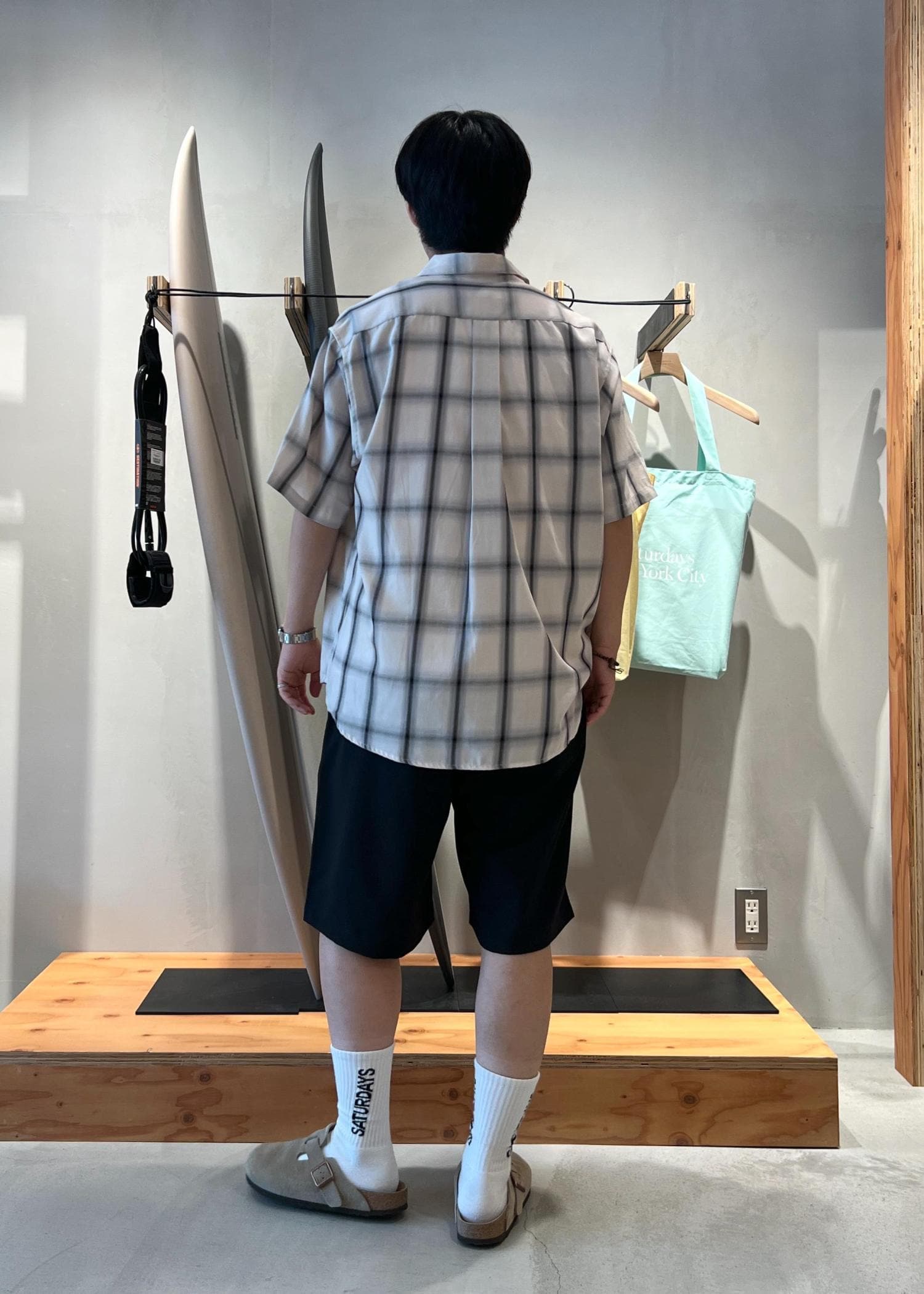 今回着用しておりますのは、先染めのオンブレチェック素材を使用したレギュラーカラーシャツと、ウールブレンドのTRを使用した大人のショートパンツです!