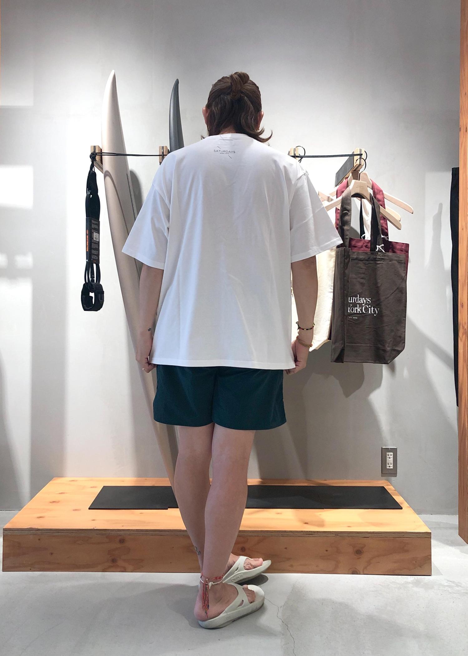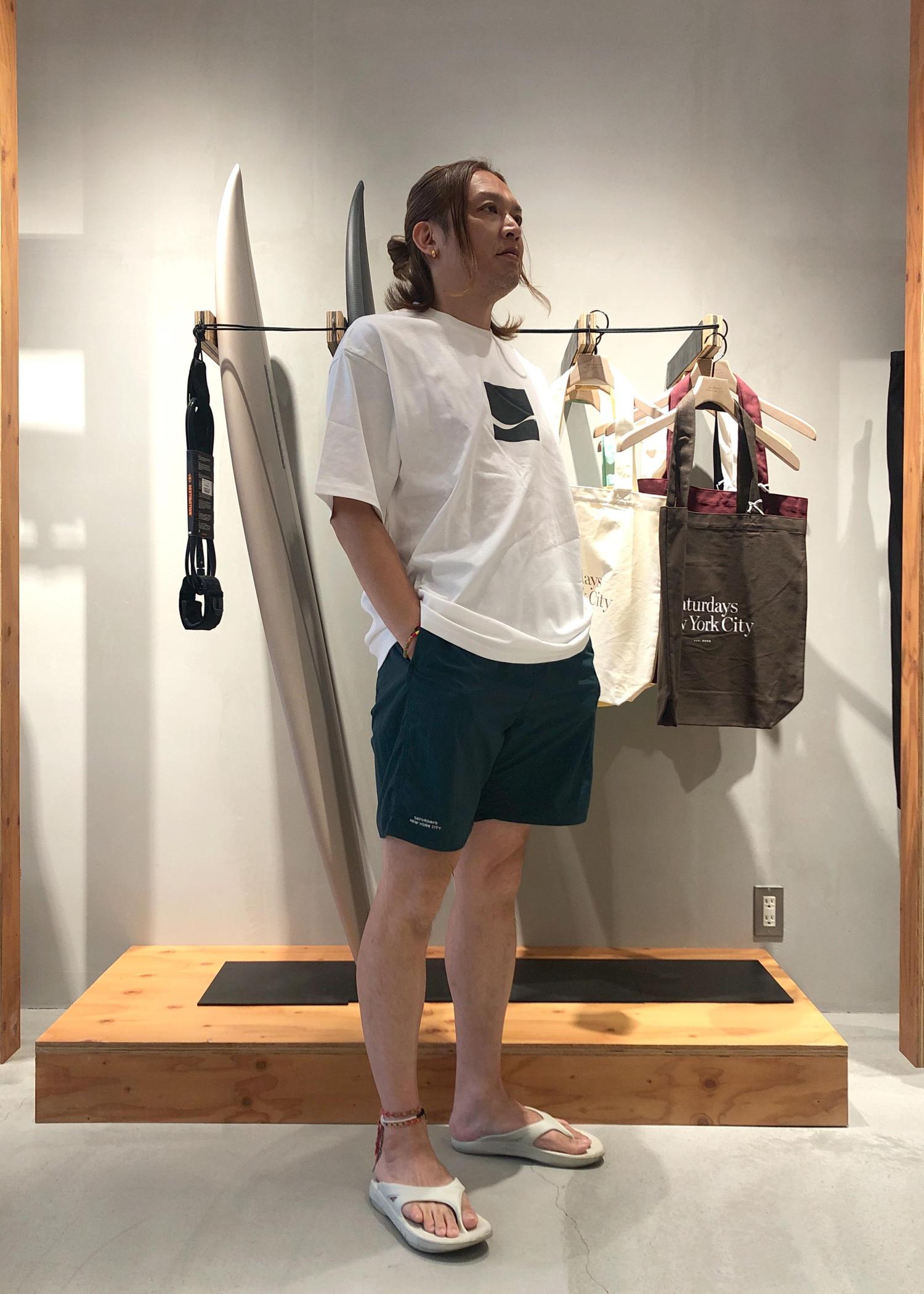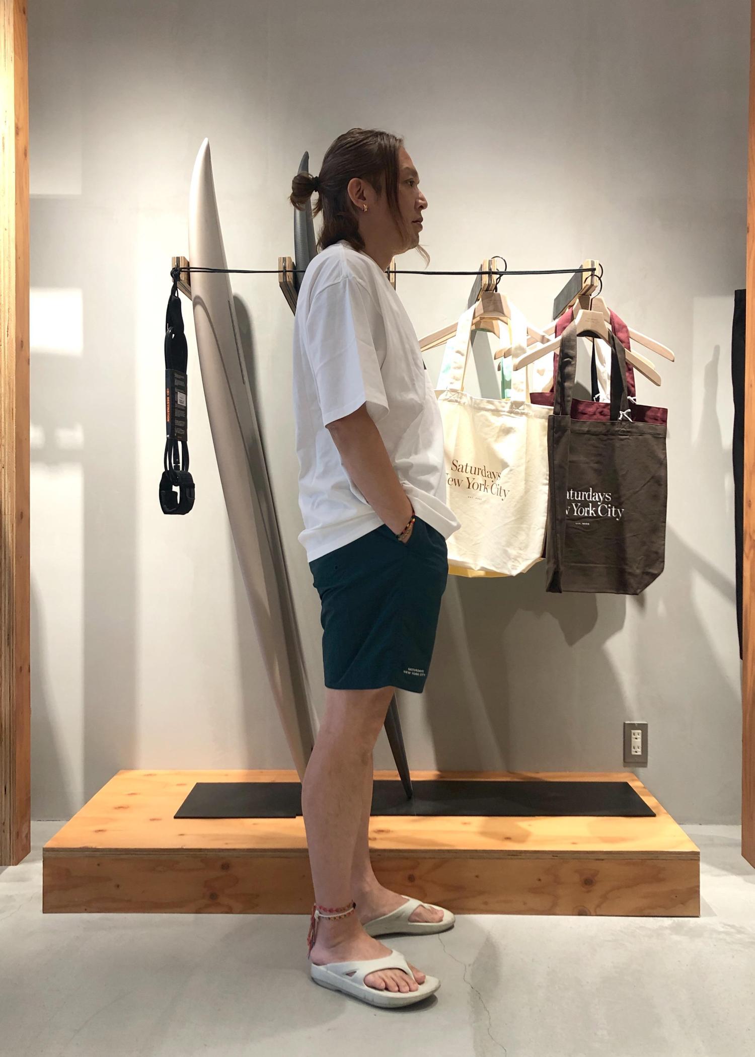 パンツは、サタデーズNYCの新定番カーゴスイムショーツです。左側にプリーツとマジックテープ付きフラップカーゴポケットをデザインに採用し、スイムウェアとしてはもちろんタウンユースでも着用できるアイテムです。