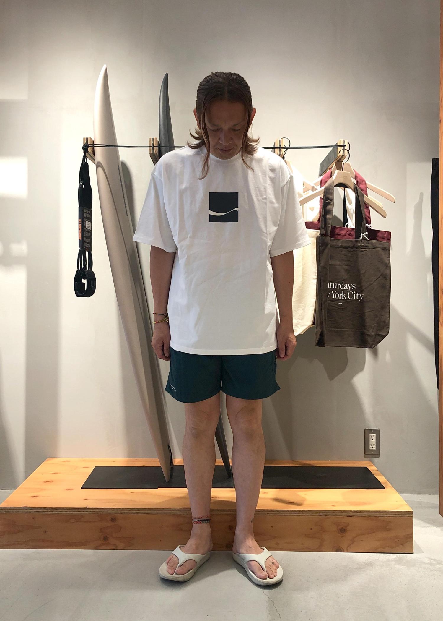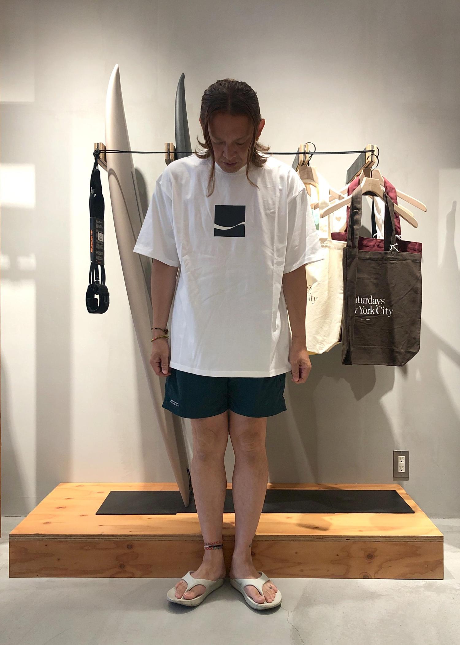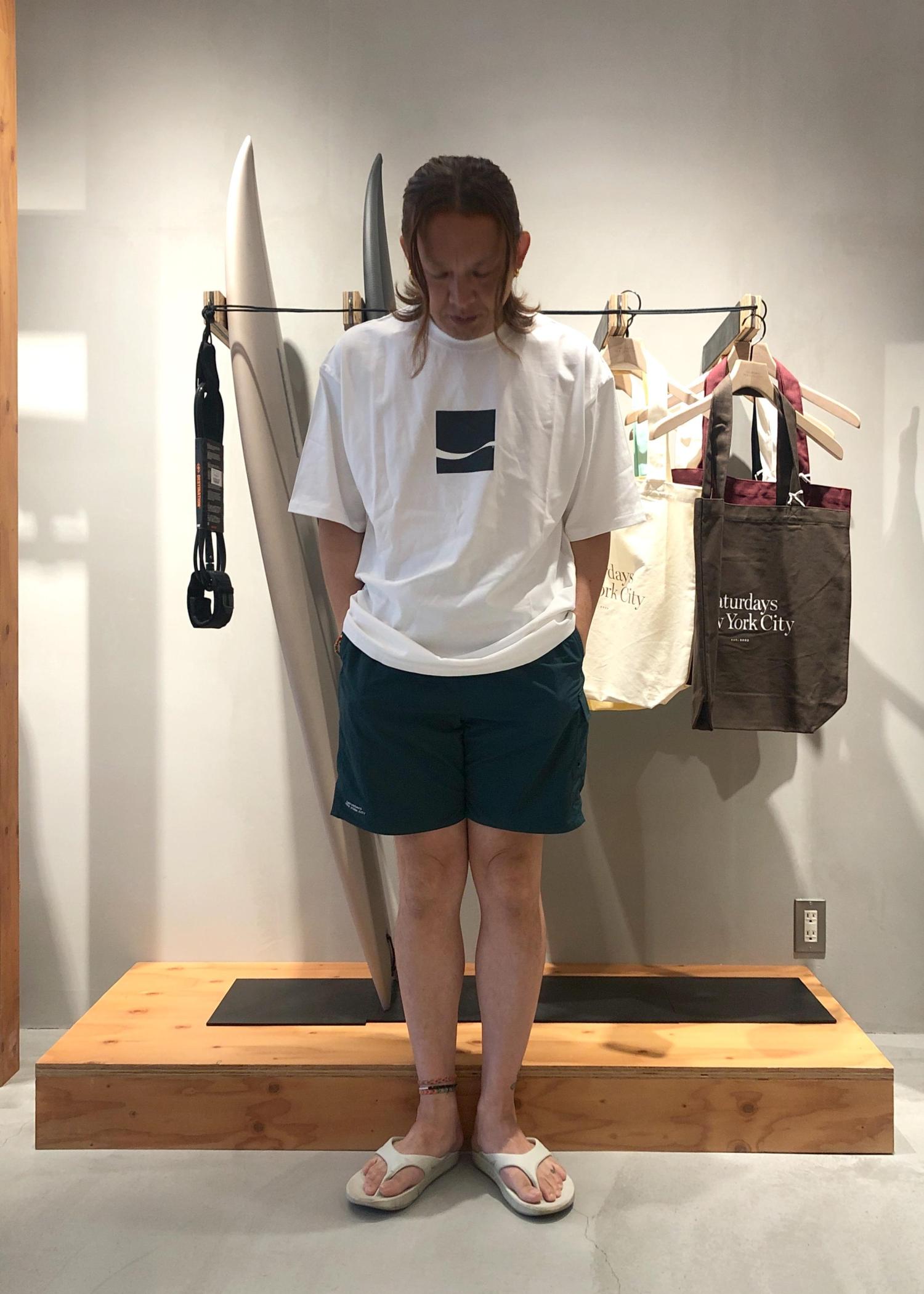 パンツは、サタデーズNYCの新定番カーゴスイムショーツです。左側にプリーツとマジックテープ付きフラップカーゴポケットをデザインに採用し、スイムウェアとしてはもちろんタウンユースでも着用できるアイテムです。