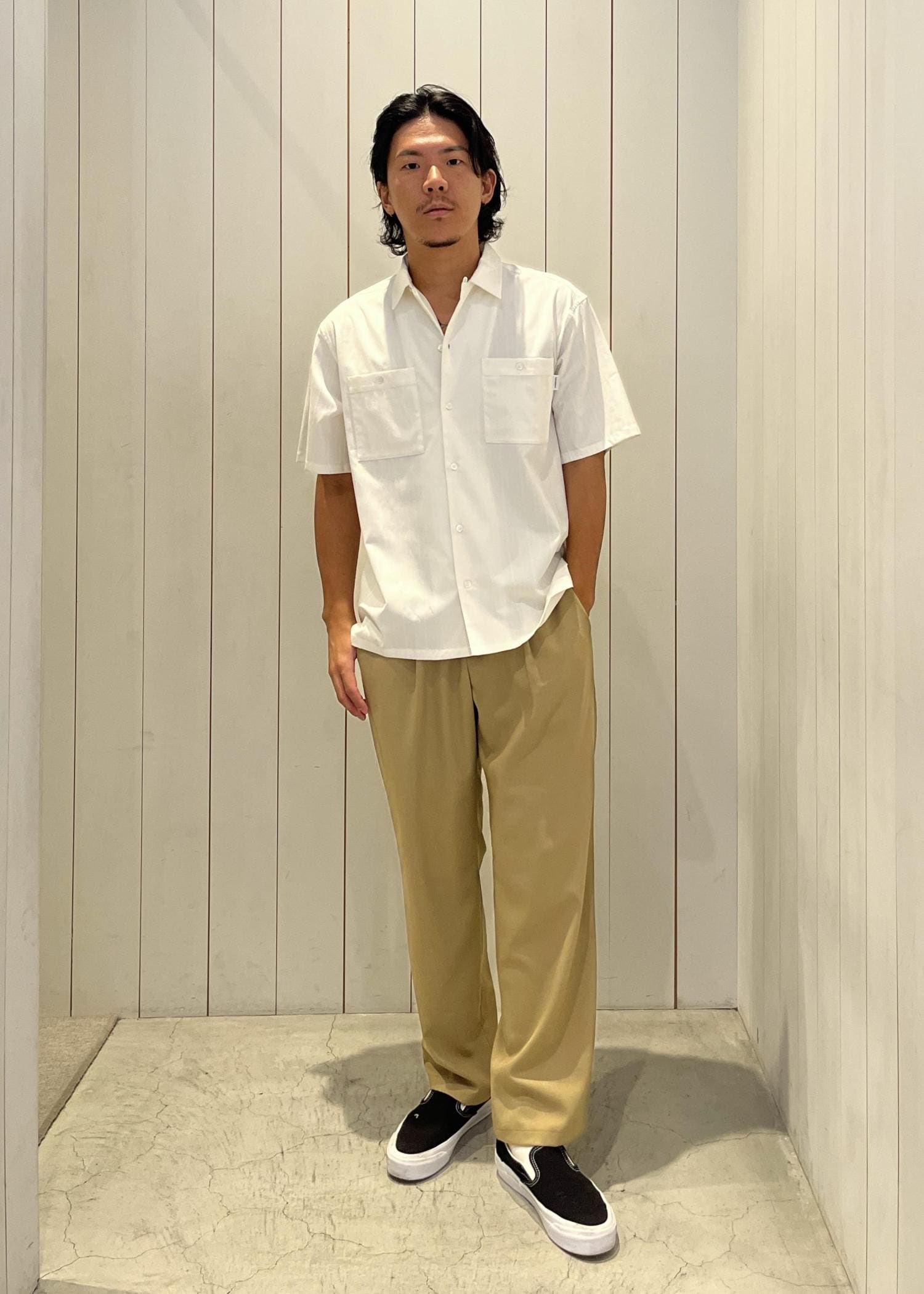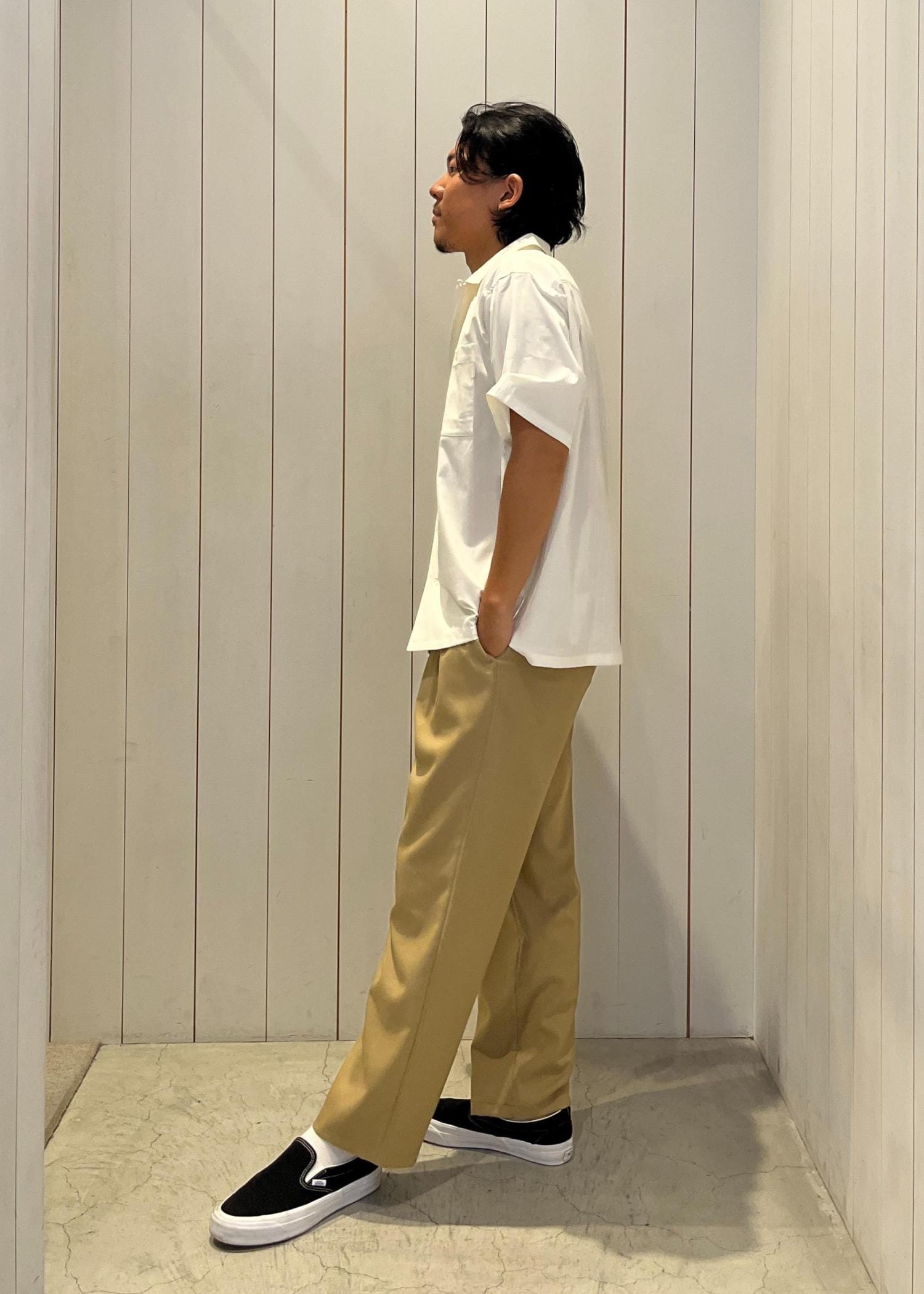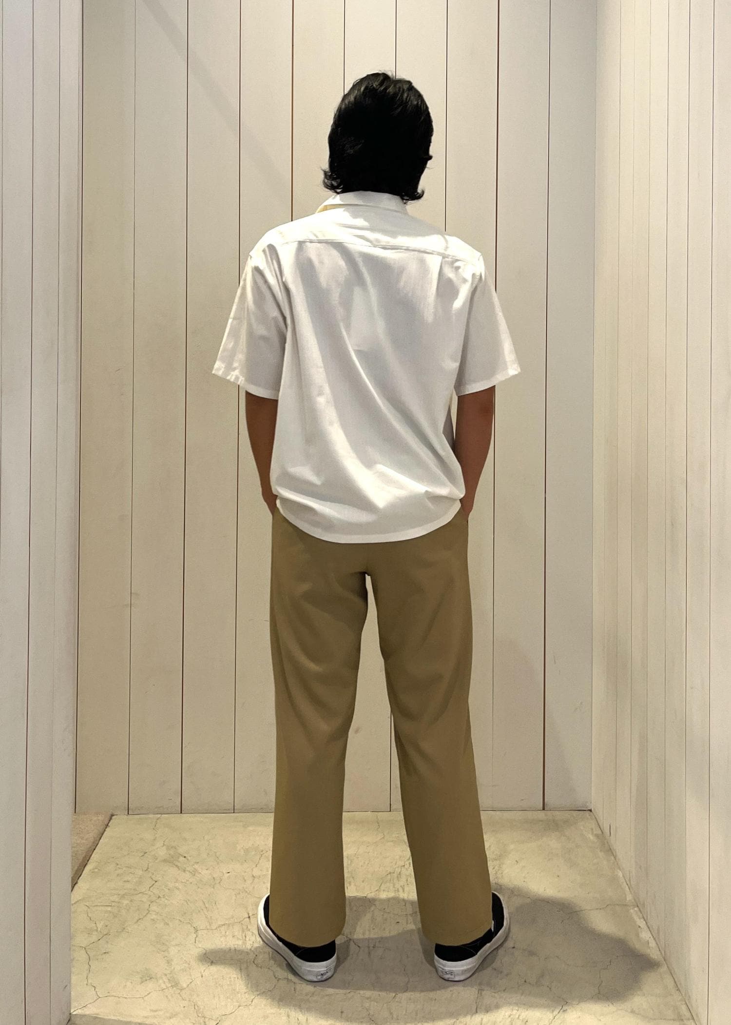 今回はホワイトシャツとベージュパンツの組み合わせで、